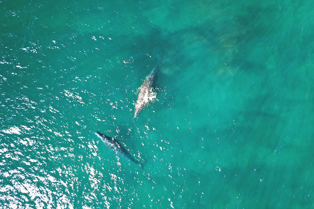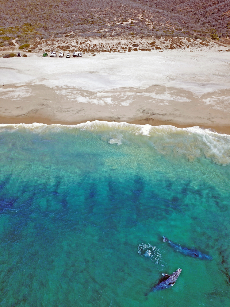 Nur einmal ist es fast windstill und angenehm warm. Diesen Tag suchen sich die Grauwale aus, um buchstäblich in unserer Bucht herumzuhängen und wir können die Tiere nicht nur ausgiebig vom Strand, sondern auch mit der Drohne von oben beobachten. So schön!