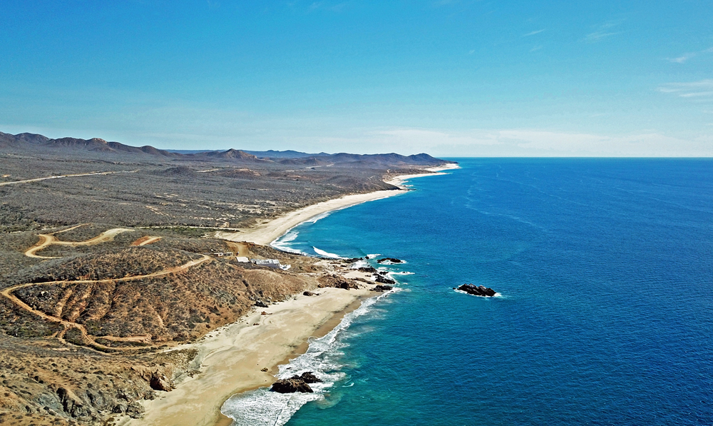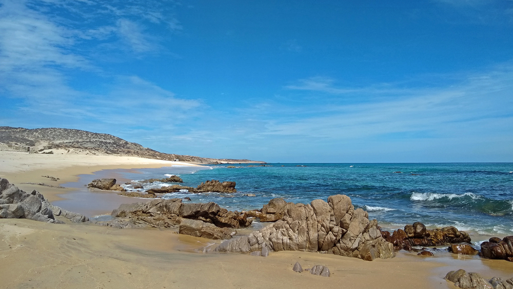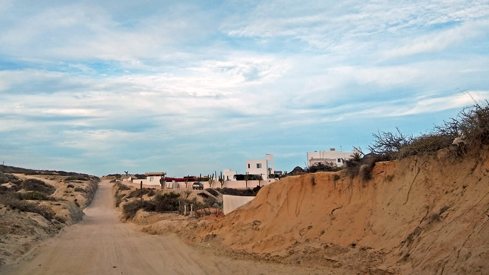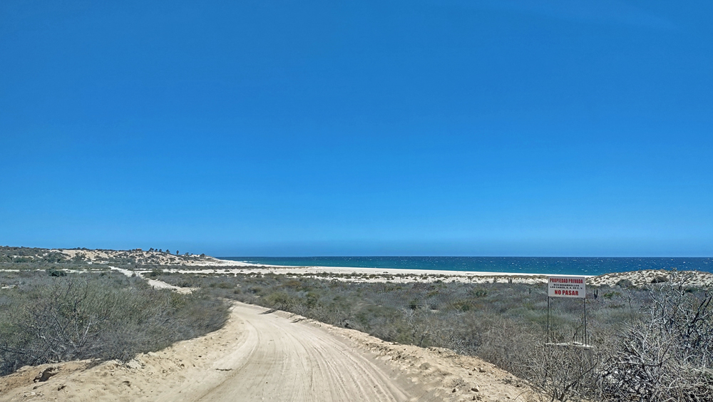 Die Strände an der Ostküste sind über den Camino Cabo Este zu erreichen, der bald nicht mehr geteert ist. Unsere Freunde wissen schon Bescheid, weshalb wir alle ordentlich Luft aus den Pneus lassen, bevor es auf die holprige Piste voller Waschbrett, Schlaglöcher und aus Dreck aufgeschütteter Topes geht – neben wilder Buschlandschaft hat es auch zahlreiche kleine Ansiedlungen mit wunderschönen (Snowbird-)Anwesen, die die Topes-Kultur offenbar übernommen haben… Allerdings sind viele Häuser und Grundstücke zu verkaufen und viele Schilder mit zukünftigen grossartigen Projekten sehen auch schon ziemlich alt aus (wir vermuten, dass neben Corona auch die schlechte Piste etwas damit zu tun haben könnte… Gleichzeitig hoffen wir, dass sie nie asphaltiert wird, denn dann ist es wohl bald vorbei mit den wilden Buchten…).