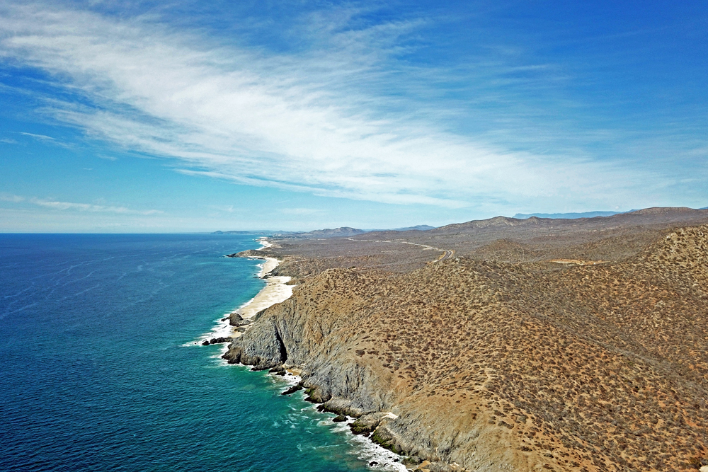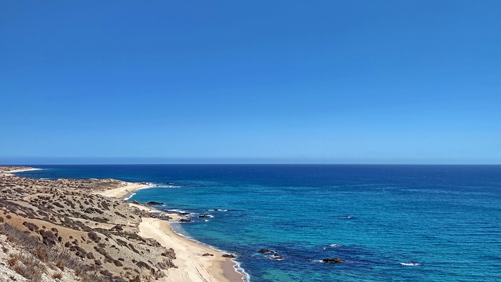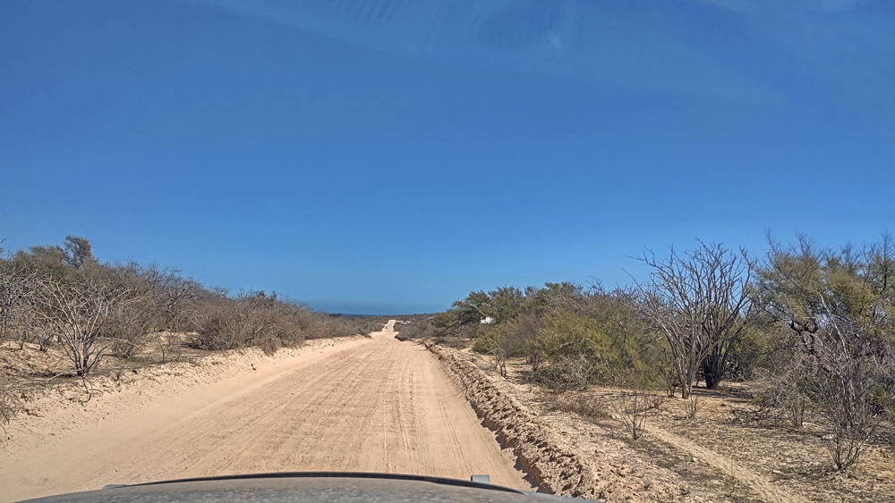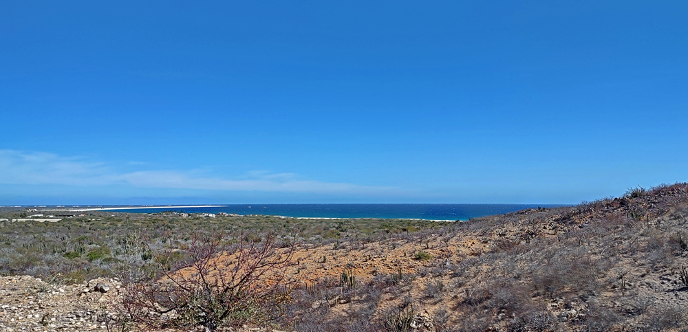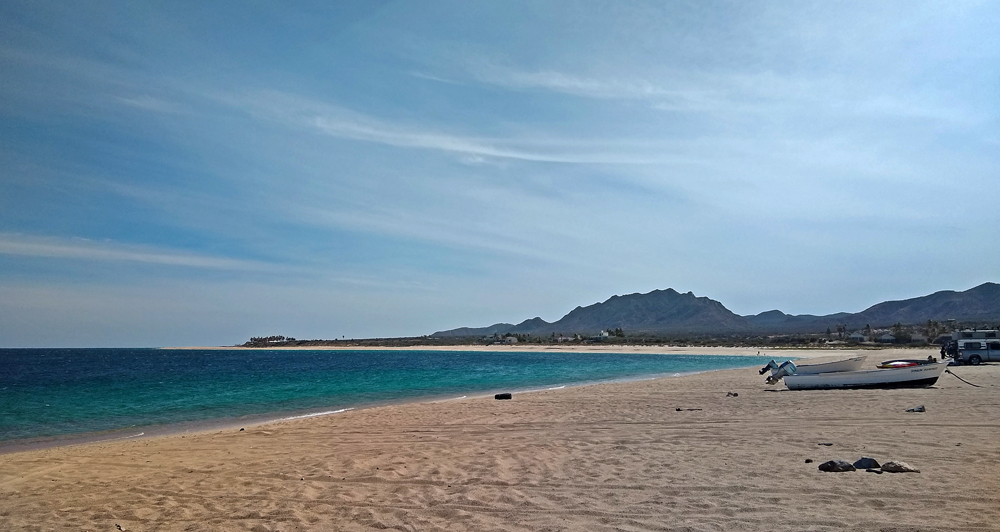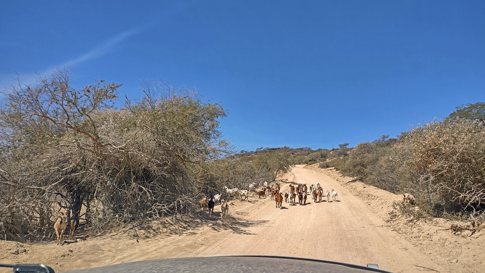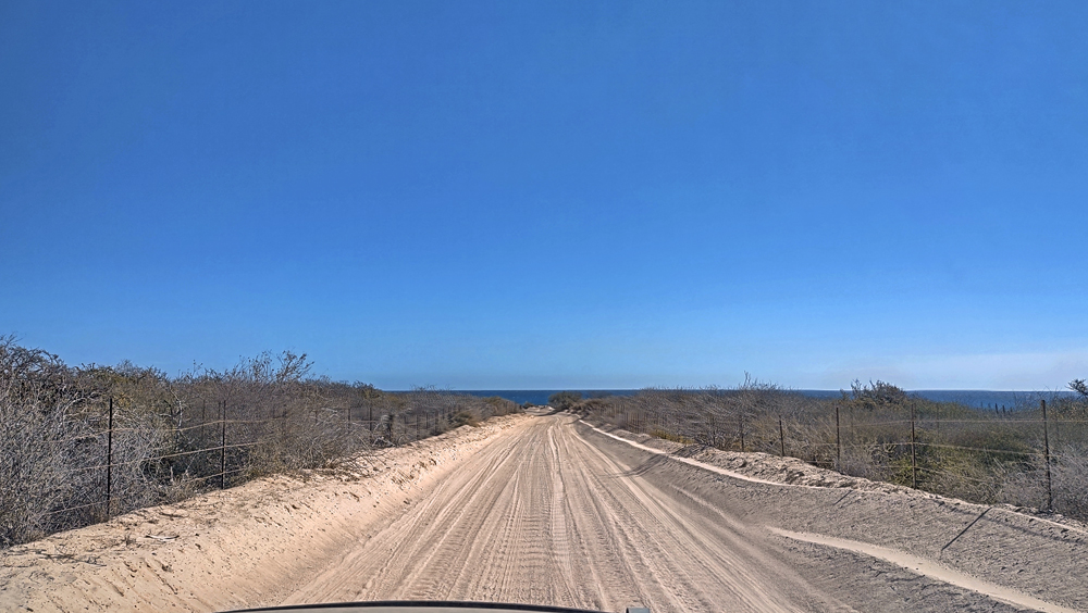 Auf rumpeligen, ungeteerten 18 km fahren wir weiter auf dem Camino Cabo Este, vorbei an Cabo Pulmo. Es hat hier auf der schmalen Strasse immer wieder mal Gegenverkehr und ein schneller Jeep verpasst uns nur um Millimeter – er hat wohl nicht bedacht, dass seine Oberkante, wenn er schräg auf dem hohlwegartig ansteigenden Strassenbord fährt, auf unsere Seite zu liegen kommt…