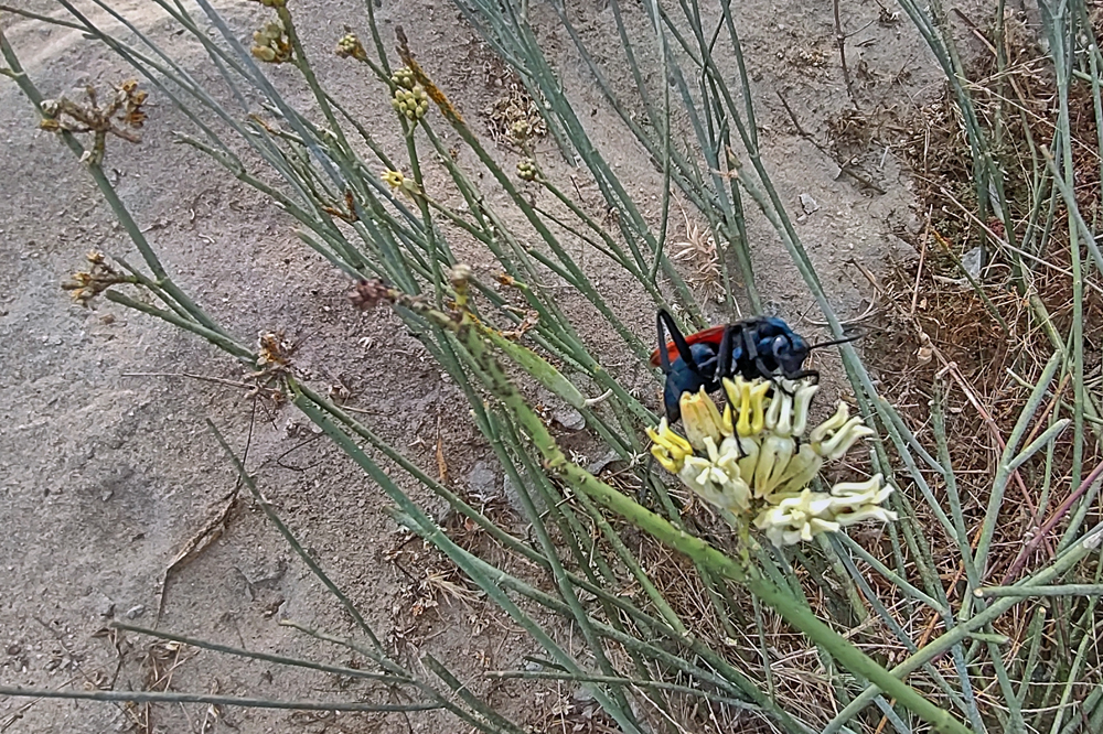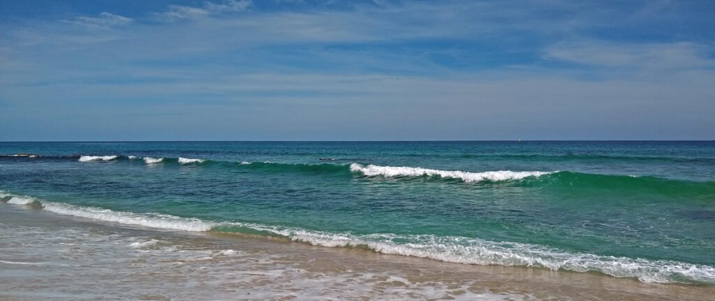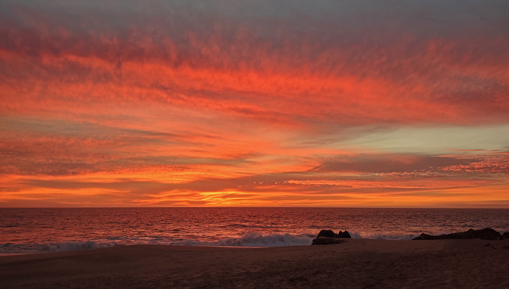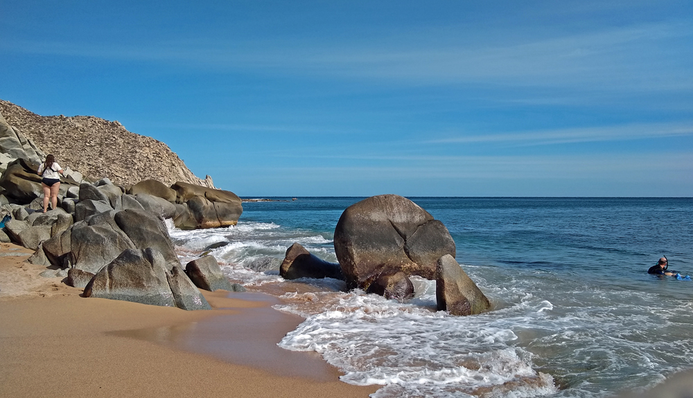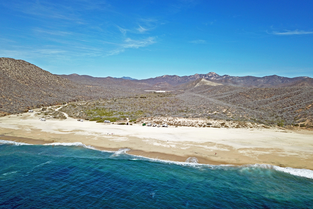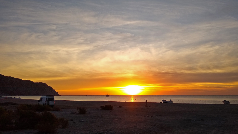 Da Sibylle und Hermann endgültig Richtung Norden wollen/müssen, fahren wir als nächstes zum Strand von Los Frailes. Hier ist viel mehr los. Die Vanlifer und Overlander sammeln sich im Arroyo und – je nach Fahrwerksausstattung – am Strand. Wir machen Strandspaziergänge und können Mobula-Rochen beobachten, die aus dem Wasser springen. So cool! Die Wale sind hier allerdings weiter weg.