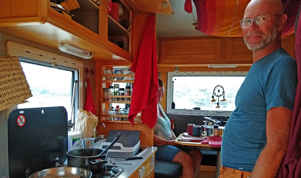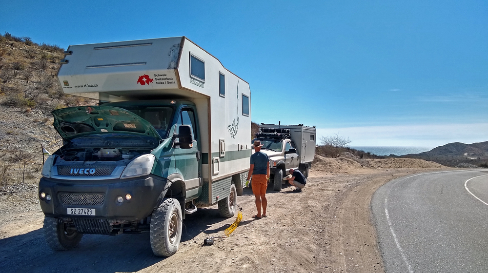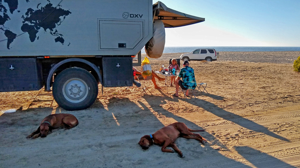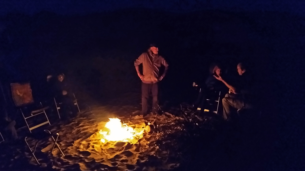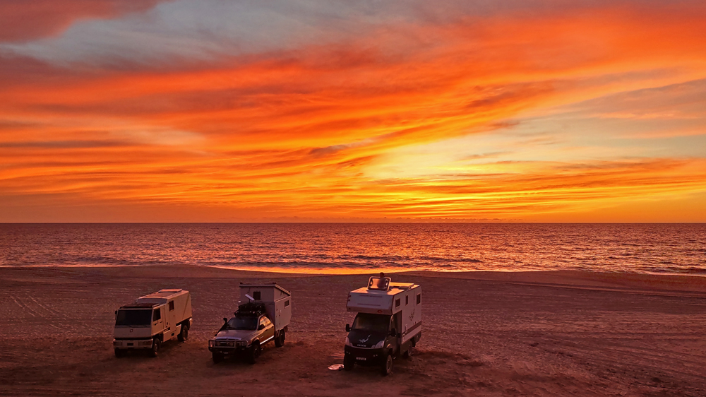 Als wir an der Playa Jimi ankommen, sind die Wale leider weg, dafür treffen wir nochmals auf Jürgen, diesmal mit seiner Frau Hilde, und lernen Manfred mit Rita und Actionmobil «Tonki» sowie Hans-Peter und Susanne mit «Henriette 2.0» und ihren beiden Rhodesian Ridgebacks Quappo und Frodo kennen. Mane ist der «weltbeste Feuermacher auf der Welt – und Umgebung!» und so geniessen wir fast jeden Abend das gemütliche Beisammensein am Lagerfeuer (ohne wäre es auch zu kalt…). Dieses Mal haben wir uns übrigens ans Ende des Arroyo gestellt, nahe beim Berg, so dass wir von den immer noch starken Nordwinden geschützt sind.
