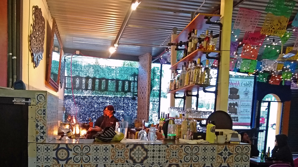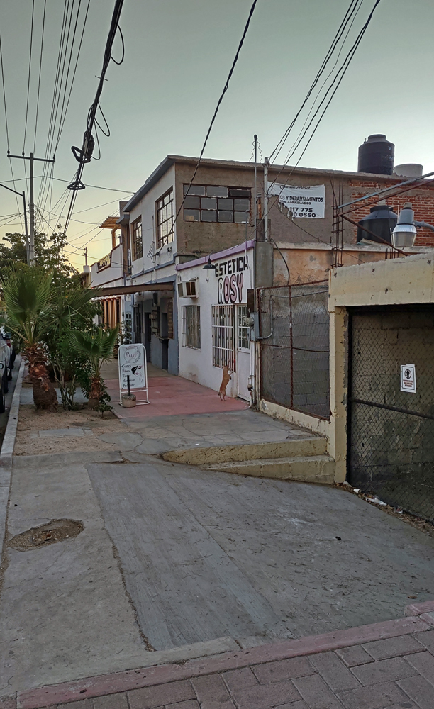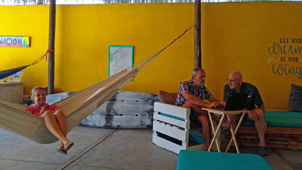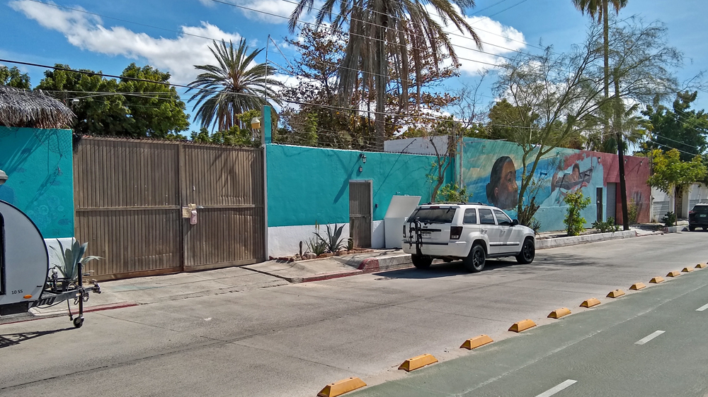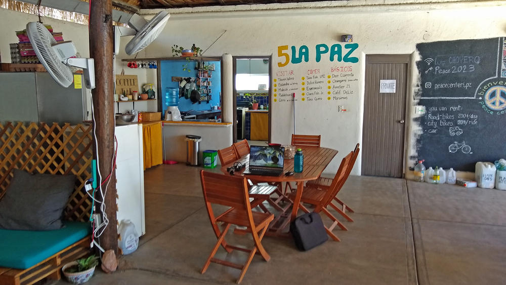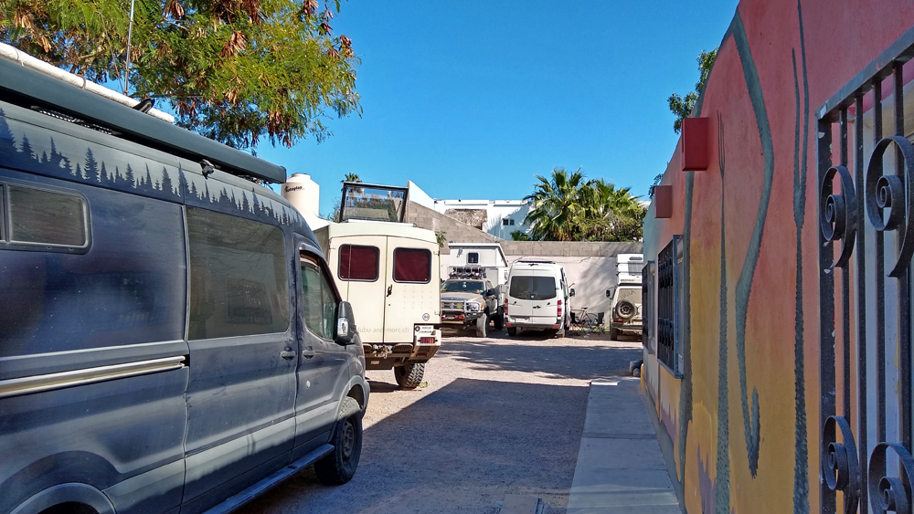 Claudia und Thomas haben uns geschrieben, dass es im Peace Center Platz für uns habe und uns einen Platz freigehalten. Es handelt sich dabei nicht um einen Campground im eigentlichen Sinne, sondern um einen grossen Innenhof, in dem offiziell wohl 5, bei maximaler Stapelung auch 10 nicht zu grosse Fahrzeuge Platz haben. Wenn dann einer aus der hinteren Ecke abfahren möchte, müssen die Vorderen rausfahren – das fördert die Kommunikation unter Nachbarn 😉. Ausserdem gibt es einige Zimmer zum Mieten. Die Gastgeber Ana und Pavel schlafen mit ihrem Kind in der ehemaligen Garage und haben alles liebevollst für die Gäste hergerichtet: alles ist hübsch dekoriert, bemalt und bepflanzt. Neben (heissen) Duschen und WCs gibt es einen schönen, gedeckten Platz mit einigen Tischen und einer Hängematte zum Arbeiten und Ausspannen sowie die grosse Familienküche, die mitbenutzt werden darf. Das Beste aber ist die Lage: zu Fuss ist man in einer Viertelstunde an der Marina und am Beginn des 3.6 km langen Malecón und in etwa 20 Minuten im Stadtzentrum. Und mit 350 Pesos/Nacht ist der Platz nur wenig teurer als das Dry Camping im Campestre Maranatha weit ausserhalb.