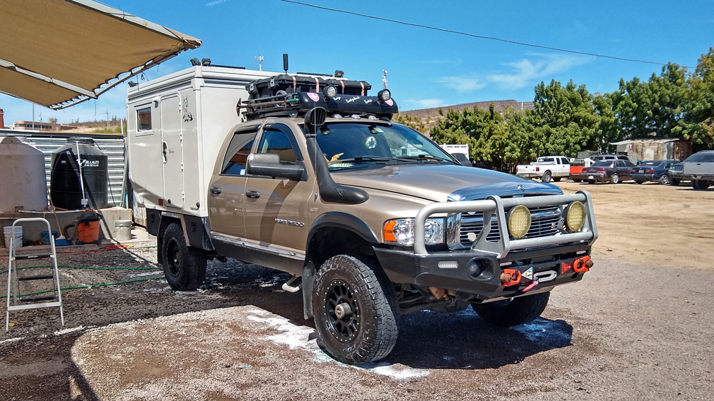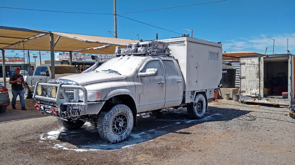Als wir den Playa Jimi Richtung La Paz verlassen, zeigt unser Thermometer im Landesinneren  Temperaturen von bis zu 33 °C! Die hohen Temperaturen sind nicht ganz ideal, um Auto zu waschen, aber nach der langen Zeit am Meer hat unser Diheime dringend eine Kur nötig. In einem Vorort können wir unser Auto in einem «open air car wash» verwöhnen lassen. Für 250 Pesos (umgerechnet rund 13 CHF) wird unser Auto von zwei Mexikanern auf einem Kiesplatz fast eine Stunde lang geschrubbt, abgewaschen, eingeseift, gespühlt und von Hand abgeledert. Sogar die Reifen werden geschwärzt! So geglänzt hat unser Gefährt schon lange nicht mehr!