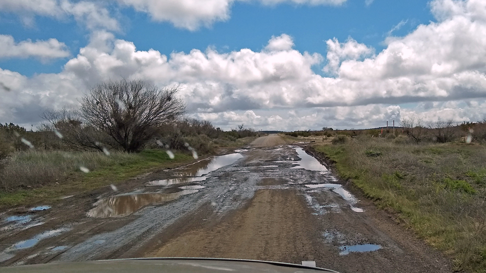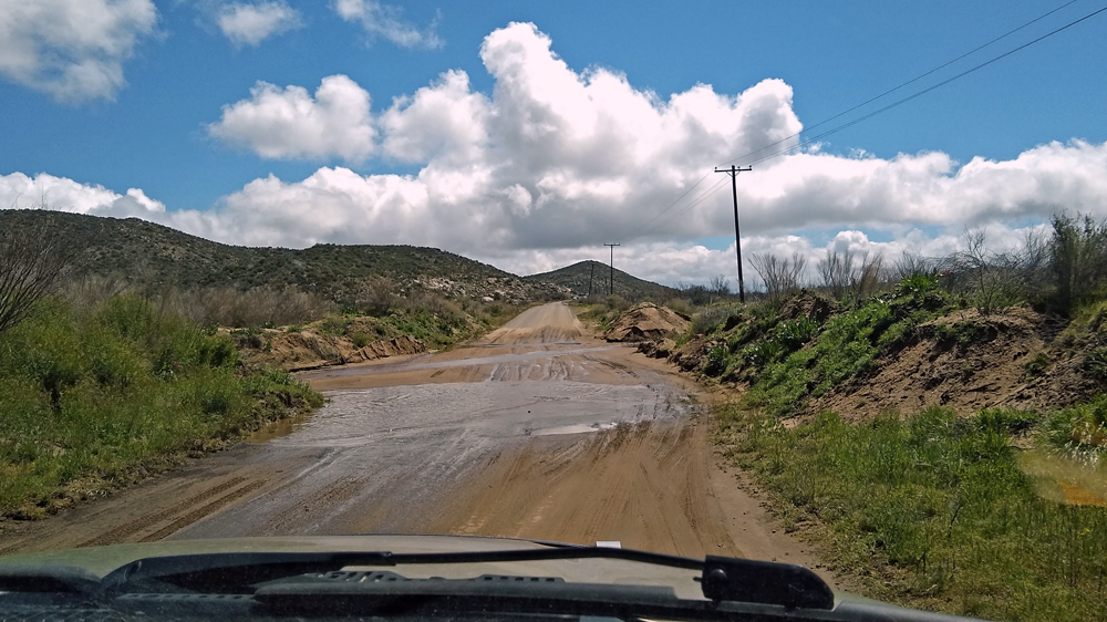 Die Fahrt von San Quintín nach La Bufadora ist dann sehr unschön: die Strassen durch die zahlreichen landwirtschaftlichen Ansiedlungen (hier ist das Gegend mit den vielen Gewächshäusern, wo u.a. all die Beeren herkommen) sind komplett verschlammt und die Strasse selbst ist an einigen Stellen überschwemmt und teilweise verschüttet. Ozy muss sich sehr konzentrieren, denn hinter jeder Ecke könnten Felsbrocken oder Strassenarbeiter, die diese wegzuräumen versuchen, auftauchen.
