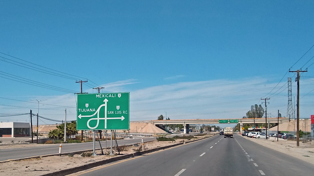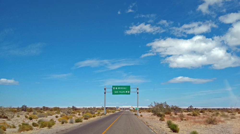 Nachdem das geschafft ist, geht es ins Gebirge, Richtung San Felípe (wir wollen nach Yuma zu unserem Freund Bill und die Grenze deshalb wieder in Mexicali East überqueren). Die MEX-3 führt zwischen der Sierra de Juárez im Norden und der Sierra de San Pedro Mártir im Süden durch die beiden Hochtäler Valle des Ojos Negros und Valle de la Trinidad. Die Strecke ist landschaftlich sehr schön und abwechslungsreich, aber bald stossen wir auf das nächste Hindernis: 4 Schwertransporte, die aufgrund der engen, kurvigen Strecke fast nicht zu überholen sind… Irgendwann ist aber auch das geschafft und wir fahren auf der schlechter werdenden Strasse, immer auf Schlaglöcher achtend, bis zur Ostküste. War es auf der anderen Seite und im Gebirge noch 8 Grad, lacht hier die Sonne und das Thermomenter zeigt freundliche 21 °C. Juhu!