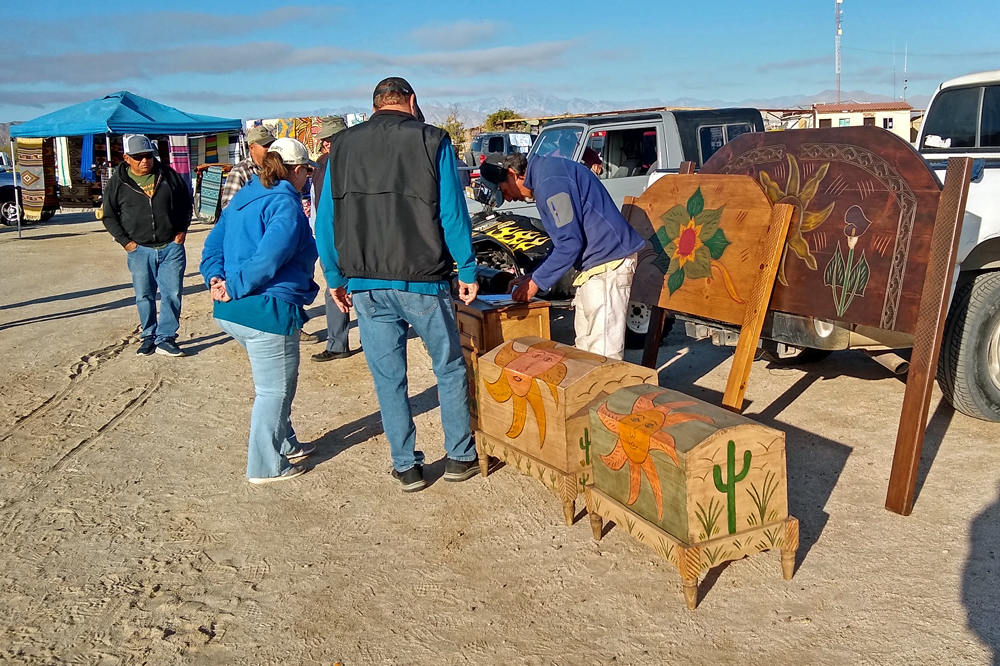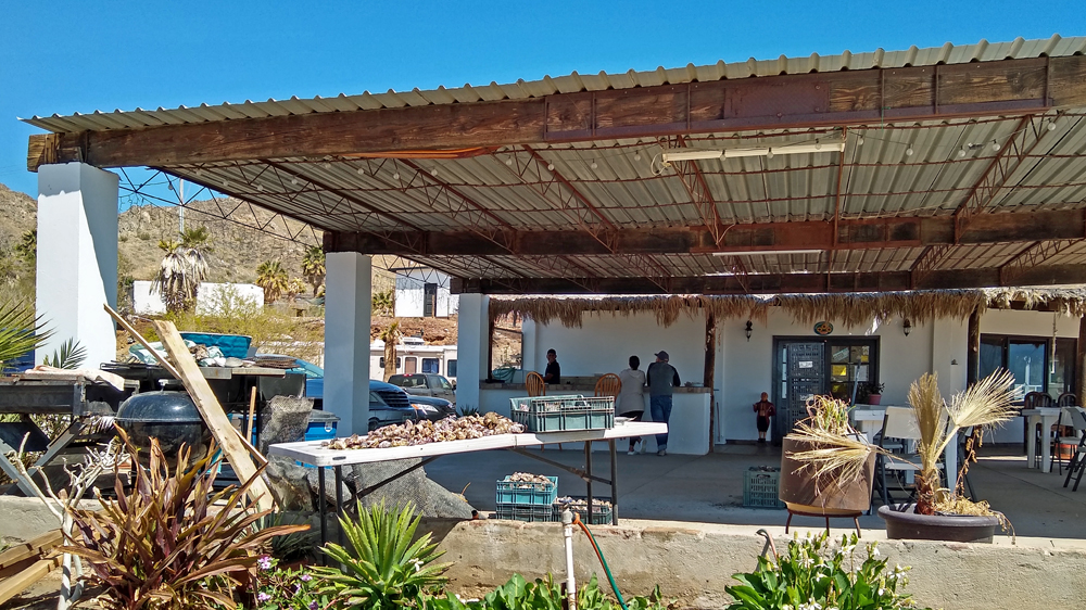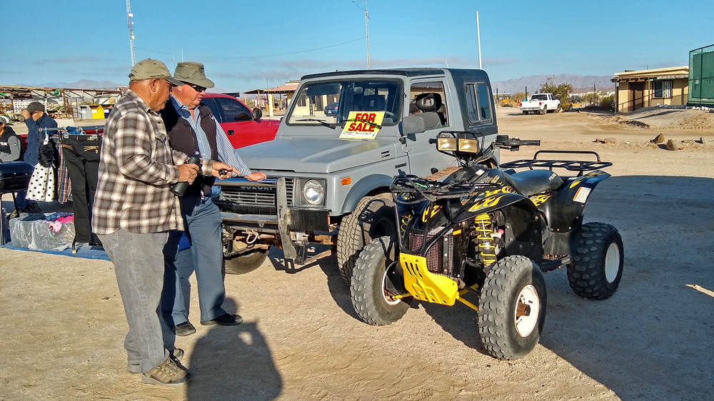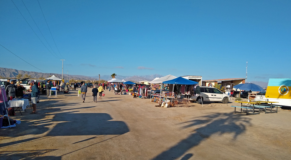 In San Felípe übernachten wir wieder im Campo Turistico # 1, wo wir das nette Deutsche Paar Allie und Volker mit Hund Bella sowie die Deutsch-Kanadier Ruth und Hans kennenlernen, die uns am Abend in ihr schönes, grosszügiges Wohnmobil einladen. Sie kommen seit vielen Jahren jeden Winter hierher und kennen sich bestens aus. Sie nehmen mich mit zum Flohmarkt auf der Rancho El Dorado, wo man von alten Büchern bis zu gebrauchten Autos alles kaufen kann. Es gibt auch einige kunsthandwerkliche Stände sowie Gemüse, Meeresfrüchte und Tamales. Als ich erwähne, dass ich noch Fisch kaufen möchte, sagt mir Hans, dass er mir ein schönes Filet schenken würde – er kennt einige Fischer, die ihm jeweils besonders schmackhafte Arten anbieten. – Der Fisch ist herrlich! (Er tröstet mich auch darüber hinweg, dass wir die Austern verpassen – das Restaurant hat nur von Donnerstag bis Sonntag geöffnet…).