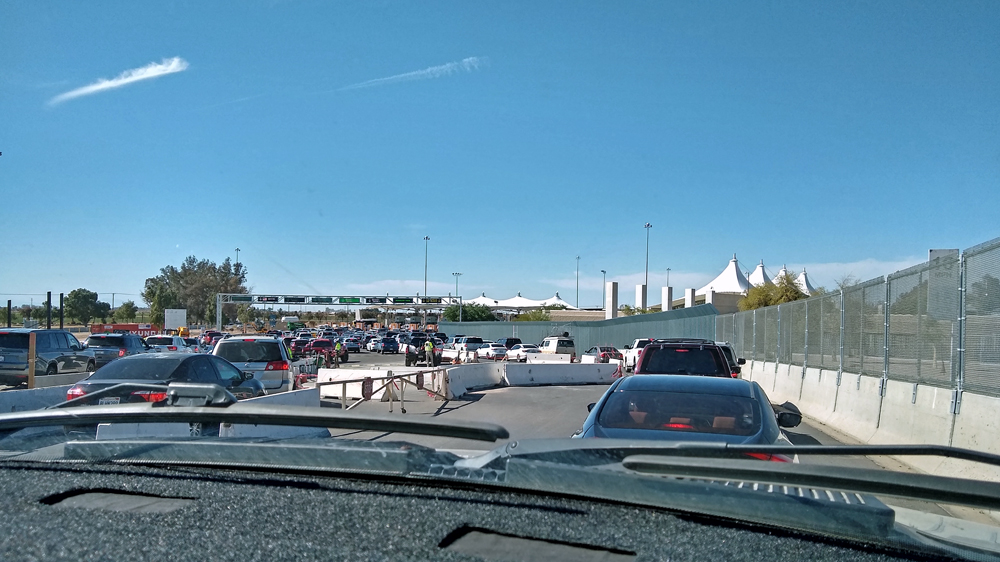 Nach fünf Nächten brechen wir auf Richtung Grenze. Die Fahrt geht flott voran, bis wir in Mexicali («East») zur Grenze kommen. Hier stehen die Autos schon bis auf die Hauptstrasse. Annens hatten uns gesagt, dass man auf die andere Seite zum Immigration Office fahren und dort parken könne. Allerdings hatten sie keine so lange Schlange und konnten das sozusagen direkt erledigen. Wir können dank Unterstützung eines Beamten, der ein paar orange «Töggel» umstellt, zwar auch auf die andere Seite hinüberfahren, parken und – problemlos – unser FMM abgeben, doch als wir am selben Ort wieder zurück wollen, heisst es «no» – wir müssen uns nochmals hinten anstellen! – Wenigstens haben wir jetzt gesehen, dass man auf der anderen Strasse direkt zum Gebäude fahren könnte, so dass wir uns das nächste Mal das erste Anstehen sparen können… Zum Glück ist der Beginn der Schlange jetzt nicht mehr so lange wie vorher, aber der Rest scheint uns unendlich. Alles in allem verbringen wir über drei Stunden an der Grenze. Zum Glück ist wenigstens der junge Officer sehr nett und speditiv und bald heisst es «Welcome [back] to California».