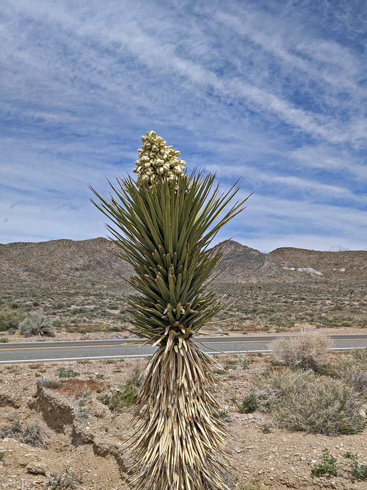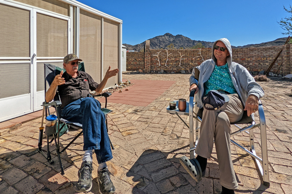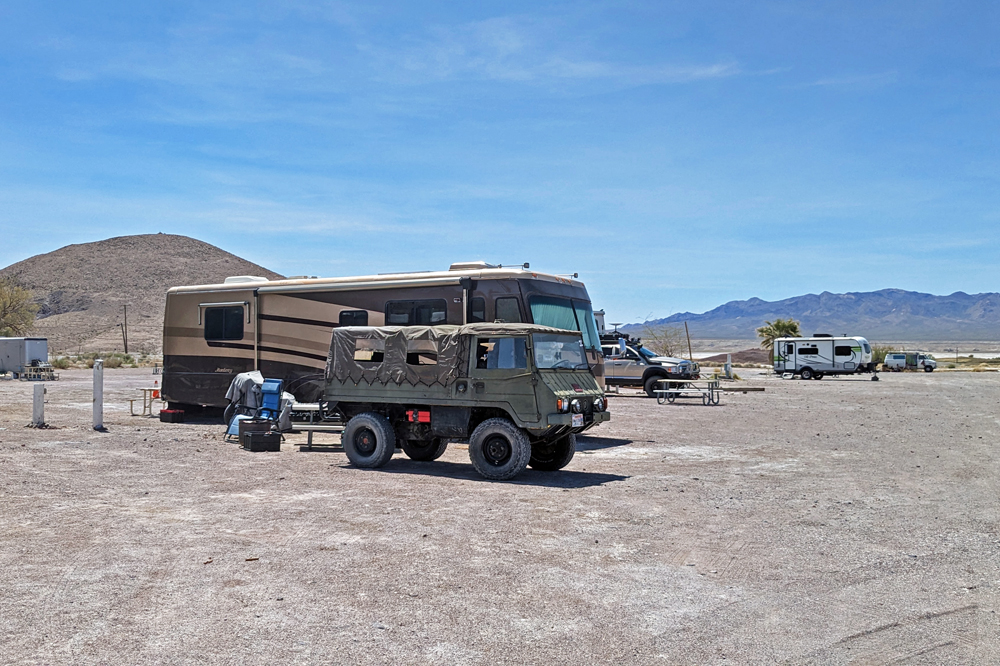 Wir haben noch eine gute Woche Zeit, bis wir Fabian und Marion in Las Vegas treffen und mit ihnen einige Tage verbringen wollen, bevor sie die Overland-Expo in Flagstaff besuchen. Also nichts wie los ins Saline Valley! Unser Weg führt uns zuerst nach Pahrump NV, wo Mark gewohnt hat – vor wenigen Tagen haben wir erfahren, dass er von der schrecklichen, unheilbaren amyotrophen Lateralsklerose (Lou-Gehrig-Syndrom) erlöst wurde. Wir hatten ihn und seine Schwester Karen, die ihn gepflegt hat, im Januar auf dem Weg nach Süden noch gesehen. Damals schien es ihm sogar ein bisschen besser zu gehen, weshalb die Nachricht als besonderer Schock kam. Wir treffen Karen, die weiter im Haus wohnt und nun auch noch den ganzen Nachlass regeln muss, sowie ihre sehr liebe Tochter Olivia und verbringen einen schönen Nachmittag mit ihnen.