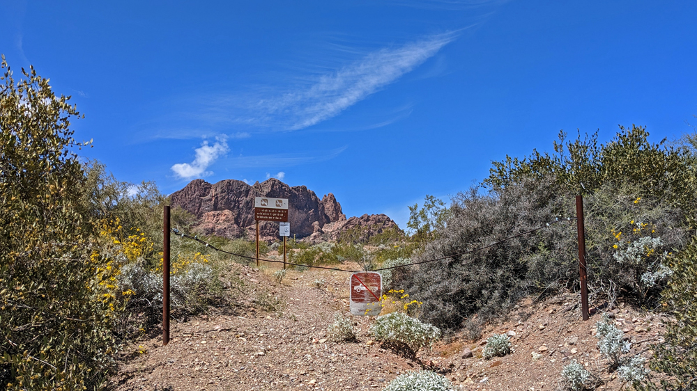 Bill und Ozy montieren die Anhängerkupplung an unserem Auto (keine grosse Sache, weil das „Loch“ dafür schon da ist) und am nächsten Morgen sind wir unterwegs in die Kofa National Wildlife Refuge, die sich etwas südlich von Quartzsite befindet. Das NWR, das nach der von 1897 bis 1910 aktiven King of Arizona Mine benannt ist, wurde 1939 eingerichtet, um das Wüsten-Dickhornschaf zu schützen, Es ist rund 2’700 km2 (665,400 acres) gross und umfasst zweieinhalb Bergketten (Castle Dome sowie Kofa Mountains) sowie das dazwischenliegende King Valley. Ein grosses Areal, das wir in den nächsten Tagen erkunden können!