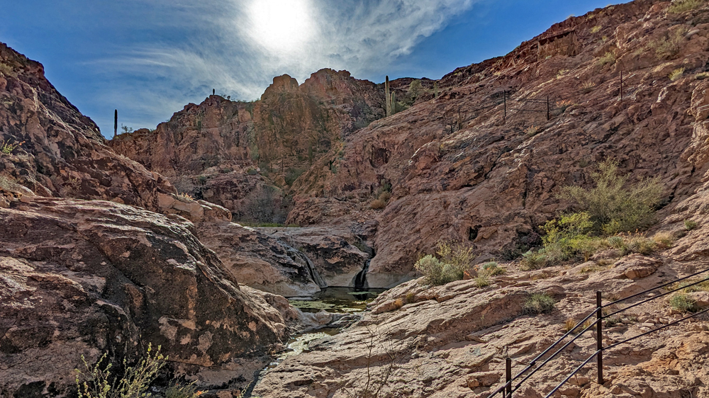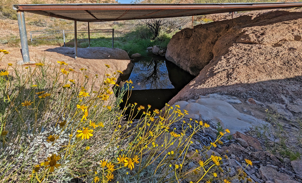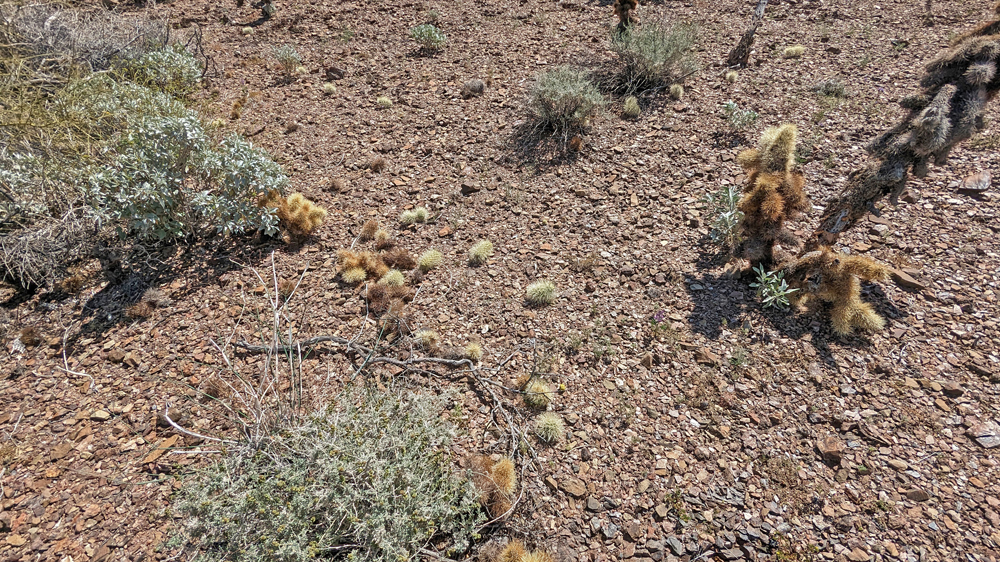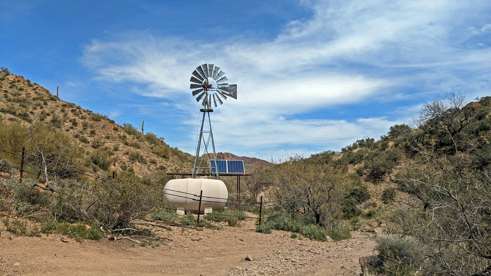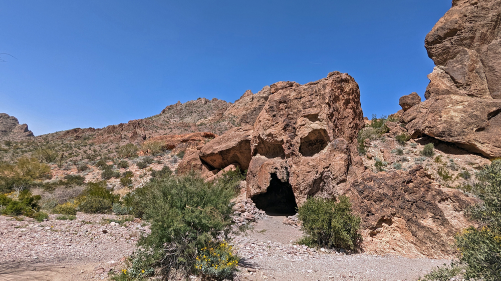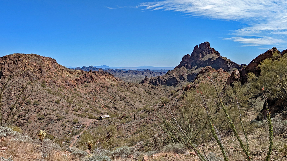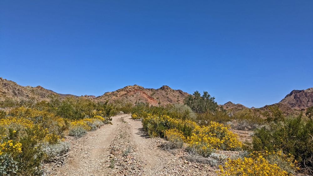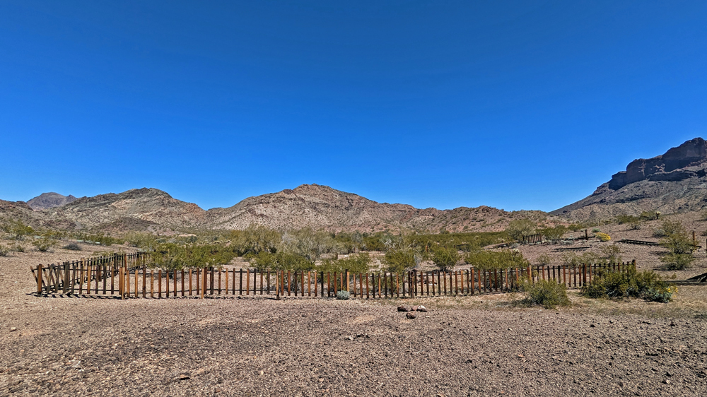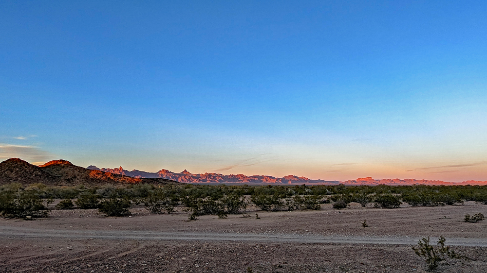 Wir hatten uns in der Visitor Contact Station in Yuma Infomaterial und eine Karte geholt (wegen Personalmangels (?) war es geschlossen, aber ein Law Enforcement Ranger auf Pikett liess uns trotzdem rein) und waren bereits im Februar 2020 schon mal kurz hier, so dass wir schon eine ungefähre Idee vom Gebiet haben. Zuerst stellen wir uns an die King Road im gleichnamigen Tal, um mit dem ATV die südliche Hälfte des NWR zu erkunden (u.a. Big Eye Mine, die Gegend um die ehemalige Kofa Mine sowie einige tanks = Wasserbecken). Da das Kofa NWR im Süden direkt an den Yuma Proving Ground angrenzt, bekommen wir eines Abends eine interessante und recht lange anhaltende Lichtshow geboten, als dort blendend helle Lichter vom Himmel segeln (Zielübungen oder Nacht-Fallschirmtraining???)