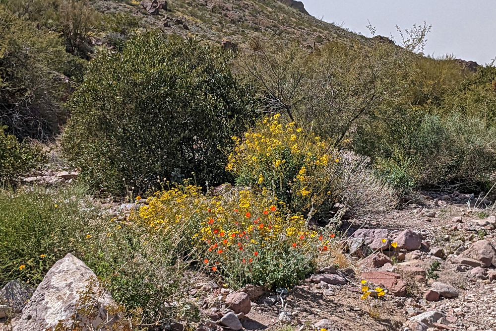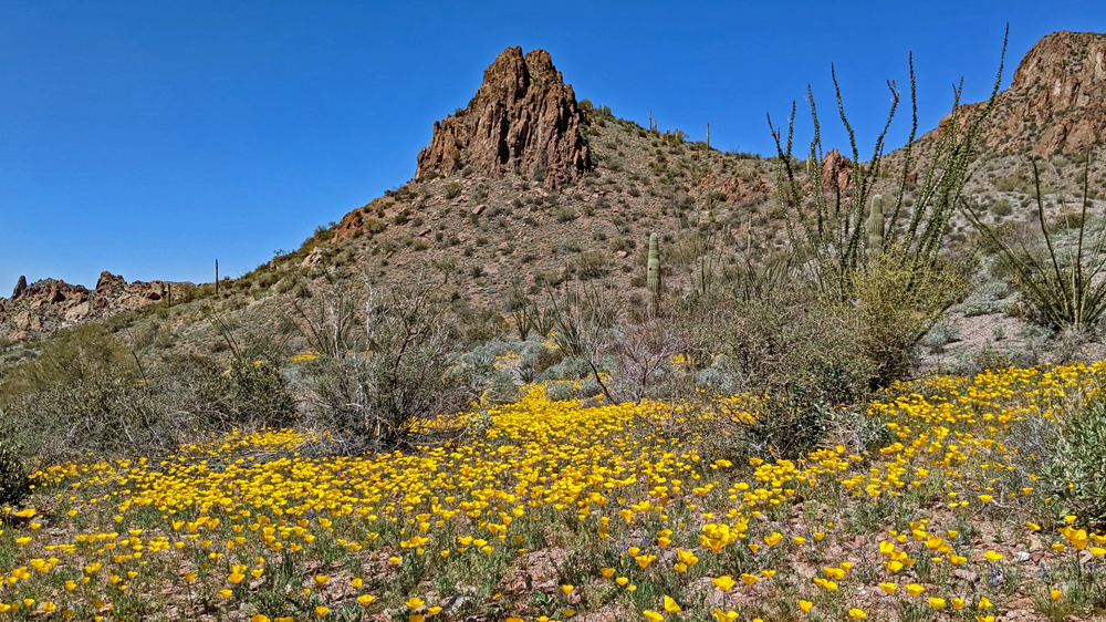 Im Zentralen Bereich hat es dann fast keine blühenden Kakteen mehr, dafür blenden uns die Berghänge im Queens Canyon mit ihrem dichten Teppich von orangegelb leuchtenden Mohnblüten (Eschscholzia sp.).