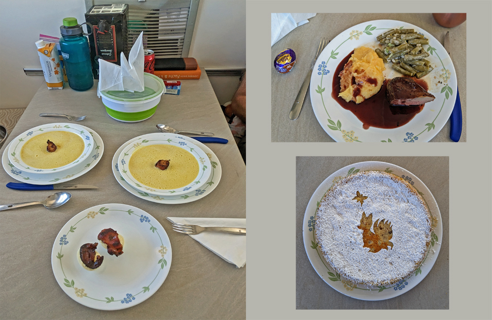 Ostern feiern wir mit einem feinen Essen. Ich versuche, einen «Osterfladen» in der Pfanne zu backen (klappt dank gut kontrollierbarem Induktionsherd recht ordentlich, der Teigboden müsste aber nächstes Mal noch dünner sein, damit er nicht so dunkel wird…) und wir gönnen uns ein richtiges Menü mit Vor- und Hauptspeise.