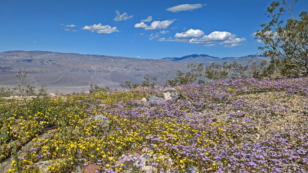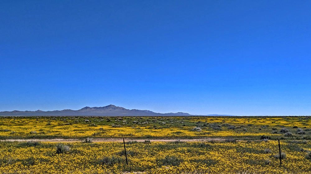 Am Ostermontag fahren wir Richtung Ballarat, wo wir mit unseren Freunden abgemacht haben. In Kramer Junction, CA können wir im Truck Stop wieder einmal duschen (dringend benötigt, aber die 18 $ für die Dusche schockieren uns schon!) und bei Boron stellen wir uns mitten in die Wildblumen zum Übernachten. Auf der Weiterfahrt werden die Blumenwiesen immer dichter. Ozy hat aber inzwischen die Nase gestrichen voll von Blumen und ich muss mich darauf beschränken, die vor allem in verschiedenen Gelbtönen leuchtenden Teppiche vom Fenster aus zu bestaunen (und zu fotografieren).