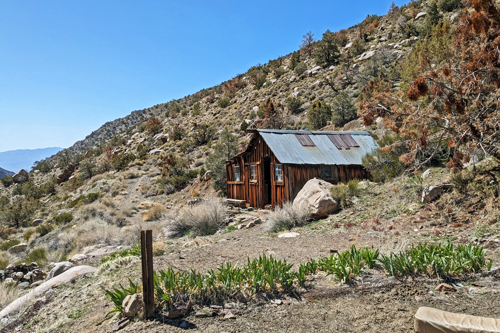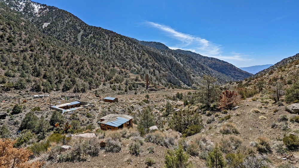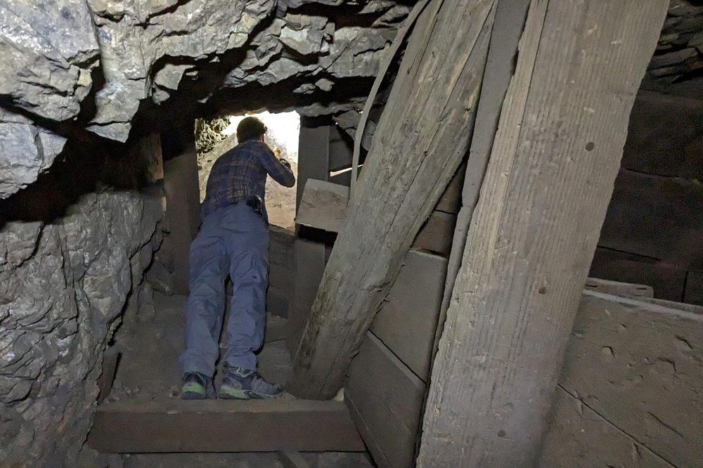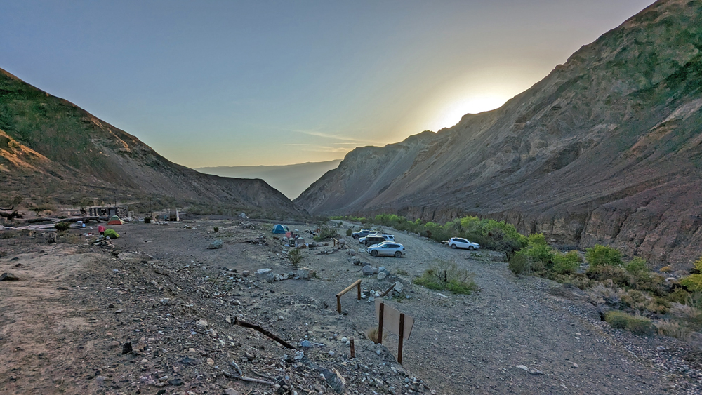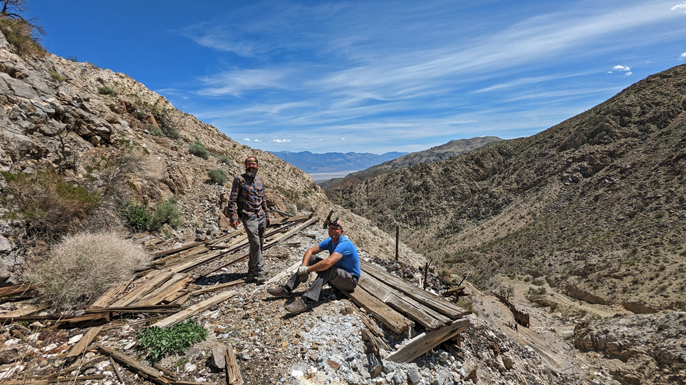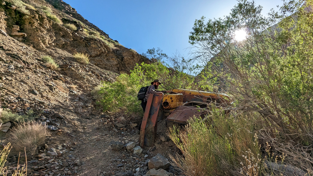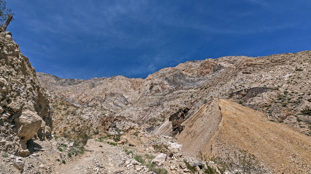 Aber wir haben schaffen es und erreichen nach einigem Gekraxel – und mit vielen Fotostopps – nach gut fünf Stunden und rund 1’200 Höhenmetern / 4000 ft das «Panamint Hilton», eine renovierte Hütte, in der man auch übernachten kann. Nach der verdienten Mittagspause erkunden wir die Umgebung mit ihren diversen Gebäuden und Gerätschaften aus verschiedenen Epochen und in verschiedenen Stadien des Zerfalls: 1872 gegründet, zählte die Stadt nur zwei Jahre später bereits 2000 Einwohner und hatte eine 1.6 km / 1 mi lange Hauptstrasse. Im Sommer 1876 wurde der grösste Teil der Stadt während einer verheerenden Sturzflut weggespült, war aber trotzdem noch bis Ende des 19. Jahrhunderts bewohnt. In den 1920er und 1970/80er Jahren fand nochmals Bergbau in grösserem Stil statt. Von letzterem zeugen eine grosse Werkshalle, eine vermutlich in ein älteres Gebäude eingebaute Unterkunft sowie eine noch recht vollständige Erzverarbeitungsanlage. Den Lewis Tunnel, der etwas oberhalb der Anlage liegt, entdecken wir erst zum Schluss, als wir uns eigentlich schon auf den Rückweg machen wollen. Wir gehen etwa einen halben Kilometer in den komplett geraden Tunnel hinein und erkunden dort einen kurzen Abzweiger. Gino möchte gerne noch sehen, wie es weitergeht, aber ich verderbe ihm den Spass: Es ist schon halb vier und wir sind nicht für eine Nachtwanderung ausgerüstet. Wir kehren also um und schaffen es dann auch gerade noch buchstäblich mit dem letzten Sonnenstrahl zum Parkplatz zurück.