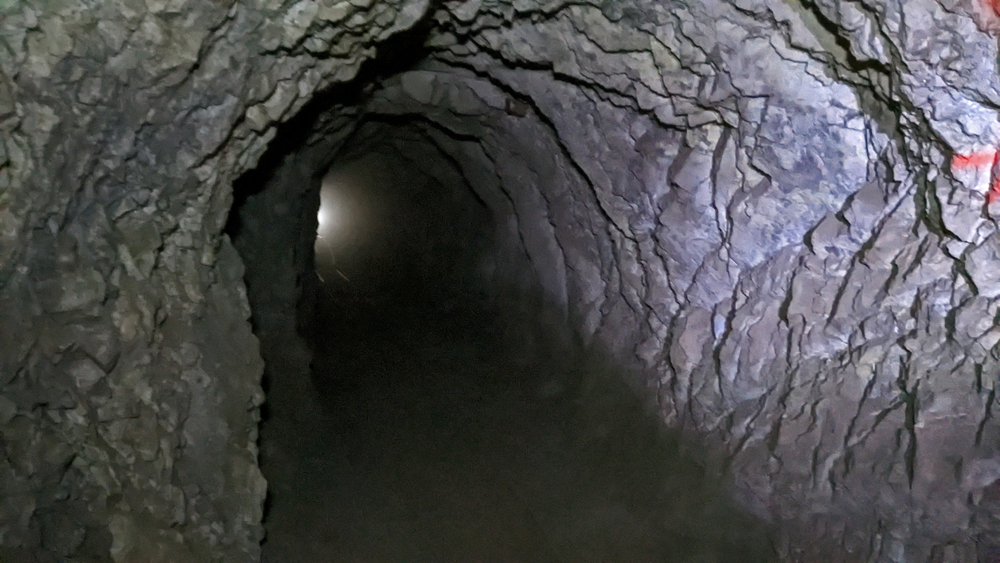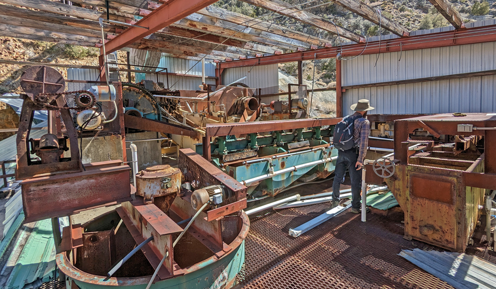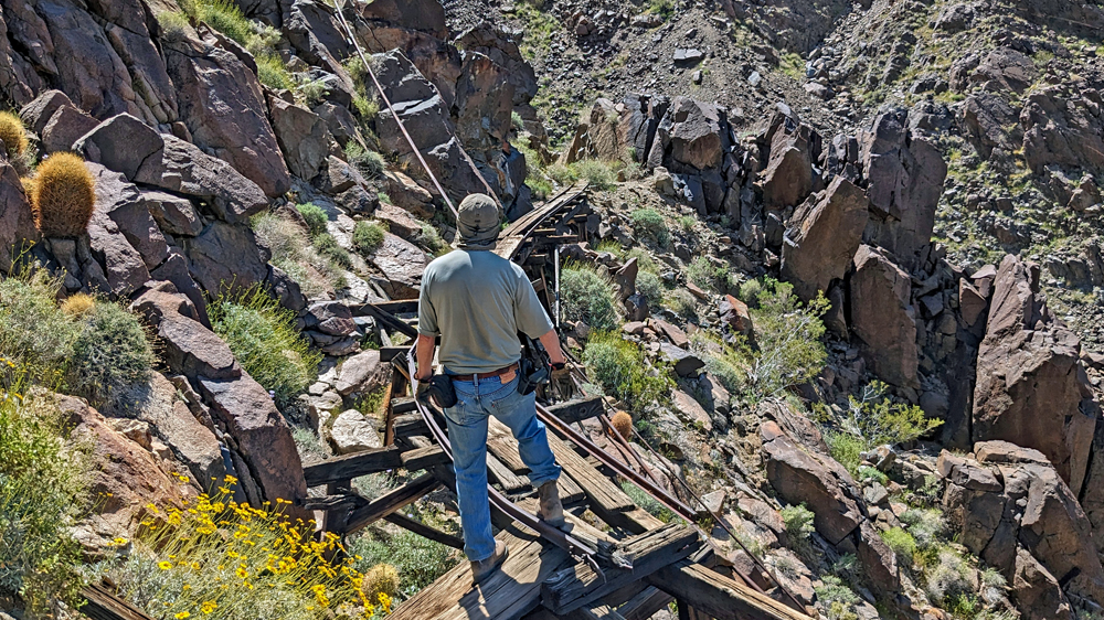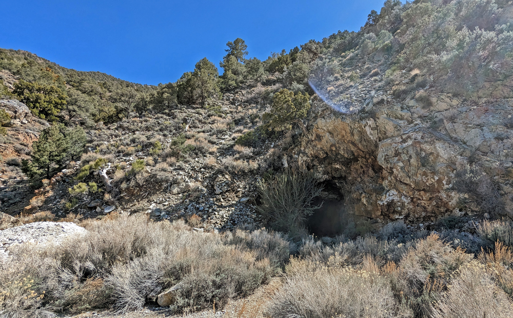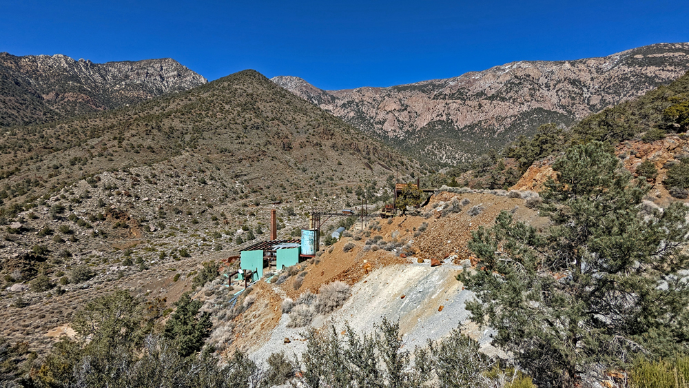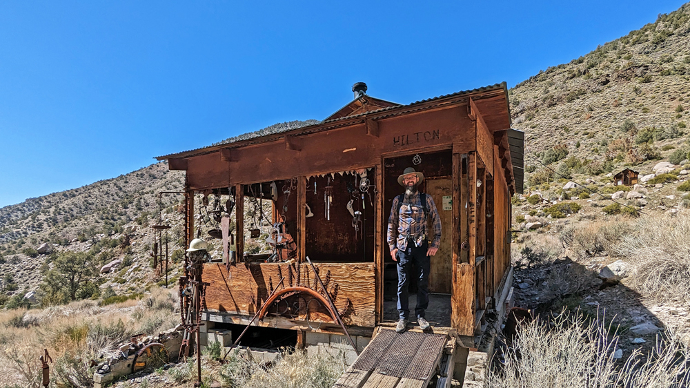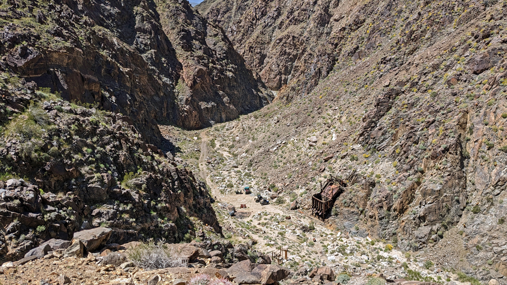 Aber wir haben schaffen es und erreichen nach einigem Gekraxel – und mit vielen Fotostopps – nach gut fünf Stunden und rund 1’200 Höhenmetern / 4000 ft das «Panamint Hilton», eine renovierte Hütte, in der man auch übernachten kann. Nach der verdienten Mittagspause erkunden wir die Umgebung mit ihren diversen Gebäuden und Gerätschaften aus verschiedenen Epochen und in verschiedenen Stadien des Zerfalls: 1872 gegründet, zählte die Stadt nur zwei Jahre später bereits 2000 Einwohner und hatte eine 1.6 km / 1 mi lange Hauptstrasse. Im Sommer 1876 wurde der grösste Teil der Stadt während einer verheerenden Sturzflut weggespült, war aber trotzdem noch bis Ende des 19. Jahrhunderts bewohnt. In den 1920er und 1970/80er Jahren fand nochmals Bergbau in grösserem Stil statt. Von letzterem zeugen eine grosse Werkshalle, eine vermutlich in ein älteres Gebäude eingebaute Unterkunft sowie eine noch recht vollständige Erzverarbeitungsanlage. Den Lewis Tunnel, der etwas oberhalb der Anlage liegt, entdecken wir erst zum Schluss, als wir uns eigentlich schon auf den Rückweg machen wollen. Wir gehen etwa einen halben Kilometer in den komplett geraden Tunnel hinein und erkunden dort einen kurzen Abzweiger. Gino möchte gerne noch sehen, wie es weitergeht, aber ich verderbe ihm den Spass: Es ist schon halb vier und wir sind nicht für eine Nachtwanderung ausgerüstet. Wir kehren also um und schaffen es dann auch gerade noch buchstäblich mit dem letzten Sonnenstrahl zum Parkplatz zurück.