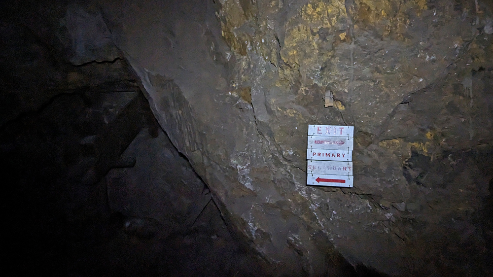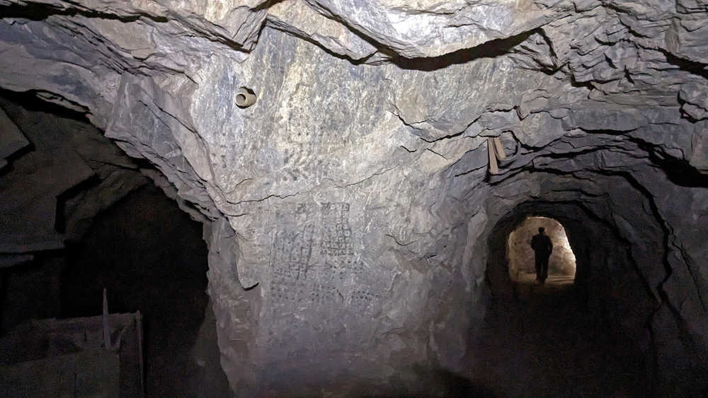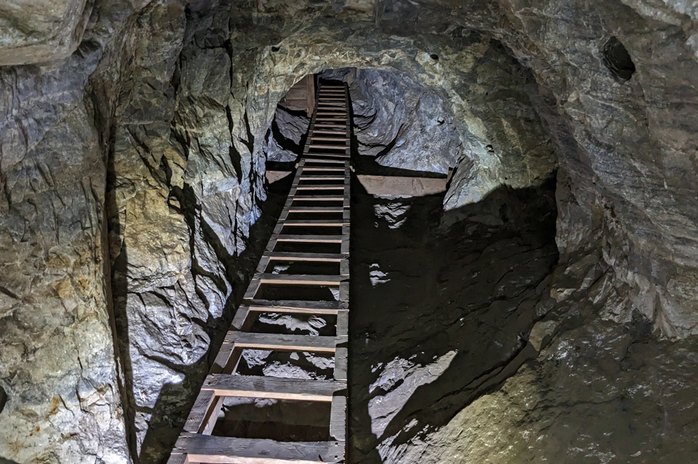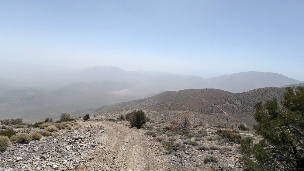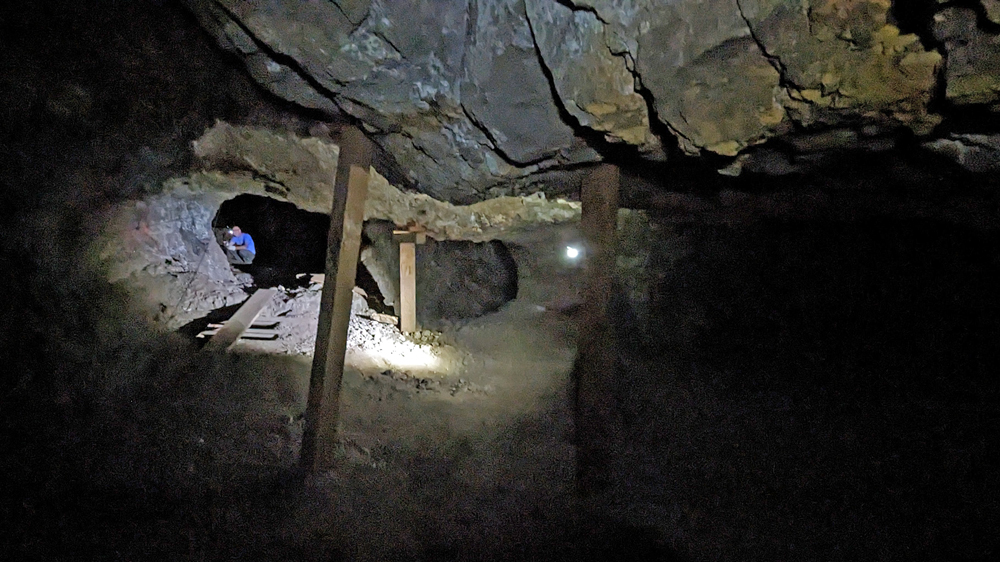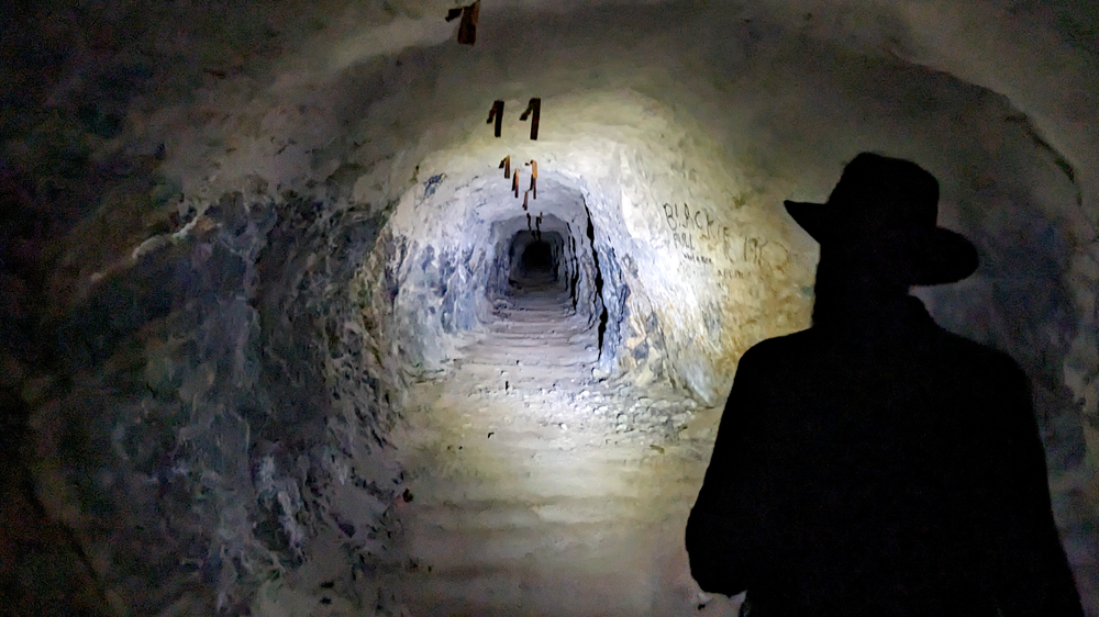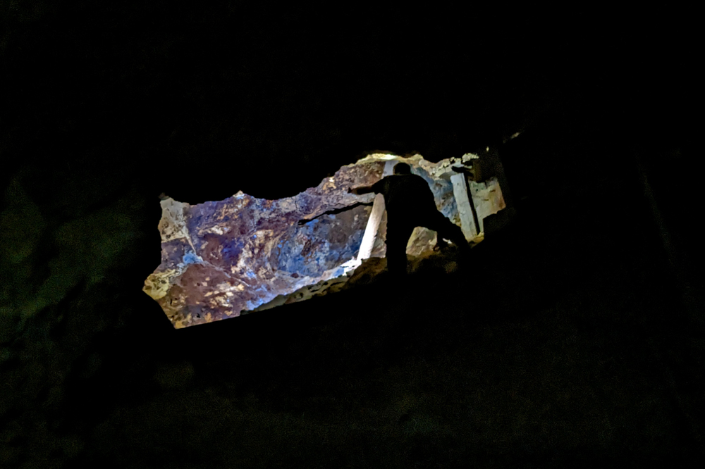 Aber wir haben schaffen es und erreichen nach einigem Gekraxel – und mit vielen Fotostopps – nach gut fünf Stunden und rund 1’200 Höhenmetern / 4000 ft das «Panamint Hilton», eine renovierte Hütte, in der man auch übernachten kann. Nach der verdienten Mittagspause erkunden wir die Umgebung mit ihren diversen Gebäuden und Gerätschaften aus verschiedenen Epochen und in verschiedenen Stadien des Zerfalls: 1872 gegründet, zählte die Stadt nur zwei Jahre später bereits 2000 Einwohner und hatte eine 1.6 km / 1 mi lange Hauptstrasse. Im Sommer 1876 wurde der grösste Teil der Stadt während einer verheerenden Sturzflut weggespült, war aber trotzdem noch bis Ende des 19. Jahrhunderts bewohnt. In den 1920er und 1970/80er Jahren fand nochmals Bergbau in grösserem Stil statt. Von letzterem zeugen eine grosse Werkshalle, eine vermutlich in ein älteres Gebäude eingebaute Unterkunft sowie eine noch recht vollständige Erzverarbeitungsanlage. Den Lewis Tunnel, der etwas oberhalb der Anlage liegt, entdecken wir erst zum Schluss, als wir uns eigentlich schon auf den Rückweg machen wollen. Wir gehen etwa einen halben Kilometer in den komplett geraden Tunnel hinein und erkunden dort einen kurzen Abzweiger. Gino möchte gerne noch sehen, wie es weitergeht, aber ich verderbe ihm den Spass: Es ist schon halb vier und wir sind nicht für eine Nachtwanderung ausgerüstet. Wir kehren also um und schaffen es dann auch gerade noch buchstäblich mit dem letzten Sonnenstrahl zum Parkplatz zurück.