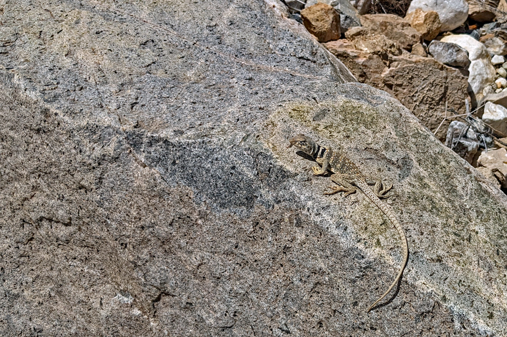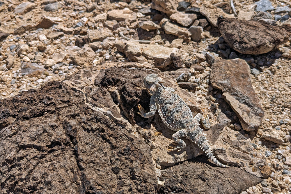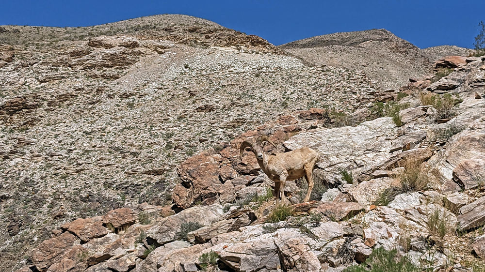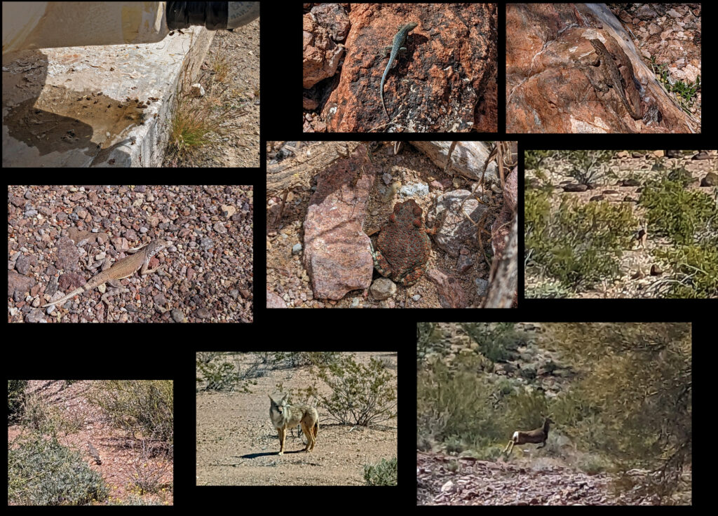 Trotz Wüstenumfeld entdecken wir zahlreiche Tiere: ein Koyote überquert vor uns die Strasse und betrachtet uns dann ganz neugierig, ganz passend am Ostersamstag schlägt sich ein Hase ins Gebüsch, zahlreiche Vögel singen, Wachteln wuseln in Scharen herum, verschiedene Eidechsen suchen unter Steinen Deckung, eine grosse Kröte geniesst den Schatten und ein ganzes Rudel Maultierhirschkühe rennt quer über die Piste. Nur die Dickhornschafe, für die das Schutzgebiet ja eingerichtet wurde, machen sich rar. Allerdings kommt man auch nicht wirklich in die Berge, wenigstens nicht mit Motor. Es gibt kaum Rundfahrten, d.h. man muss fast jede Strecke wieder auf dem gleichen Weg zurückfahren, was dann manchmal sehr lange Tagesstrecken von über 100 Meilen / 160 km ergibt.