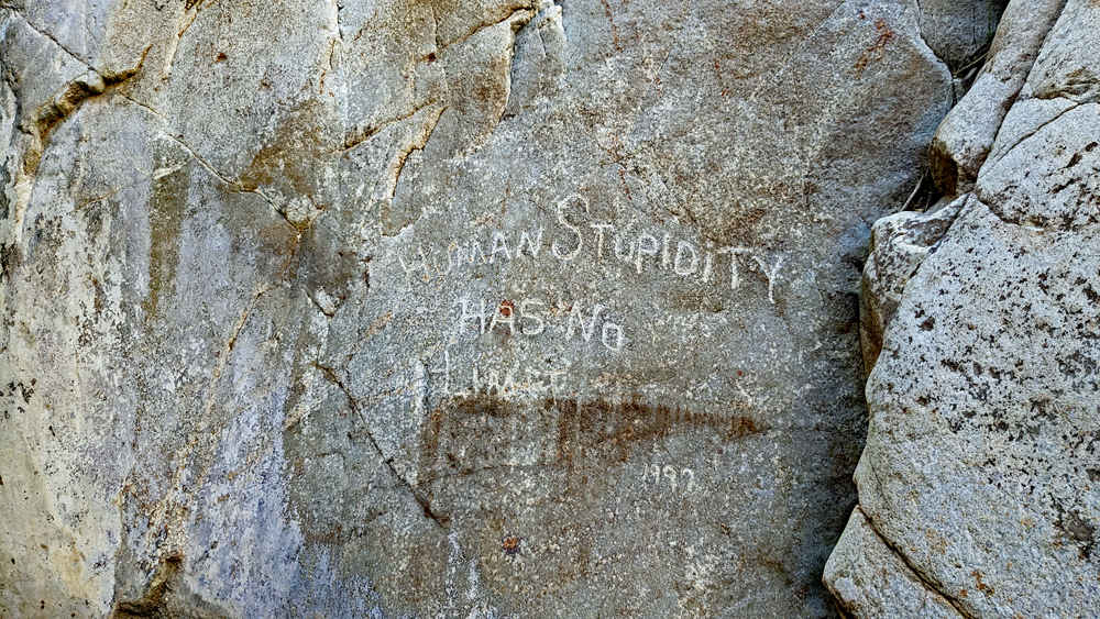 Als wir an einem Abend am Lagerfeuer sitzen, schaue ich versonnen nach Norden, wo es immer ein bisschen heller wird. Ich frage mich, woher das Licht kommt, denn dort ist gar nichts?! (Ein schwacher Schein von Las Vegas sowie von Los Angeles im Südosten bzw. Südwesten ist sogar hier, mehr als 200 km / 150 mi entfernt, zu sehen). Plötzlich dämmert es mir: es müssen Nordlichter sein!!! Und tatsächlich entwickeln sich schwache Streifen und der Lichtschein erweckt den leichten Eindruck eines Vorhangs. Gino und ich machen Fotos davon mit unseren Smartphones und diese vermögen auch die Farben, die wir von Auge allerhöchstens erahnen können, abzubilden! Wir staunen etwa eine Stunde lang, bis das Licht immer schwächer wird. Am nächsten Tag finden wir dann heraus, dass die Sonne am Freitag eine sehr starke Eruption hatte und das Nordlicht bis etwa in die Mitte der USA zu sehen war (wir befanden uns am allersüdlichsten Ende und haben nur die obersten Enden der höchsten – und deswegen auch roten – Nordlichter sehen können). Was für ein tolles Erlebnis!!!