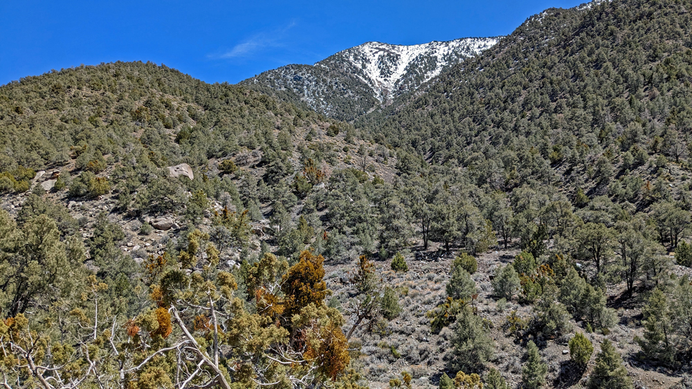 Danach haben wir aber wieder Erholung – und vor allem kühlere Temperaturen – nötig und ziehen uns für zwei Nächte an die Lovell Canyon Road in den Spring Mountains auf über 1500 m / 5000 ft zurück. Wir erwischen natürlich gerade das Wochenende, und offenbar sind wir nicht die einzigen mit dieser Idee… Nach einigem Suchen finden wir dann doch auch noch ein Plätzchen zwischen den Wacholderbüschen und geniessen die tagsüber um 10 Grad kühleren Temperaturen und kalten Nächte.