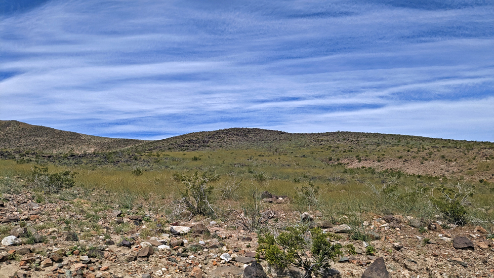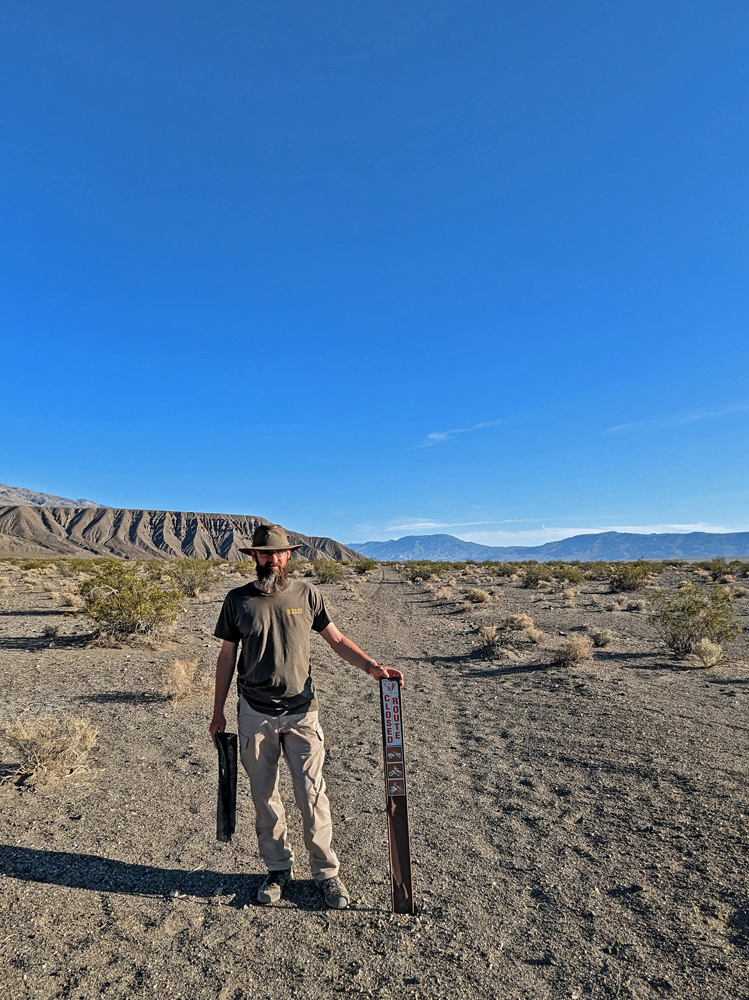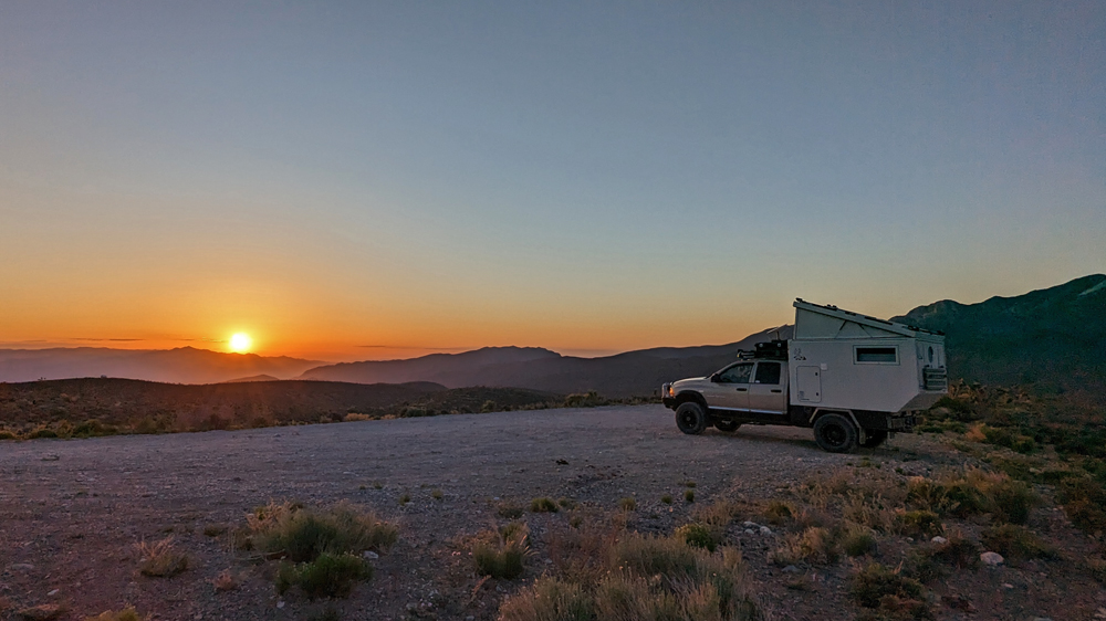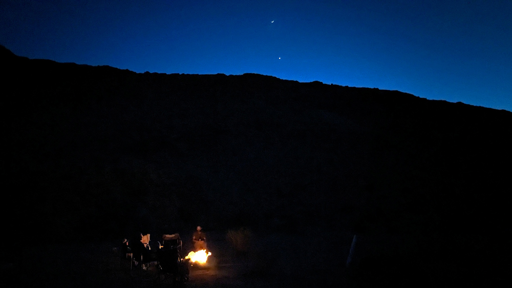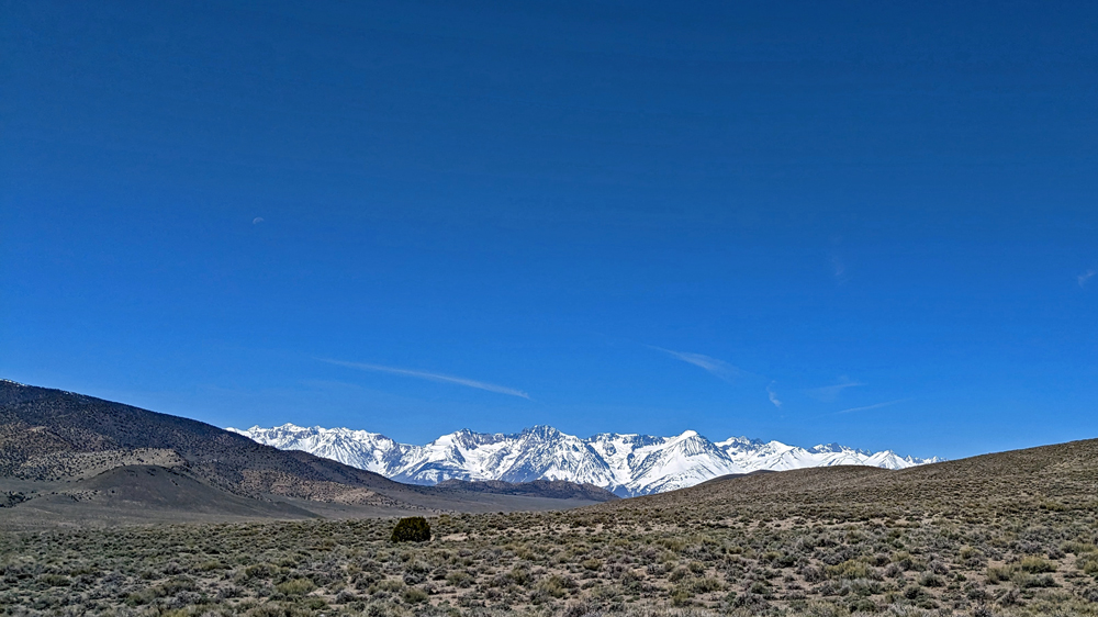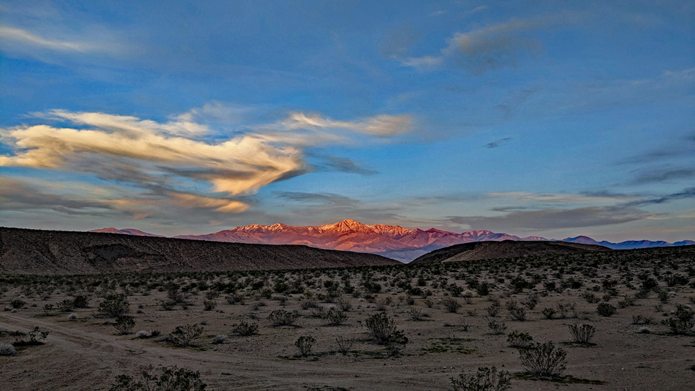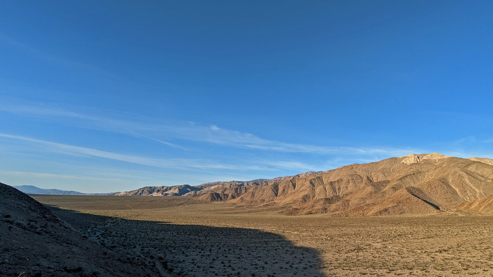 Ganz zum Schluss hoffen wir noch auf ein weiteres Highlight: für den nächsten Morgen ist ein SpaceX-Raketenstart im rund 300 km / 200 mi entfernten Vandenberg AFB Space Launch Complex an der kalifornischen Küste angekündigt. Im letzten Herbst hatten wir beim Abensoak im Pool im sogar noch etwas weiter entfernten Saline Valley ganz zufällig eine solche Rakete gesehen. Vielleicht klappt es ja wieder?! Wir stehen alle früh auf (der Start soll kurz nach 6 Uhr erfolgen) und Don, Bill und ich fahren warm eingepackt zu einem höher gelegenen Punkt auf der anderen Seite des kleinen Tales, während Ozy mit Internet und Funkgerät ausgerüstet im Camp die Stellung hält. Wir stehen und gucken. 10, 9, 8, 7, 6 – und der Start wird buchstäblich in letzter Sekunde abgebrochen und auf den nächsten Morgen verschoben, wie uns Ozy über Funk wissen lässt. Also alles wieder zurück und bei einem heissen Tee aufgewärmt. Am nächsten Morgen (unserem letzten gemeinsamen) nochmals das gleiche Spiel: Früh aufstehen und in der Kälte auf den nächsten Hügel. Dieses Mal startet die Rakete – aber wir sehen trotzdem nichts… ☹ Als wir den Start vom Saline Valley aus gesehen hatten, war es im Tal dämmerig und die Rakete und ihre Rauchfahne wurden von hinten von den letzten Sonnenstrahlen beleuchtet. Am Tag ist es vom Licht her aus dieser Entfernung und mit der Argus Range dazwischen vermutlich einfach nicht möglich, die winzige Rakete zu sehen. Oh well. Einen Versuch war es wert…