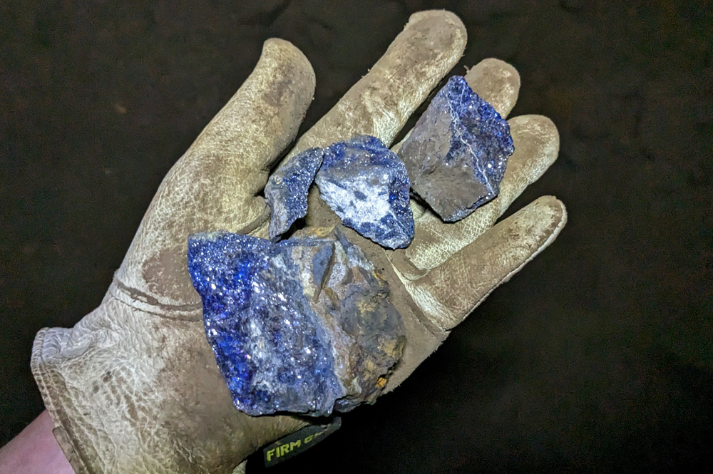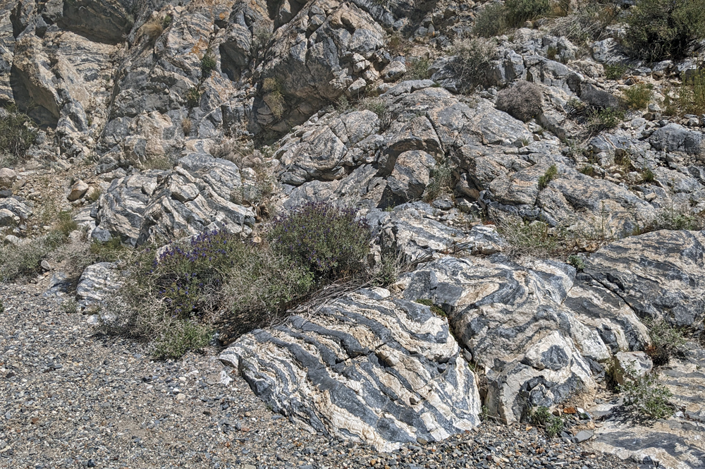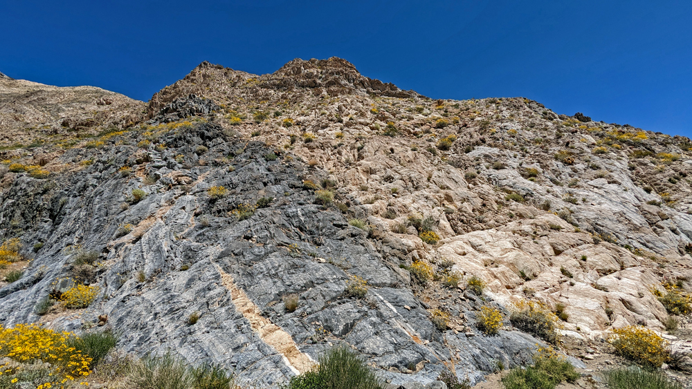Von Ridgecrest aus geht es wieder zurück ins Panamint Valley, dieses Mal zum Camp in der Nähe der Minnietta Mine, nochmals rund 30 km / 17 mi nördlich von Ballarat. Das Camp ist auf der Westseite des Tales gelegen und auch ein kleines bisschen höher, so dass es hier ein wenig kühler ist als vorher. Don, der einige Tage später dazukommt, hatte auf dem Weg nach Beatty netterweise extra sein zweites ATV für Gino hier stehenlassen, so dass wir zu dritt die Defense Mine erkunden können (Youtube-Video: Defense Mine now and then). Wir waren ja vor drei Jahren schon mal mit Don und Bob hier drin und kraxeln wieder die Leitern durch die langen Schächte hoch und werfen einen Blick vom oberen Stolleneingang ins Tal hinunter. Ozy möchte jedoch unbedingt noch den Weg in die obere Ebene finden (es hat einige Erzschütten, die zeigen, dass es noch eine weitere Ebene geben muss), doch nach insgesamt drei Stunden und Erkundung aller Gänge ist klar, dass diese ohne Kletterausrüstung nicht mehr zu erreichen ist. Wir finden dafür einige sehr schöne Bleiglanzbrocken (Galenit) und besuchen auf dem Rückweg kurz Lookout City, wo es nicht nur die Aussicht, sondern dieses Jahr auch gelb bzw. lila leuchtende Blumenwiesen zu bewundern gibt.