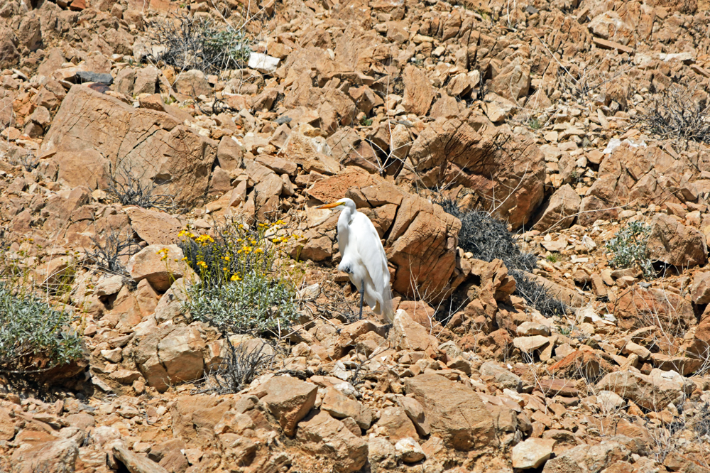 Wir geniessen mit Don und Bill noch ein paar letzte Tage in der Wüste. An einem Tag entdecken wir zwei Silberreiher über uns in der Felswand, die hier völlig fehl am Platz scheinen (vor drei Jahren hatten wir fast an derselben Stelle, schon einen Fischadler sitzen sehen!). Die Tiere stehen den ganzen Tag fast bewegungslos auf ihren Plätzen in der sengenden Sonne und wir fragen uns, ob sie wegen des Sonnensturms vom Kurs abgekommen sind und hier einfach verdursten und sterben werden. Wir sitzen am Abend beim Eindunkeln am Lagerfeuer und die beiden verlorenen weissen Punkte sind immer noch da. Doch plötzlich, punkt acht, als es schon fast dunkel ist, starten beide zur gleichen Zeit. Sie fliegen drei volle Kreise – um ihren Kompass wieder auszurichten? – und verschwinden dann genau Richtung Norden in der Dunkelheit!