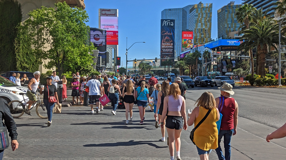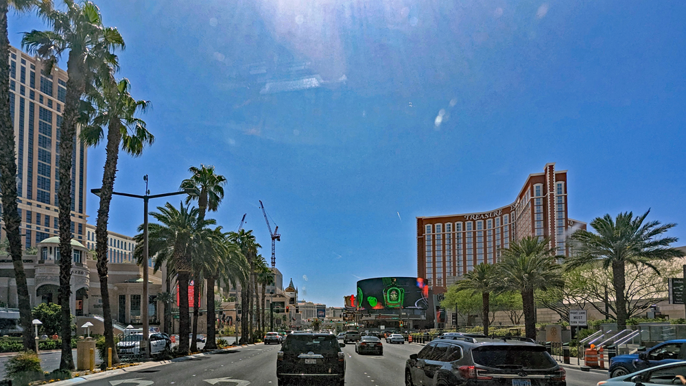 Es ist heiss geworden. In Tecopa hatten wir 5 $ extra bezahlt, damit wir uns bei um die 35 °C / 95 °F an den Strom hängen und die Klimaanlage laufen lassen konnten. In Las Vegas stehen wir auf dem asphaltierten Parkplatz hinter dem Bally’s, wo es noch viel heisser ist… (der Campground vom Circus Circus war wegen eines Events leider geschlossen). Trotzdem geniessen wir die Hitze und insbesondere den Las Vegas Strip, denn als wir die letzten paar Mal hier waren, war es jeweils so kalt und windig, dass uns ein Besuch so gar nicht angelacht hat. Nun ist es endlich schön und warm und wenn wir ins Schwitzen kommen, ist das nächste, gut gekühlte Kasino nicht weit…