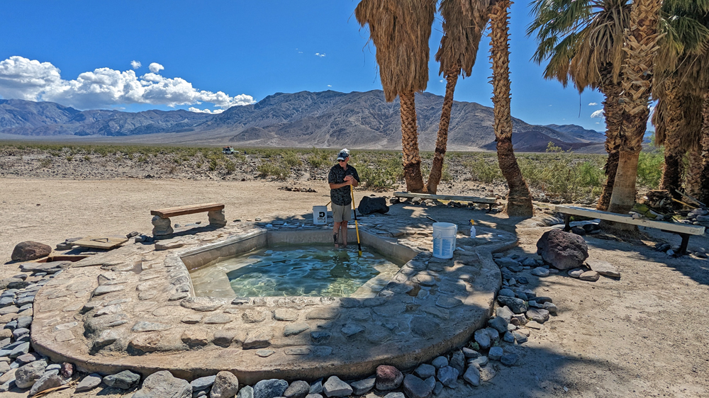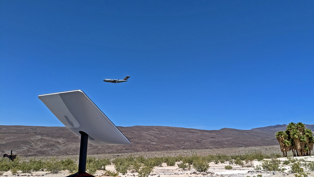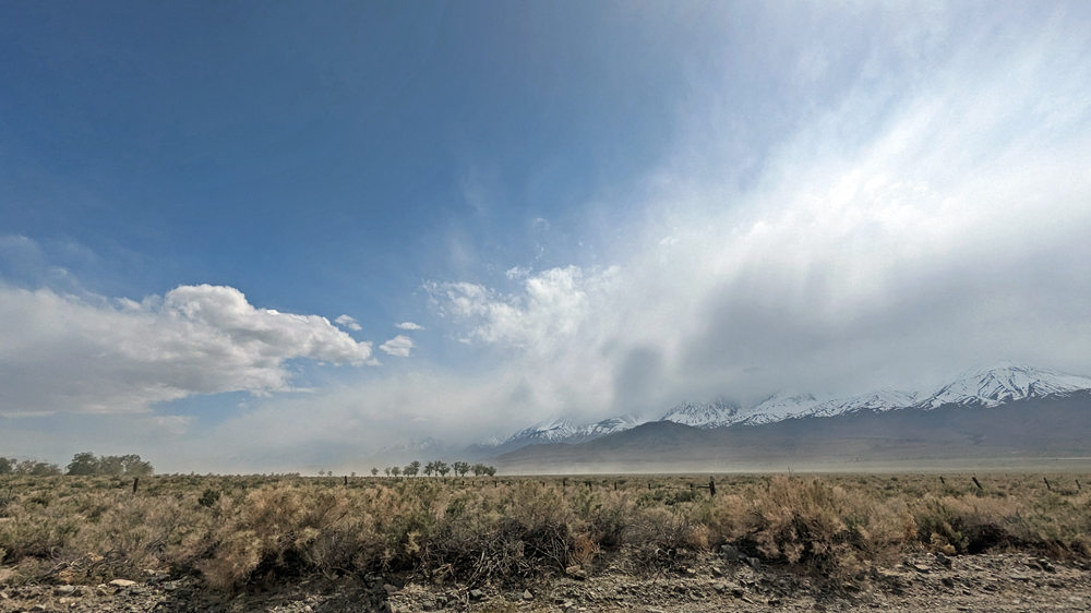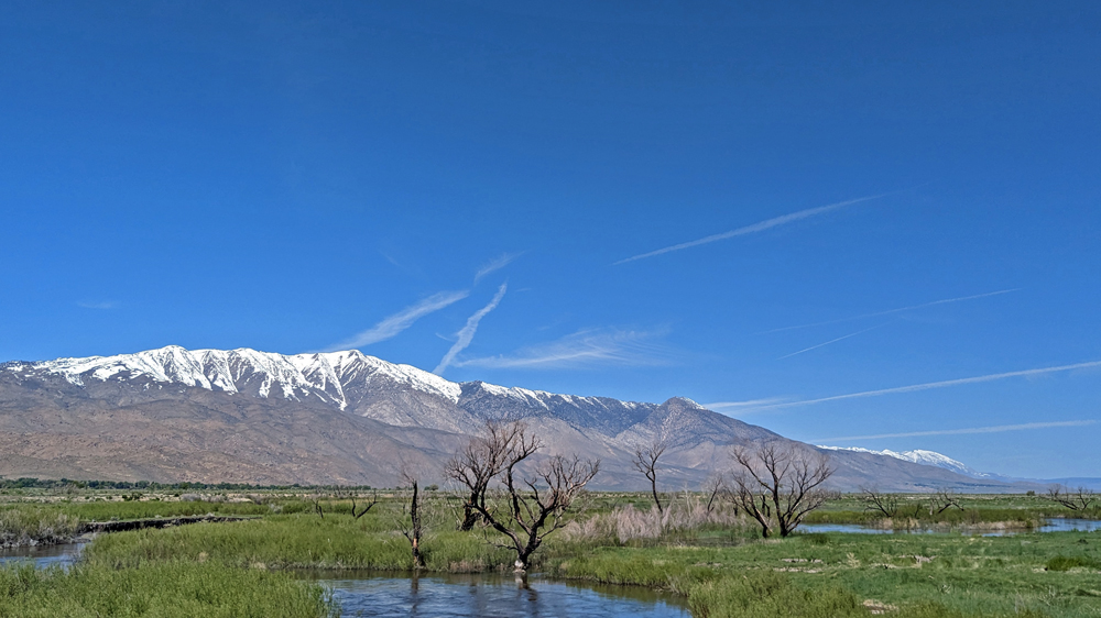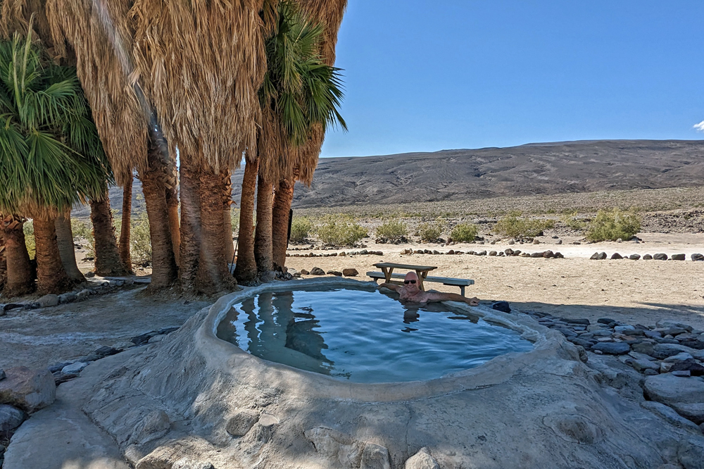 Nach einer Übernachtung auf den «Pads» ausserhalb des Death Valley NP, wo Ozy gleich noch einen Luftfilter für die Innenraum-Lüftung der Kabine installiert, geht es vorbei an blühenden Joshua Trees in den Bergen und via Bishop (Einkauf für die nächste Woche) ins Saline Valley. Im Bereich des North Pass ist es empfindlich kalt und wir entdecken sogar noch die letzten Schneereste entlang der Strasse. Überhaupt haben sich die Temperaturen plötzlich wieder abgekühlt und wir frieren die ersten paar Tage bei kaltem, stürmischen Wetter sogar ein bisschen, aber das ist ok, denn aufgrund der schlechten Wetterprognose hat es nur wenige andere Menschen bei den heissen Quellen. Wir freuen uns allerdings, Ben wiederzutreffen, der einige Tage mit uns verbringt. Wir geniessen die Zeit im Saline Valley sehr. Wir duschen und soaken ausgiebig, reinigen Pools und das Pit Toilet-Gebäude, gucken Flieger (dieses Mal wird uns besonders viel geboten – unter anderem mehrmals die beeindruckenden Boeing C-17 Globemaster III-Transportflugzeuge im Tiefflug), flüchten vor dem obligaten Sandsturm in unser Häuschen und ich sortiere Fotos und schreibe Blog. Gegen das Wochenende wird es dann wieder heiss und wir freuen uns, dass auch Dennis und Penny sowie Flipper und Cynthia den langen, holprigen Weg auf sich genommen haben und zu uns stossen.