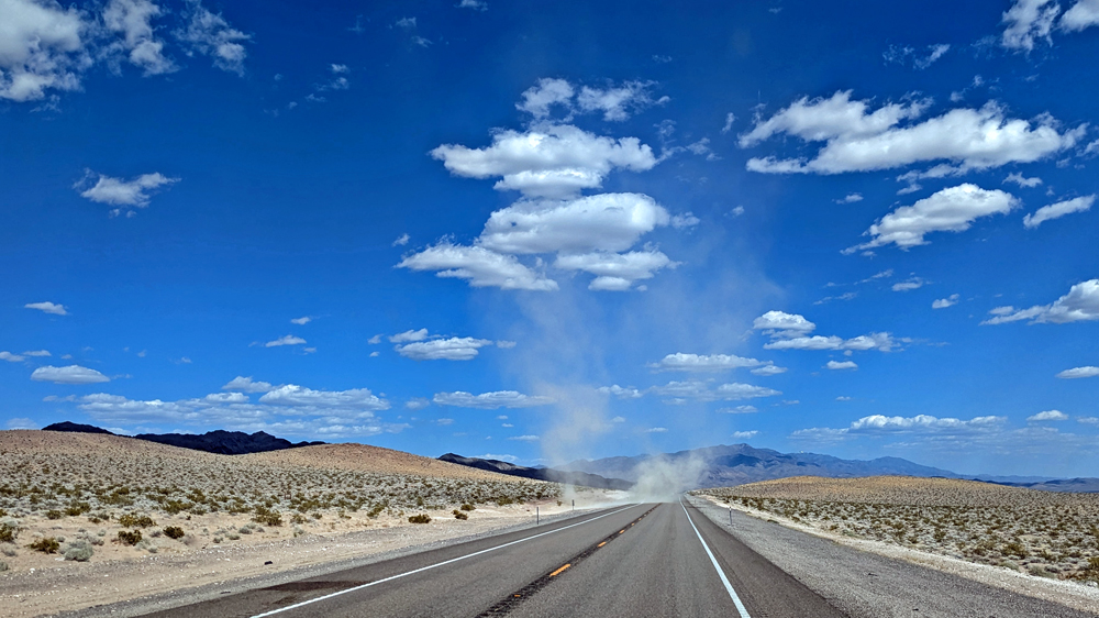 Als wir von unserem Ausflug in den recht engen und geschützten Queens Canyon in die Ebene zurückkommen, landen wir in einem Sandsturm, der so stark ist, dass wir sogar eine Warnung aufs Smartphone bekommen. Als wir endlich zurück in unserem Dihei sind, sind wieder einmal so froh, dass wir feste Seitenwände haben…