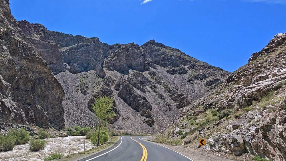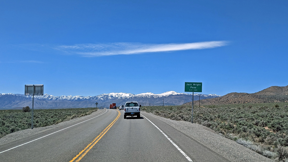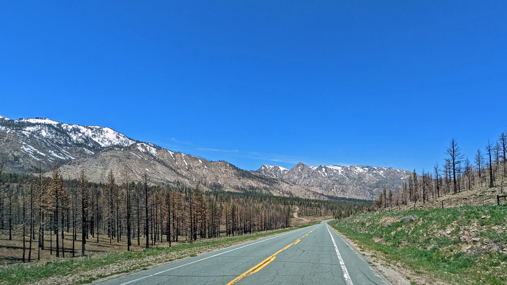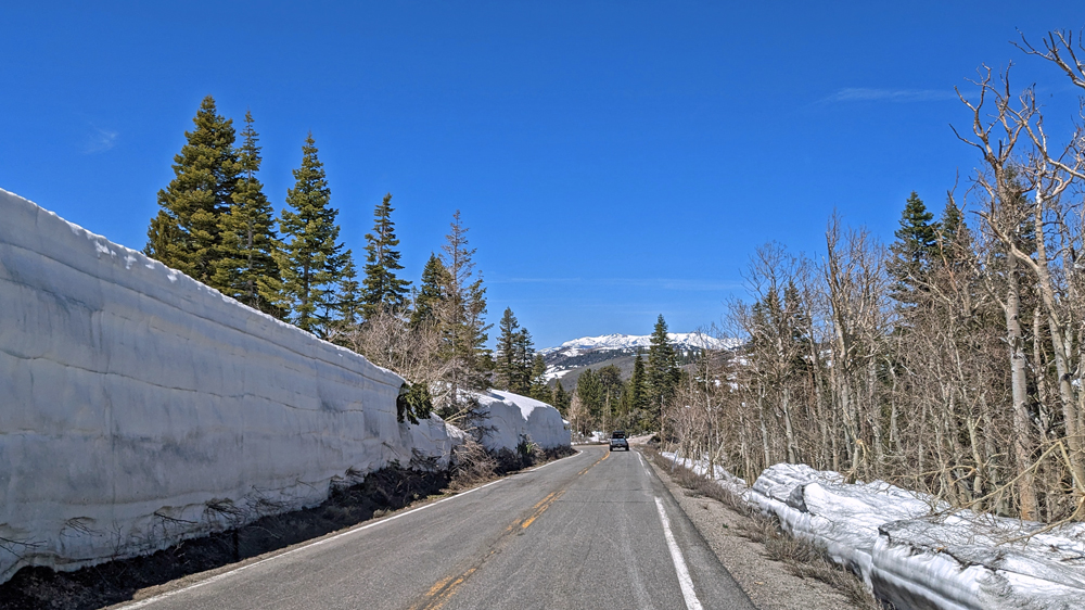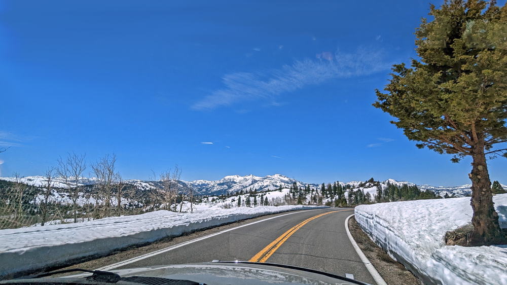 Um dorthin zu gelangen, müssen wir zunächst die Sierra Nevada überqueren, die aufgrund der aussergewöhnlichen Schneefälle diesen Winter ihrem Namen alle Ehre macht. Viele Pässe (von denen es auch so schon nicht allzu viele gibt) sind jetzt, Mitte Mai, noch geschlossen und werden es voraussichtlich noch mindestens einen Monat bleiben.