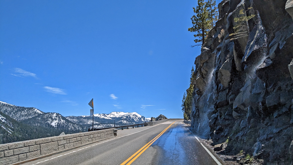 Wir passieren ein paar erste kleinere Vorgebirgsketten, das Städtchen Yerington und den hübschen Topaz Lake, bevor wir südlich von Lake Tahoe auf den Beginn der CA-50 treffen. Die Flüsse führen bereits recht viel Wasser und am nächsten Tag bekommen wir post festum sogar eine Hochwasserwarnung aufs Handy. Es ist fast unglaublich, wie viel Schnee diesen Winter gefallen ist und auch immer noch liegt. Teilweise hat es noch meterhohe Schneemauern und die Strasse wird von zahlreichen Wasserfällen gesäumt, die direkt aus den Schneefeldern laufen. Die Böden in der Höhe sind vermutlich noch gefroren und die oberen Schichten sind wassergesättigt, so dass in allen Ebenen und Senken das Wasser steht. Es ist schon früher Nachmittag und wir fragen uns langsam, wo wir einen Übernachtungsplatz finden sollen, der nicht im Schnee liegt und/oder komplett versumpft ist… Wir fahren einfach mal weiter und als wir auf die Westseite der Sierra kommen, wird es zum Glück etwas besser.