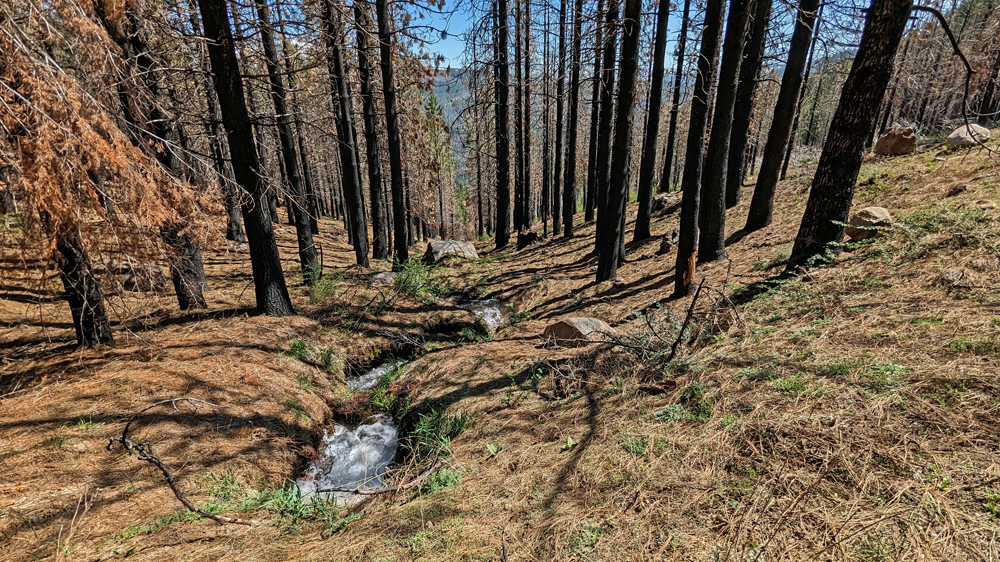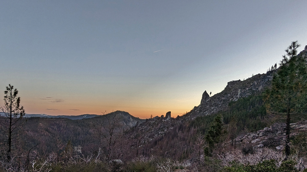 Schliesslich finden wir ein hübsches Plätzchen mit Aussicht. Letzteres, weil es hier – wie wir am Weg auch sonst an vielen Orten gesehen haben – gebrannt hat. An unserem Platz, wie wir dann bemerken, vermutlich erst letztes Jahr, denn der Kohlen- und Aschenstaub enthaltende Boden färbt etwas auf uns und unser Interieur ab… Es gefällt uns aber so gut hier (und wir haben auch noch etwas Zeit bis am 20.), dass wir gleich drei Nächte bleiben. Ozy tönt derweil sein Seitenfenster (um die Hitze besser abzuhalten) und ich wandere zu den Phantom Spires, die wir von unserem Platz aus sehen können.