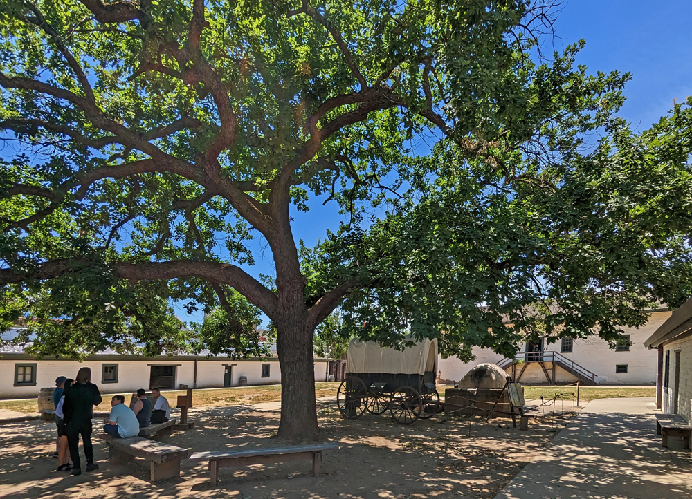 Am nächsten Tag fahren wir ganz beschwingt nach Sacramento. Dort gucken wir uns Sutter’s Fort, heute ein State Historic Park, an (Geschichte des Forts bei Wikipedia und auf der SHP-Seite). Das Fort wurde 1839 vom Schweizer Johann August (John bzw. Don Juan) Sutter in der damals mexikanischen Provinz Alta California zunächst als landwirtschaftliche Kolonie Nueva Helvetia gegründet. Sie hat insofern grosse Bedeutung für Kalifornien, als dass sie die erste europäische Ansiedlung und bis 1849 das Zentrum der europäischen Besiedlung in Kaliforniens Central Valley war. Vom 1841 errichteten Fort aus getrockneten Lehmziegeln (inkl. mit Kanonen bestückten Bastionen) ist nur noch das Hauptgebäude erhalten, die übrigen Gebäude wurden Ende des 19. Jahrhunderts bzw. 1947 rekonstruiert. Wir hatten uns vom Besuch einiges versprochen, da es bis vor kurzem als eine Art Openair-Museum «das tägliche Leben der kalifornischen Pioniere von 1840 [zeigte] und als Zielgruppe insbesondere auch die Schüler» hatte (Zitat aus Wikipedia). Dies ist aber heute offenbar nicht mehr opportun…
