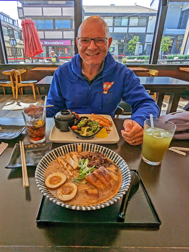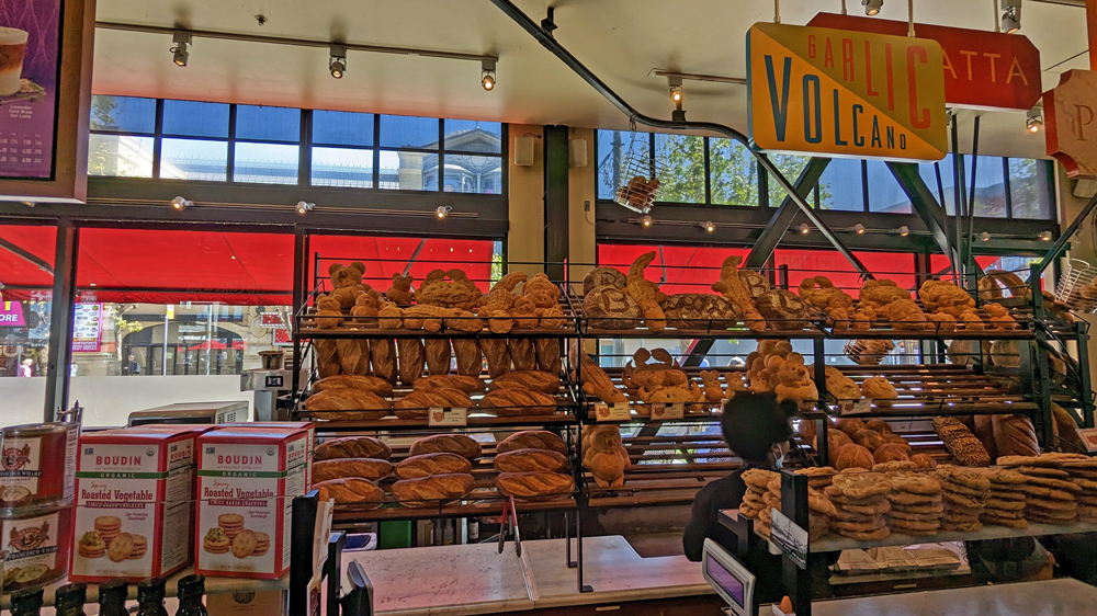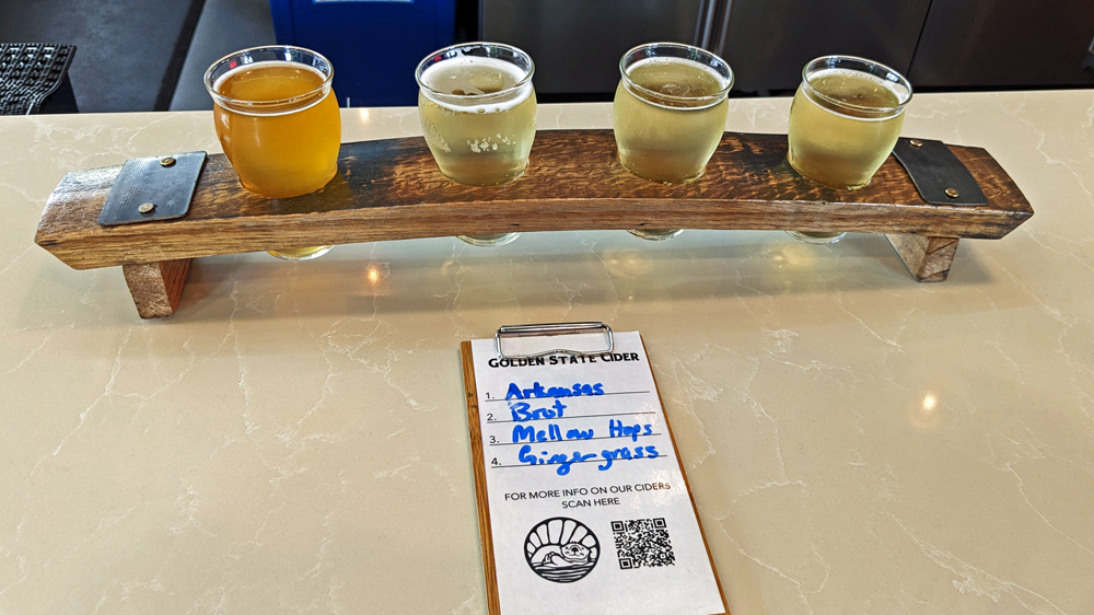 Uns steht heute der Sinn aber nicht nach Wein, sondern nach Cider. Ozy hatte bei einem Grossverteiler einige Büchsen gekauft, die ihm sehr geschmeckt haben. Wir haben dann herausgefunden, dass der Erzeuger, Golden State Cider, in Sebastopol (Kalifornien 😉) einen eigenen Taproom hat, dem wir nun einen Besuch abstatten. Er liegt in «The Barlow», einem Quartier, das nur aus Restaurants, kleinen Läden und Degustationsräumen besteht. Wir bestellen uns bei der netten Dame an der Bar erst mal einen flight und probieren die vier von ihr empfohlenen Cider. Am Schluss entdecken wir, dass sie auch einen echten – und ausgezeichneten! – Apfelbrandy verkaufen sowie einen Apfel-Dessertwein. Den Apfelschnaps müssen wir natürlich auch noch probieren (die Likör-Probe bekommen wir gratis dazu) und was soll ich sagen: wir verlassen den Laden sehr beschwingt mit vollen Tragtaschen und leerem Portemonnaie… Aber wir können stolz darauf sein, haben wir doch mit unserem Kauf zum Erhalt der Gravensteiner Äpfel in der Region beigetragen 😉 ).