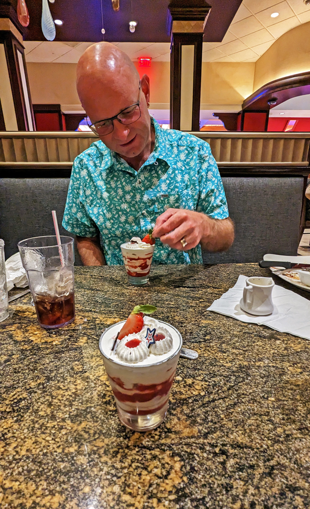 Die nächsten zwei Tage brauchen wir dann Erholung vom Ganzen, ausserdem ist gerade Memorial Day Weekend, wo sowieso alle unterwegs – und alle State Parks ausgebucht – sind, weshalb wir die drei erlaubten Nächte ausnutzen und einfach stehenbleiben. Wir lassen uns an einem Mittag im casinoeigenen Thunder Café mit dem Memorial Day Weekend-Spezialmenü verwöhnen (und haben Glück, gerade noch die beiden allerletzten verfügbaren zu ergattern…) und ich mache jeden Abend einen kleinen Ausflug zum Ben & Jerry’s-Glacéstand… Yummy!