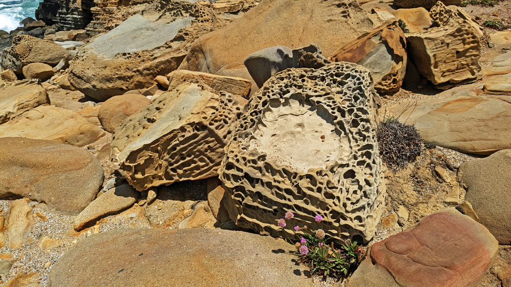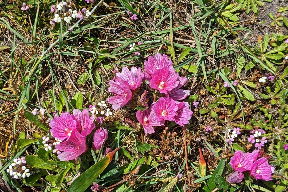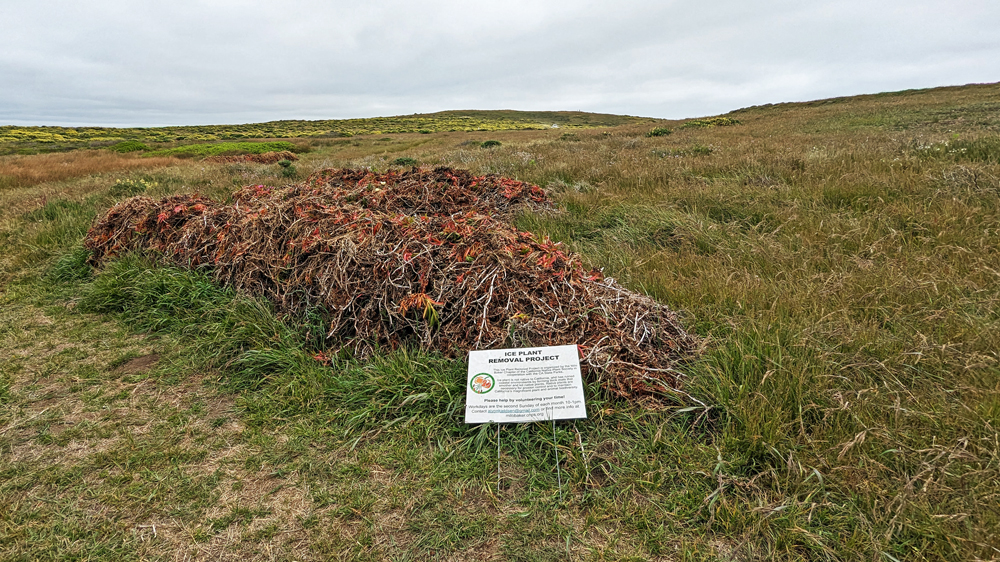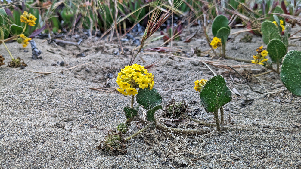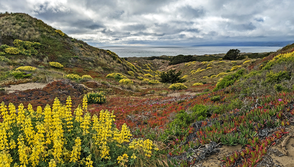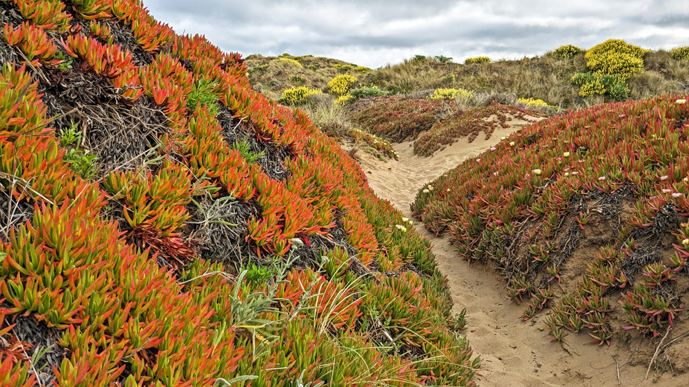 Gut gelaunt treffen wir dann auf dem Bodega Dunes Campground des Sonoma Coast State Park ein, womit wir am Pazifik angekommen sind. Auch hier sind wir wieder unter der Hochnebeldecke. Ich mache eine ausgedehnte Wanderung in die Dünen und trotz fehlender Sonne leuchten die Blumen in allen Farben. Ich kann mich wieder mal nicht satt-fotografieren und bewundere besonders die grossen in weiss, hellgelb, lila und leucht-pink vorkommenden Blumen der auch sonst sehr farbenfrohen dickblättrigen Pflanzenteppiche (wir erfahren dann, dass ausgerechnet diese besonders farbenfrohe Mittagsblume (Carpobrotus), eine invasive Art ist, die man loszuwerden versucht). Da der Weg ausschliesslich aus tiefem Sand bestand, habe ich offenbar mein linkes Knie wieder überlastet (das erste Mal hatte es gegen Ende der 13 h-Wanderung nach Panamint City begonnen zu «stechen», sich aber zwischenzeitlich wieder beruhigt gehabt). Oh well. Wird schon wieder. Einfach etwas schonen…
