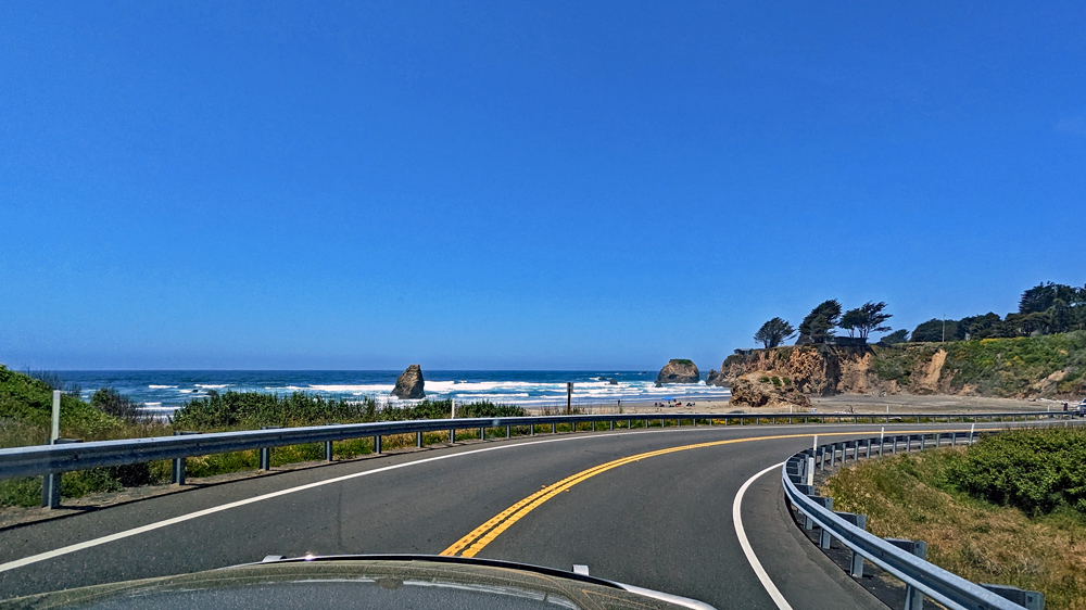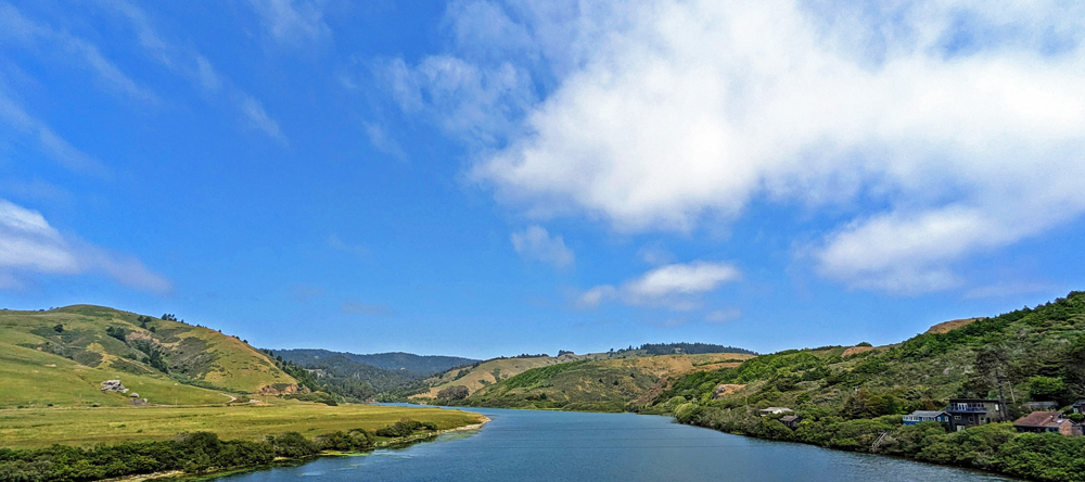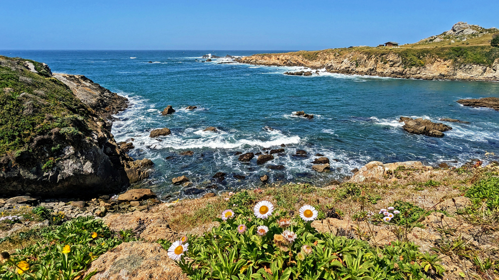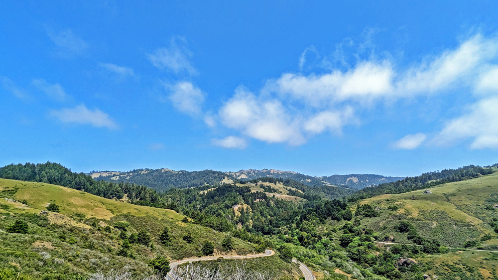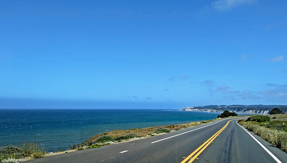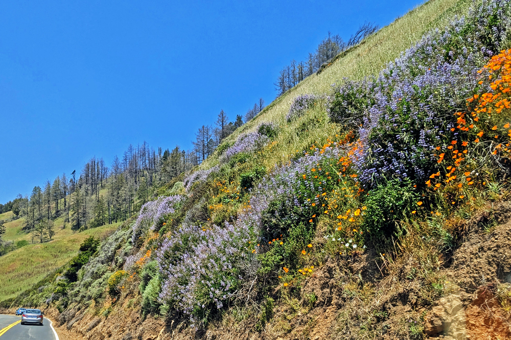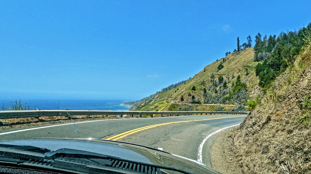 Am nächsten Tag fahren wir auf dem Pacific Coast Highway CA 1 nach Norden. Die Strasse folgt oft dem Küstenverlauf, biegt manchmal aber auch etwas ins Landesinnere ab und bietet dadurch viel Abwechslung. Ausblicke auf die wilde Küste wechseln sich ab mit bergigen Abschnitten, wo es aussieht wie im Appenzell, und Tälern mit blau leuchtenden Flüssen bzw. deren Mündungen. Nur schnell kommt man nicht voran, aber das wollen wir ja auch gar nicht. Besonders schön wird es nämlich, als wir aus dem Bereich der Nebeldecke kommen: Die Farben – und auch die Blumen entlang der Strasse – sind unglaublich intensiv! (Nur bekommt Ozy nicht allzu viel davon mit, da er sich auf die Strasse konzentrieren muss…).