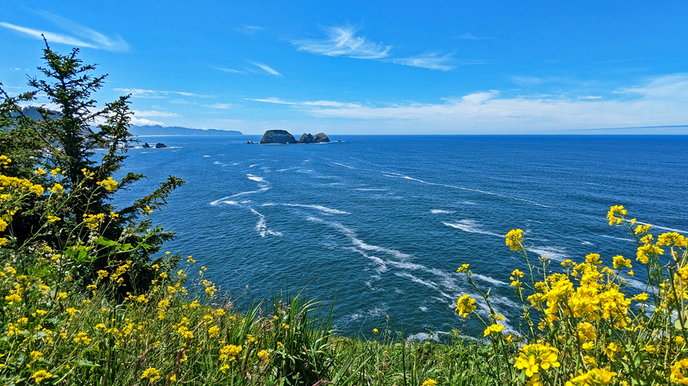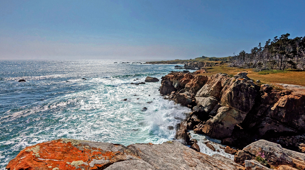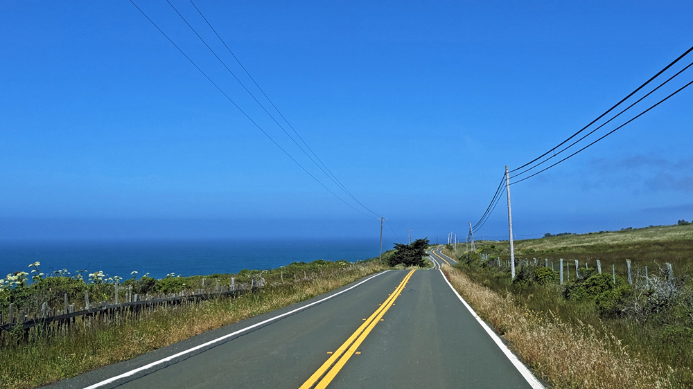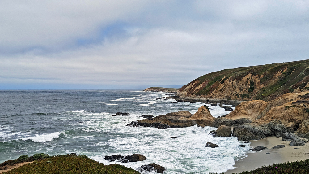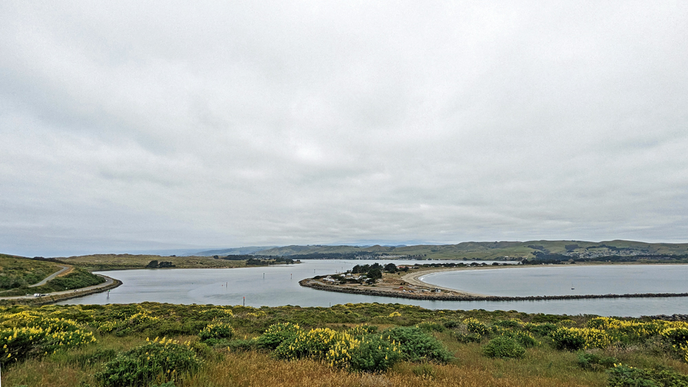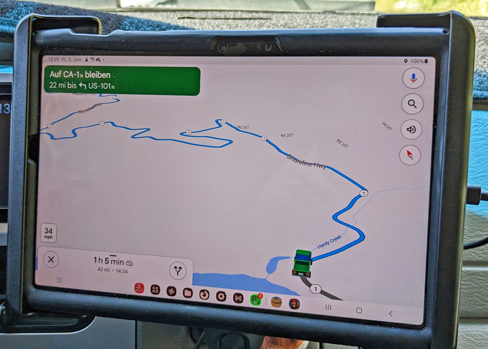 Am nächsten Tag fahren wir auf dem Pacific Coast Highway CA 1 nach Norden. Die Strasse folgt oft dem Küstenverlauf, biegt manchmal aber auch etwas ins Landesinnere ab und bietet dadurch viel Abwechslung. Ausblicke auf die wilde Küste wechseln sich ab mit bergigen Abschnitten, wo es aussieht wie im Appenzell, und Tälern mit blau leuchtenden Flüssen bzw. deren Mündungen. Nur schnell kommt man nicht voran, aber das wollen wir ja auch gar nicht. Besonders schön wird es nämlich, als wir aus dem Bereich der Nebeldecke kommen: Die Farben – und auch die Blumen entlang der Strasse – sind unglaublich intensiv! (Nur bekommt Ozy nicht allzu viel davon mit, da er sich auf die Strasse konzentrieren muss…).