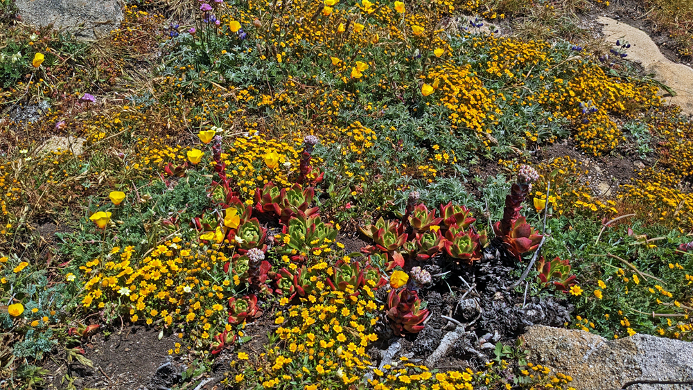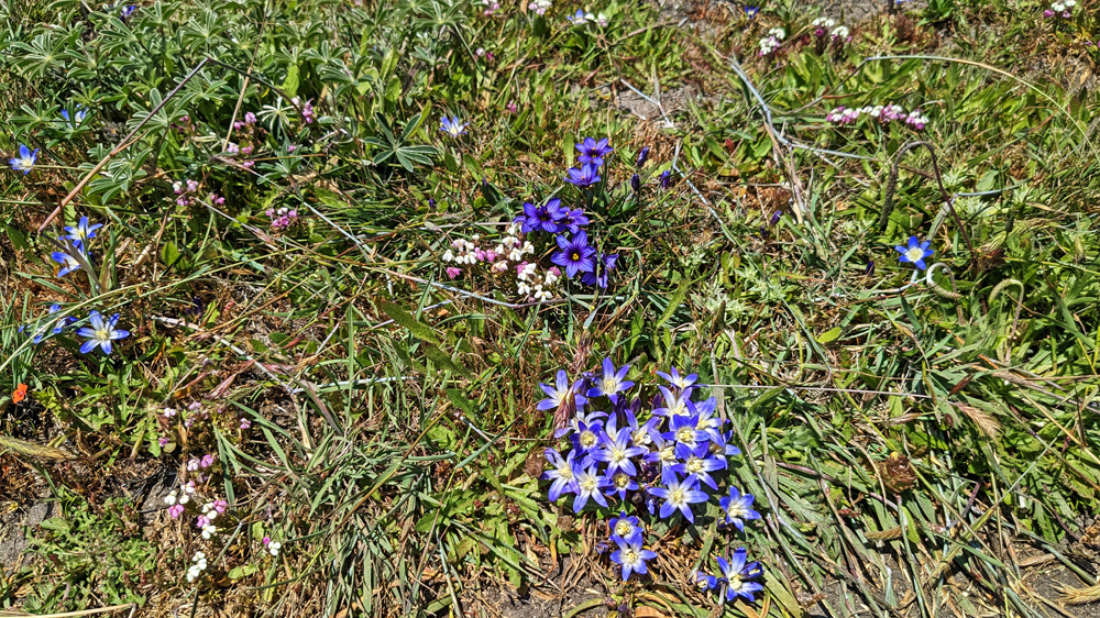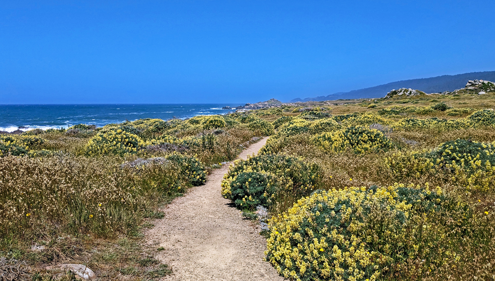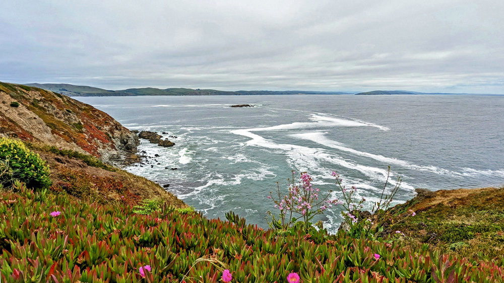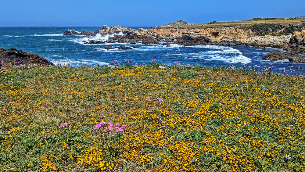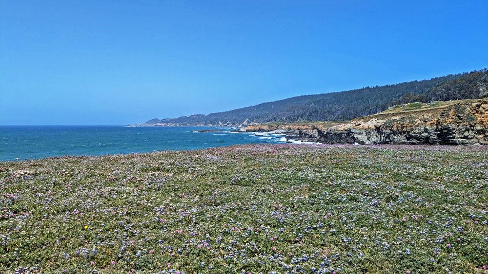 Der erste Teil der Wanderung führt mich auf dem Salt Point Trail entlang der Küste und ist wohl etwas vom Schönsten, was ich je gesehen habe! Der blaue Pazifik, die wilde Brandung, die grüne Küstenebene und vor allem die zahlreichen Blumen sind einfach atemberaubend! Und die Farben sind so intensiv, dass es fast weh tut.