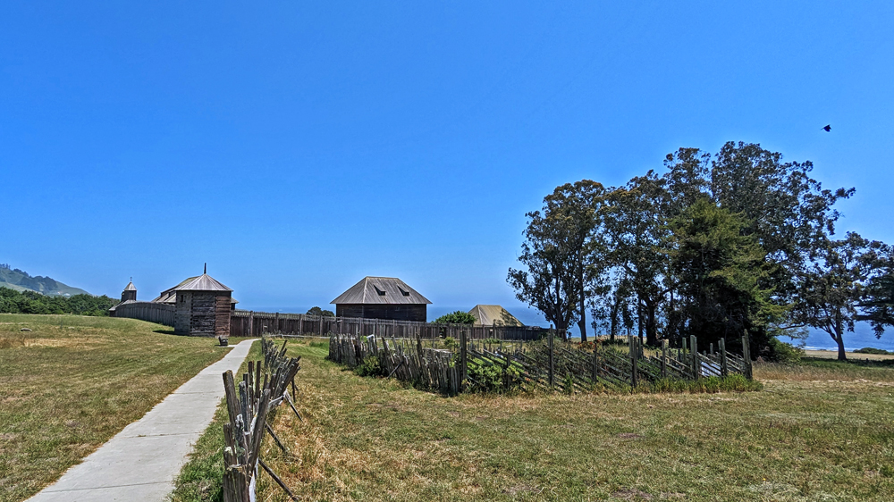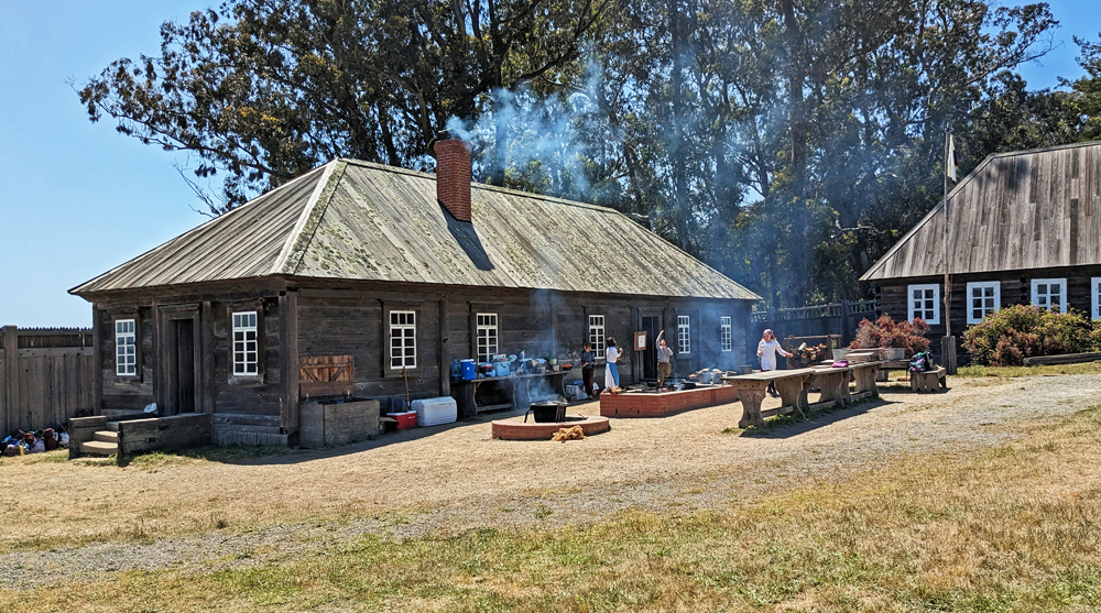 Wir besuchen das interessante Fort Ross, von 1812 bis zu seiner Aufgabe 1841 die südlichste russische Ansiedlung an der amerikanischen Westküste (damals noch spanisch bzw. mexikanisch). Der Ort wurde gegründet, um die russischen Pelzjäger in Alaska zu versorgen, war für Landwirtschaft (ausser Rinderzucht und Apfelbau) allerdings nicht besonders gut geeignet. Stattdessen entwickelte sich der Stützpunkt zu einem wichtigen Handelsposten. Nach der von Russland verodneten Aufgabe wurden die Gebäude und das Land als Ranch genutzt. Aus russischen Besiedlungszeit hat sich das ehemalige Verwaltungsgebäude aus massiven Balken erhalten, dessen Zimmermannsarbeit wir ausgiebig bewundern (die restlichen Gebäude, inklusive der orthodoxen Kapelle sowie einer der beiden ehemaligen Windmühlen, wurden im Lauf der Zeit rekonstruiert).
