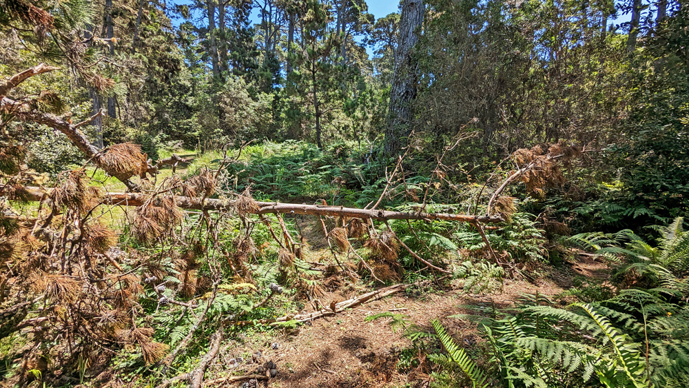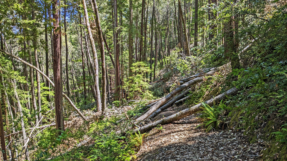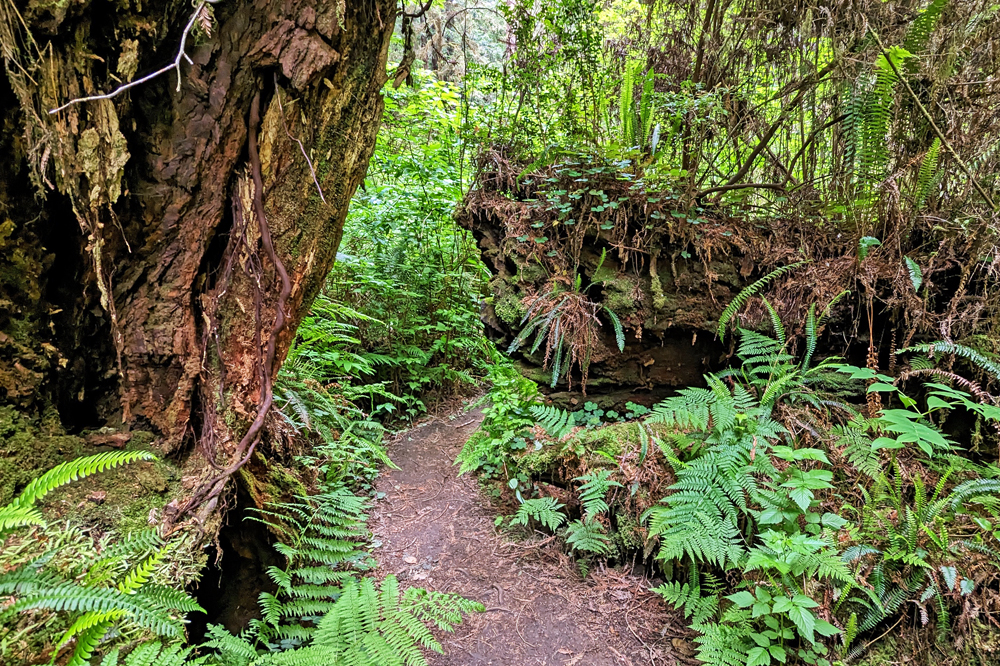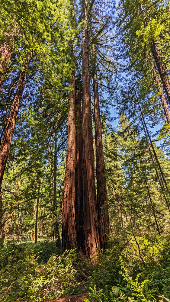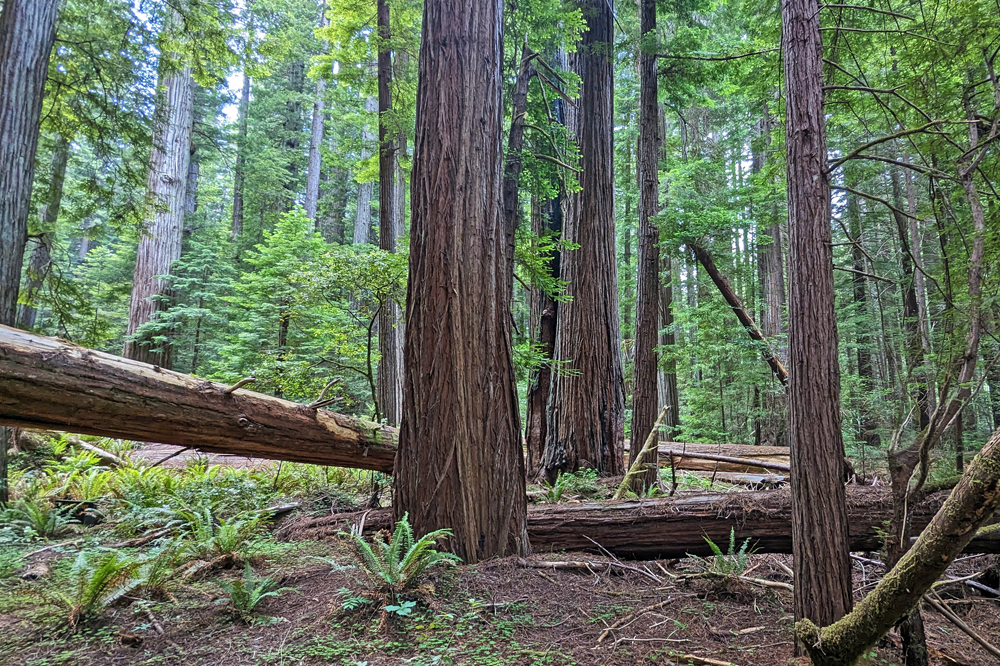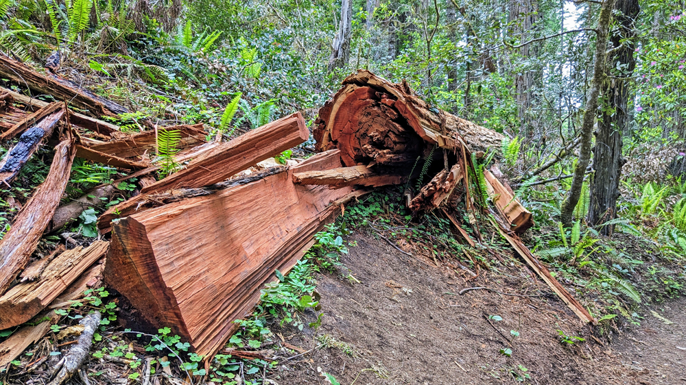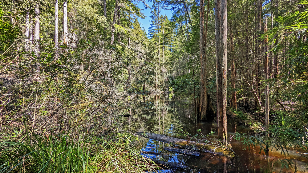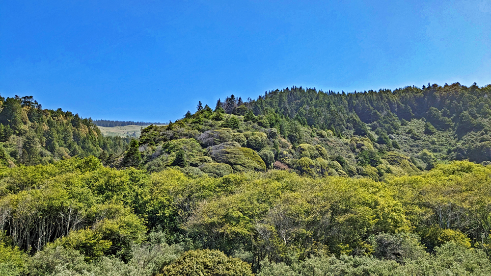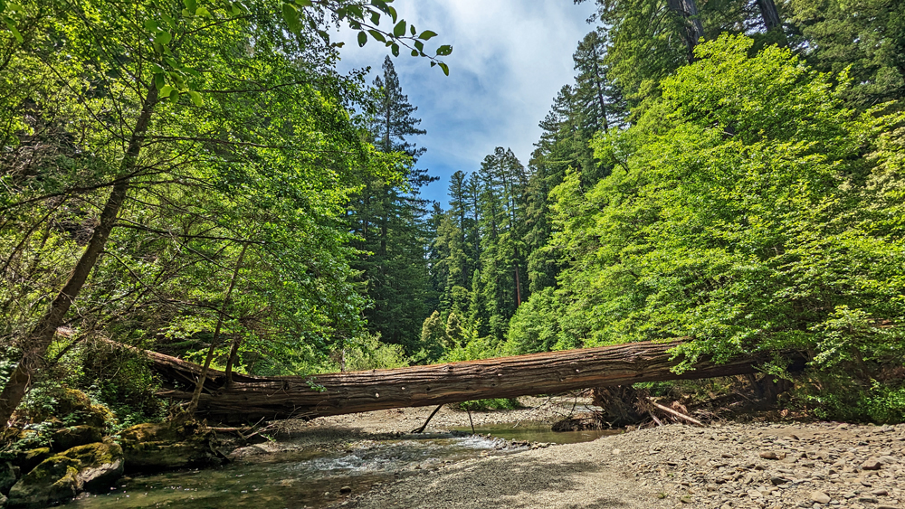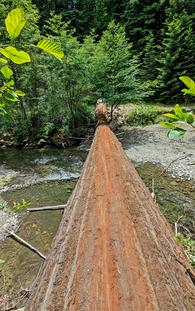 Von der Küste führen ehemaligen Holzfällerstrassen ins steil ansteigende, waldbestandene Hinterland. Auch diese Vegetation ist wunderschön, mit hoch aufragenden Coastal Redwoods und Kiefern, grazilen Madronebäumen (Arbutus menziesii) mit tiefrot leuchtender, seidenglatter Rinde und hellrosa bis pinke Farbtupfer setzenden Rhododendren. Die benachbarte Kruse Rhododendron State Natural Reserve war wegen Sturmschäden geschlossen gewesen und auch hier wären einige Trails aus dem gleichen Grund – und genauso halbherzig – «gesperrt». Aber ausser dem einen oder anderen Stamm, der anhand der bereits darum herumführenden Wege schon länger zu liegen scheint, gibt es keine speziellen Hindernisse. Ich hatte auf der Karte gesehen, dass der nördliche Abschnitt der San Andreas-Verwerfung in der Nähe vorbeiführt und statte auch dieser noch einen Besuch ab. Sie präsentiert sich – entgegen meinen Erwartungen – hier als recht kleines, tiefes Tal mit einem verwunschenen Teich auf dem Grund.