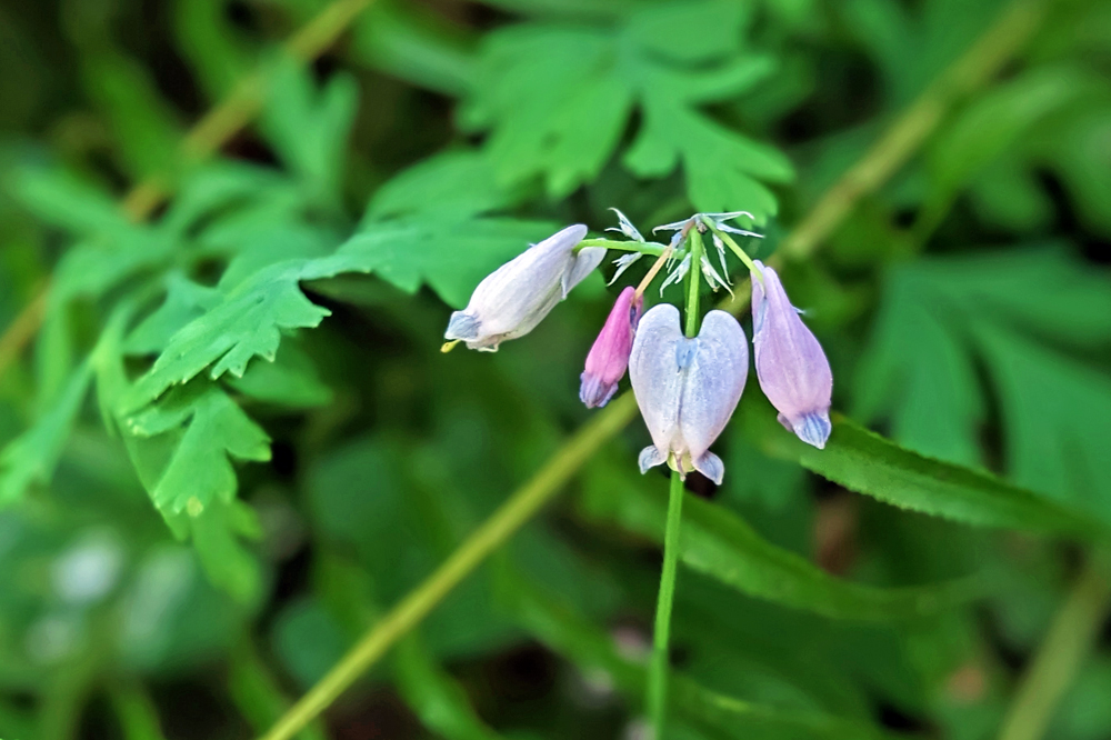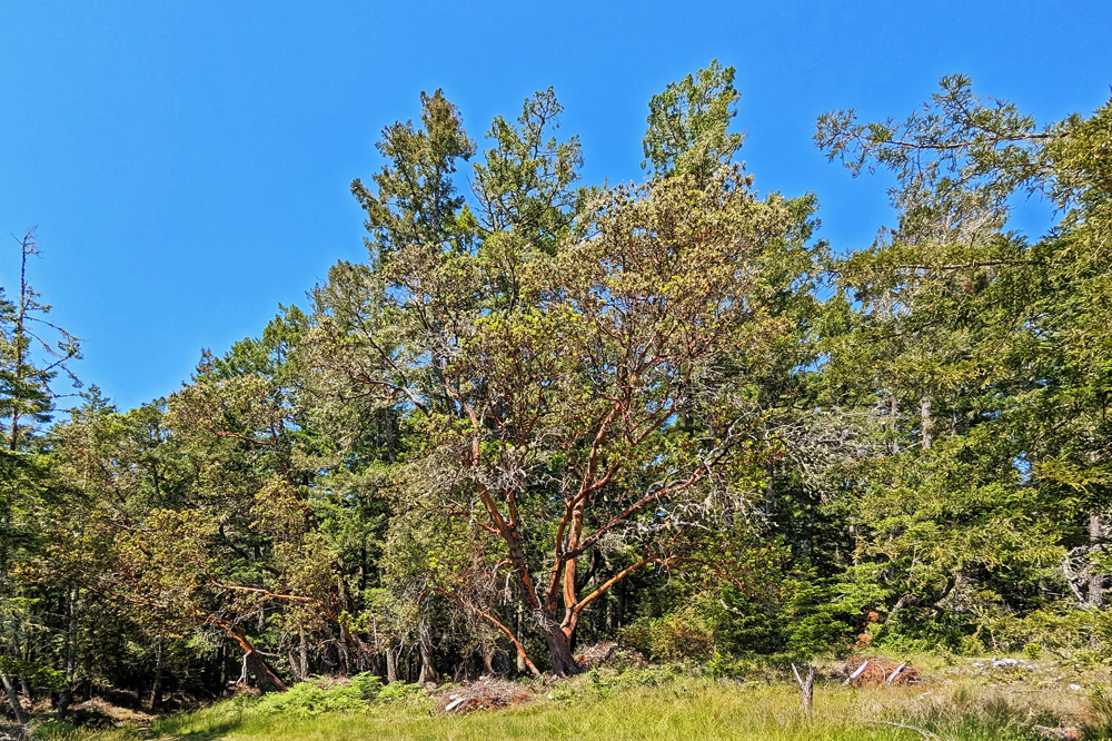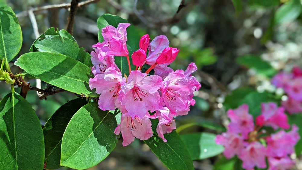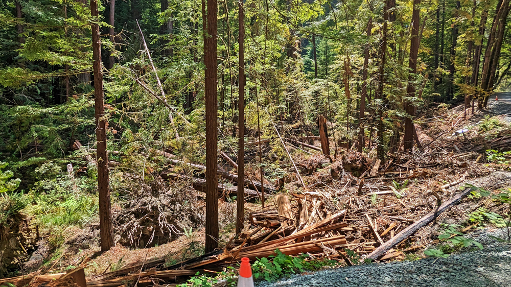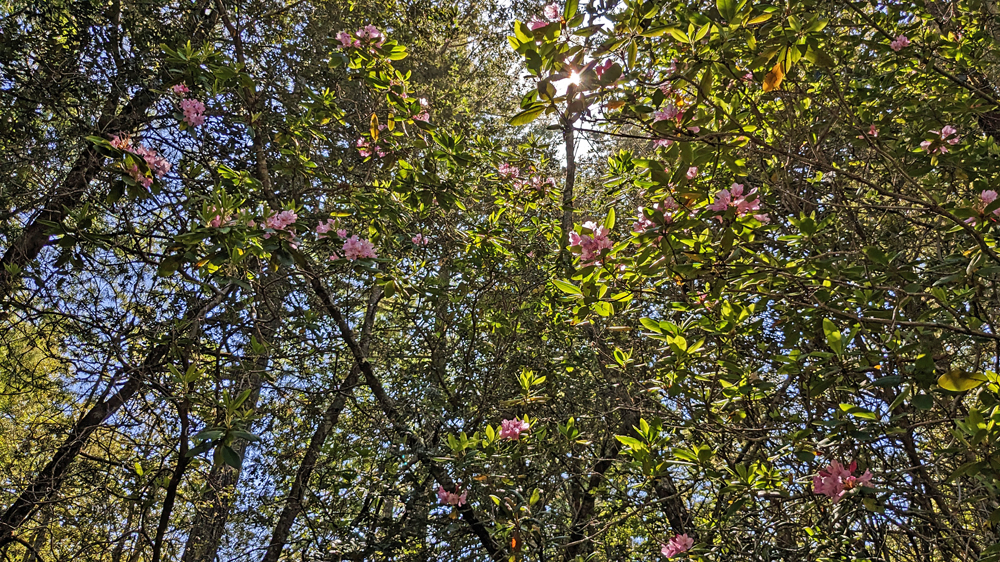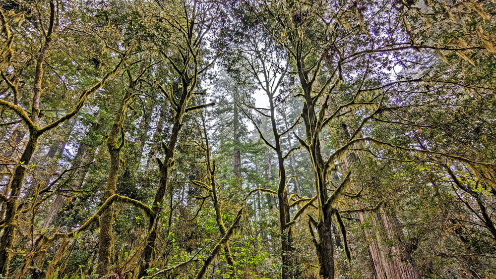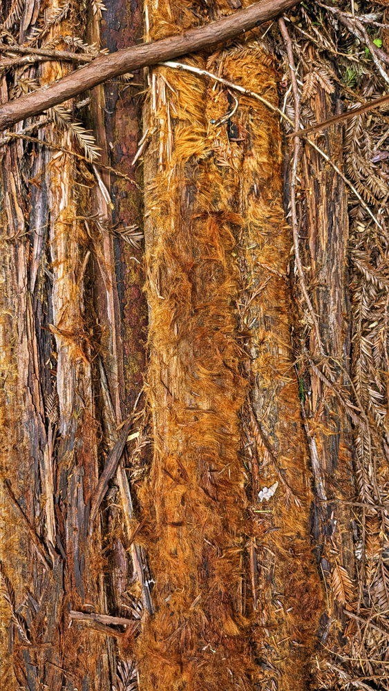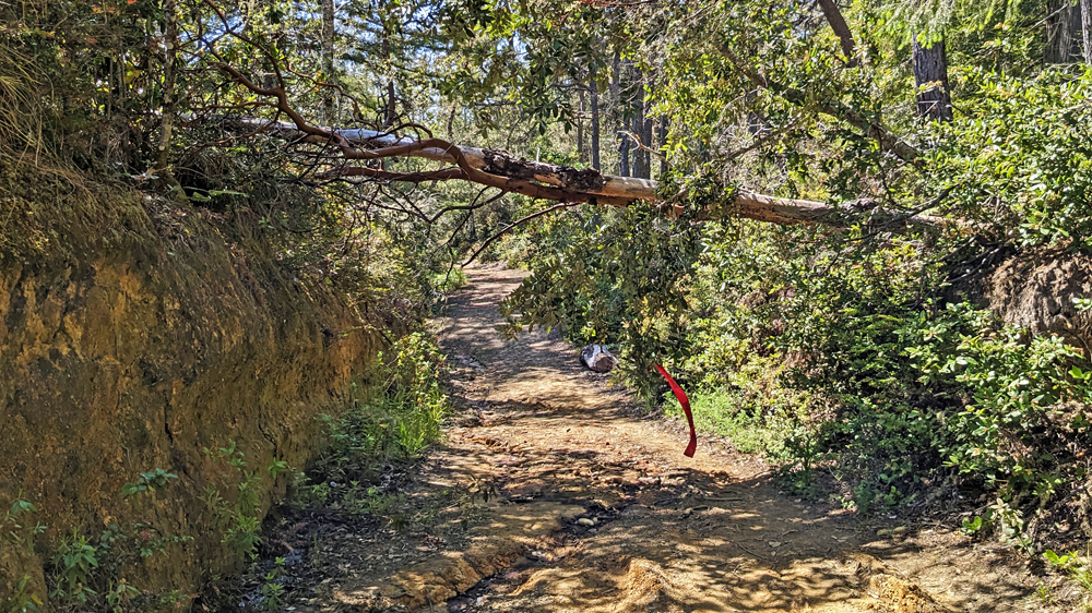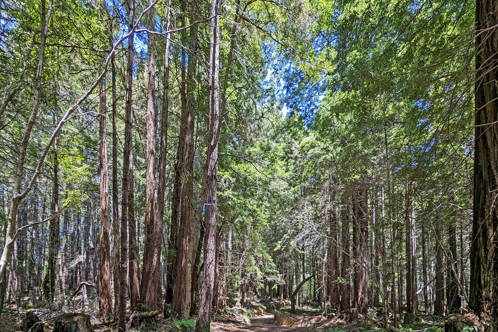 Von der Küste führen ehemaligen Holzfällerstrassen ins steil ansteigende, waldbestandene Hinterland. Auch diese Vegetation ist wunderschön, mit hoch aufragenden Coastal Redwoods und Kiefern, grazilen Madronebäumen (Arbutus menziesii) mit tiefrot leuchtender, seidenglatter Rinde und hellrosa bis pinke Farbtupfer setzenden Rhododendren. Die benachbarte Kruse Rhododendron State Natural Reserve war wegen Sturmschäden geschlossen gewesen und auch hier wären einige Trails aus dem gleichen Grund – und genauso halbherzig – «gesperrt». Aber ausser dem einen oder anderen Stamm, der anhand der bereits darum herumführenden Wege schon länger zu liegen scheint, gibt es keine speziellen Hindernisse. Ich hatte auf der Karte gesehen, dass der nördliche Abschnitt der San Andreas-Verwerfung in der Nähe vorbeiführt und statte auch dieser noch einen Besuch ab. Sie präsentiert sich – entgegen meinen Erwartungen – hier als recht kleines, tiefes Tal mit einem verwunschenen Teich auf dem Grund.