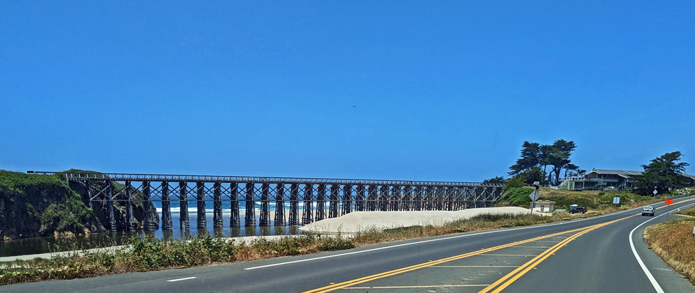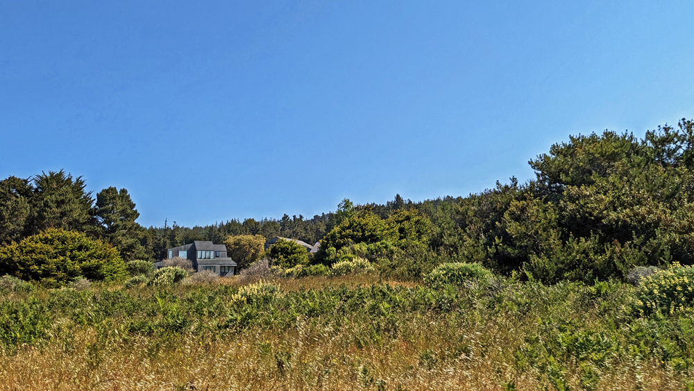 Am nächsten Tag geht es weiter auf dem Coast Highway. Auf einem etwa 16 km / 10 mi langen Abschnitt fallen uns speziell gebaute Häuser, weisse Pfosten mit Strassennamen und Tafeln mit dem Namen «The Sea Ranch» auf. Wir wundern uns über diese gleichzeitig wild und organisiert scheinende Ansiedlung und erfahren dann aus dem Internet, dass es sich dabei tatsächlich um eine spezielle Siedlung handelt, die in den 1960er Jahren mit dem Ziel gegründet wurde, in Harmonie mit der Landschaft und Umwelt zu leben und deren Vorgaben jeder neue Bewohner zwingend befolgen muss (Über die Sea Ranch und Living at The Sea Ranch).