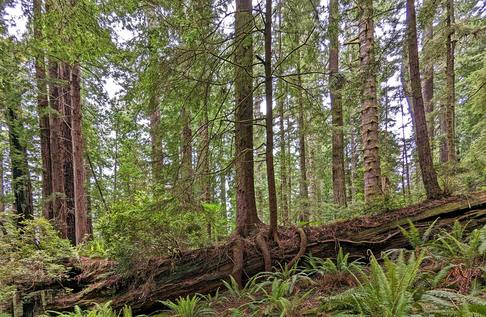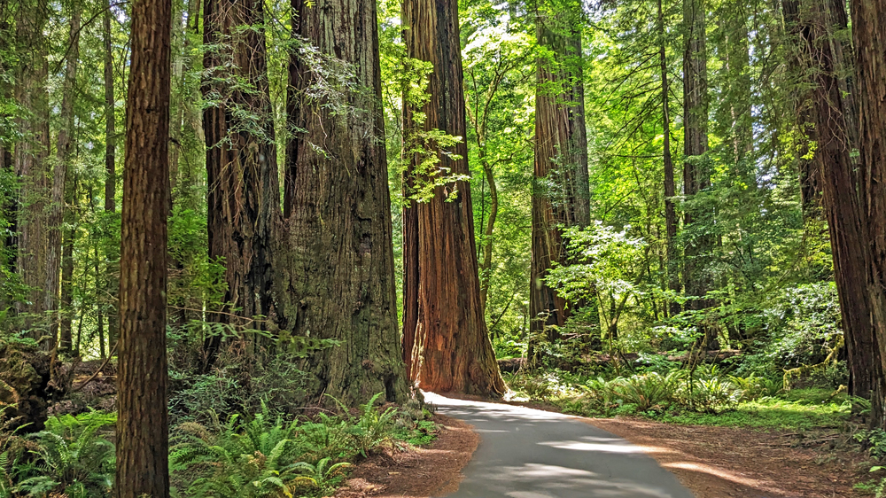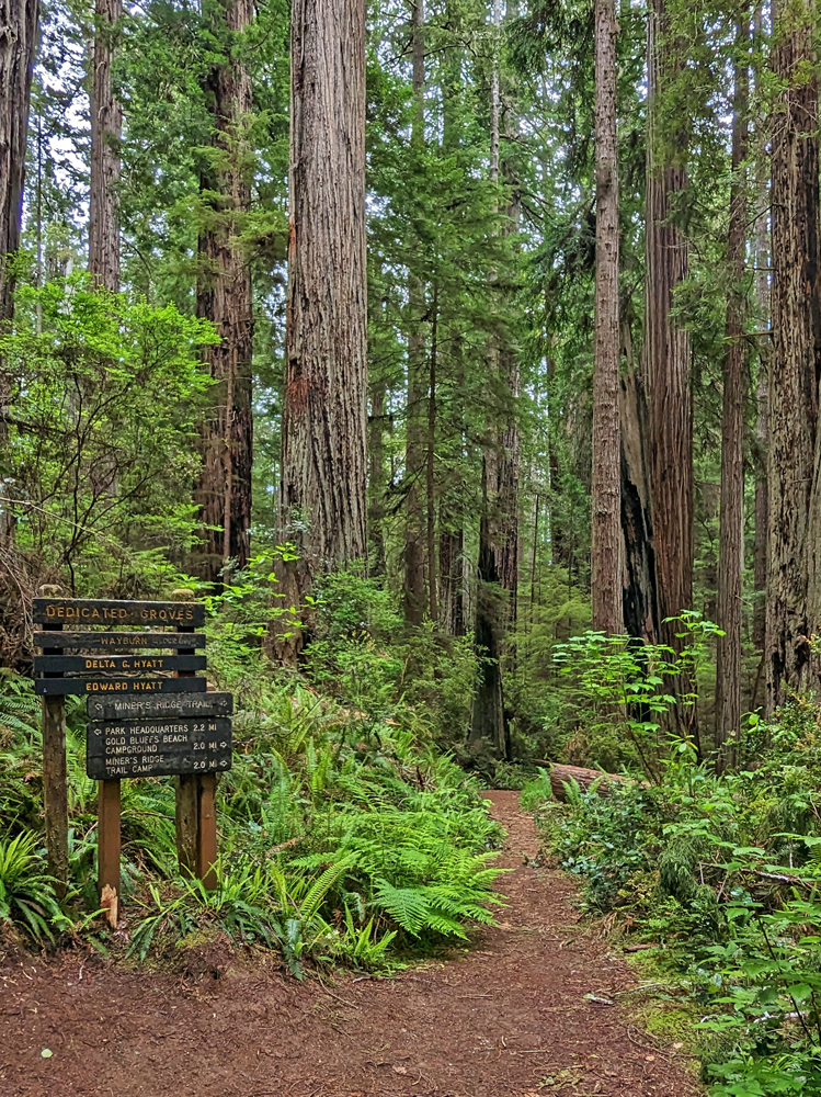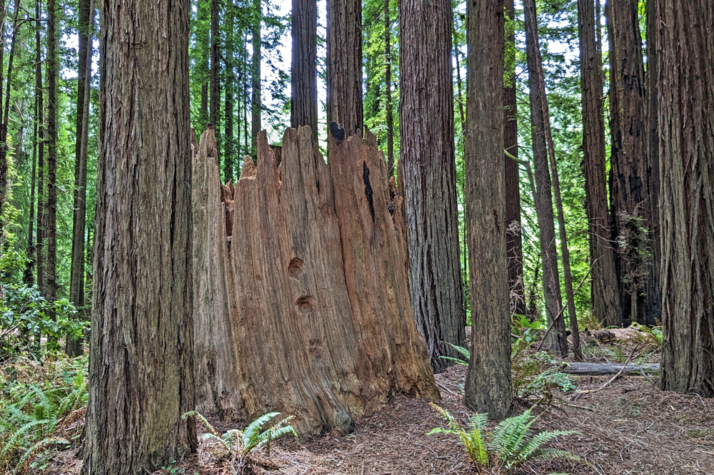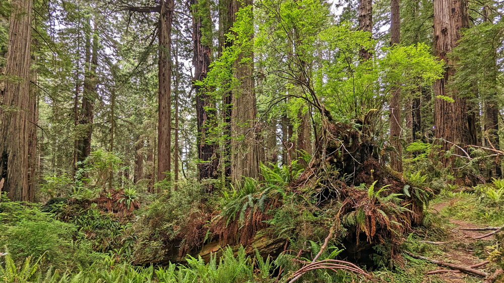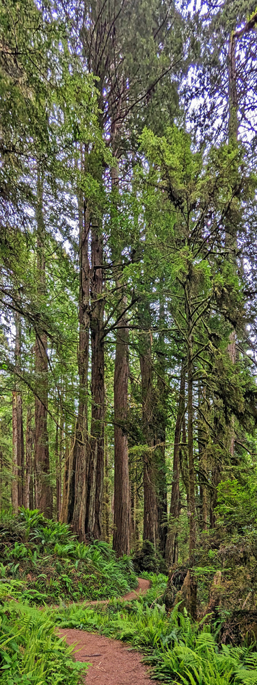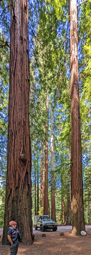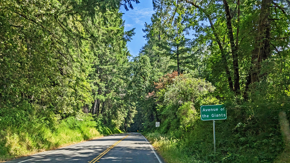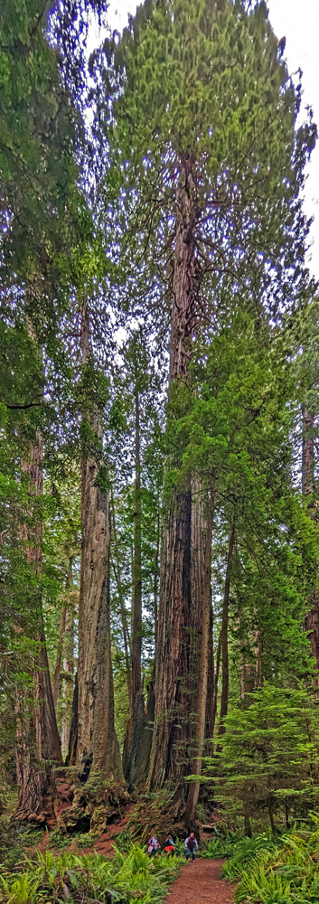 Nun geht es weiter auf der sogenannten Avenue of the Giants, die als Scenic Highway parallel zur CA 101 durchs South Fork Eel River-Tal läuft. Den Namen hat sie von den riesigen Küstenmammutbäumen (Sequoia sempervirens), die hier wachsen. Diese zählen mit über 110 m Höhe und Stammdurchmessern bis 9 m zu den höchsten Bäumen der Welt und sind auch sehr langlebig: der älteste bisher datierte ist rund 2200 Jahre alt. Sie sind vom Küstennebel abhänging und kommen deshalb auch nur in einem rund 750 km / 470 mi langen Streifen entlang der Pazifikküste Nordkaliforniens und Südoregons vor. Sie zählen aufgrund ihrer Grösse, geraden Wuchses, Dauerhaftigkeit, Astreinheit und technischen Eigenschaften zu den besten Nutzhölzern und werden, da sie zudem verhältnismässig schnell wachsen, auch noch heute kräftig für die Holzindustrie genutzt. Inzwischen sind aber einige alte, noch nie abgeholzte Bestände geschützt (sogenannte old growth groves). Sie haben sich vor allem in tiefen Tälern erhalten, die für die Holzfäller nur schlecht zugänglich waren. Die meisten und höchsten Bäume finden sich im Humboldt Redwoods State Park und im Gebiet Redwood National and State Parks, die wir beide besuchen.