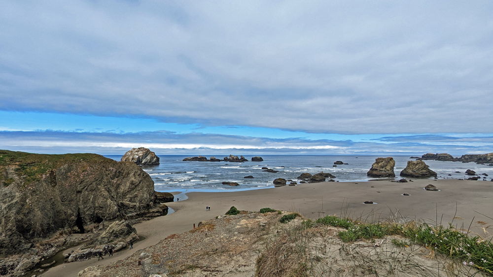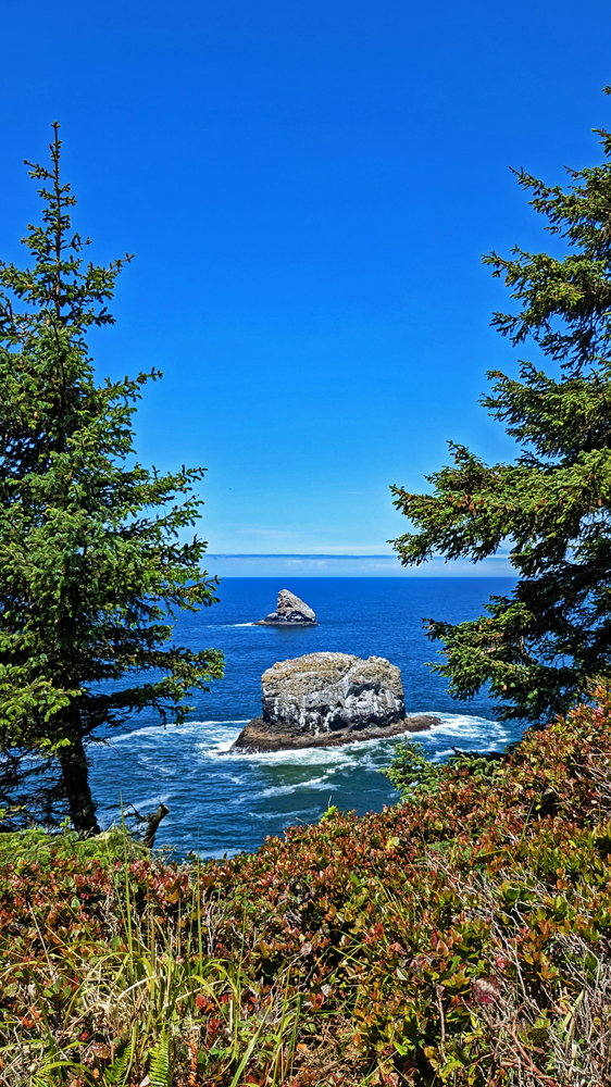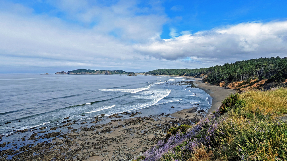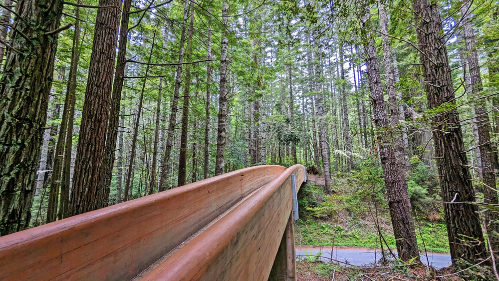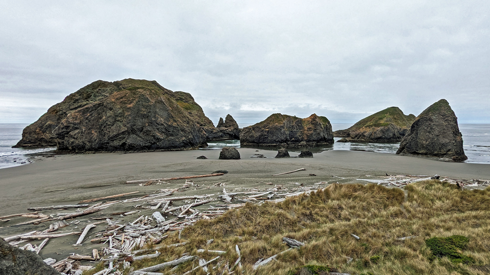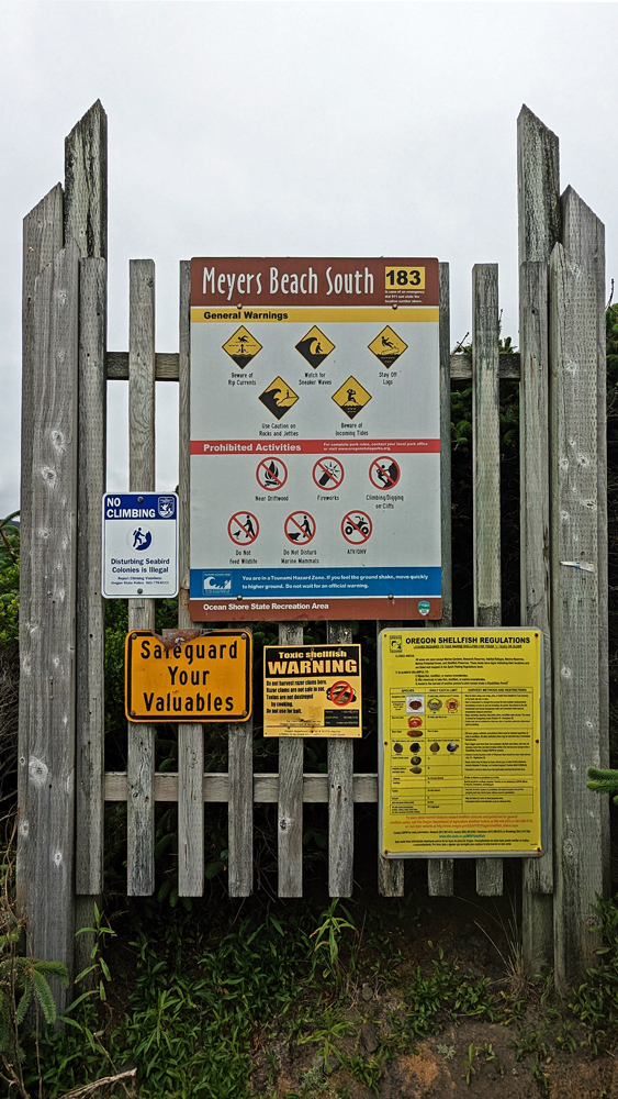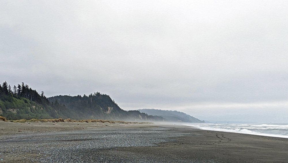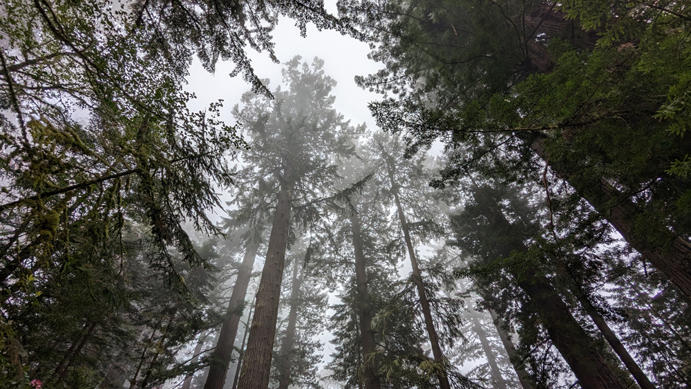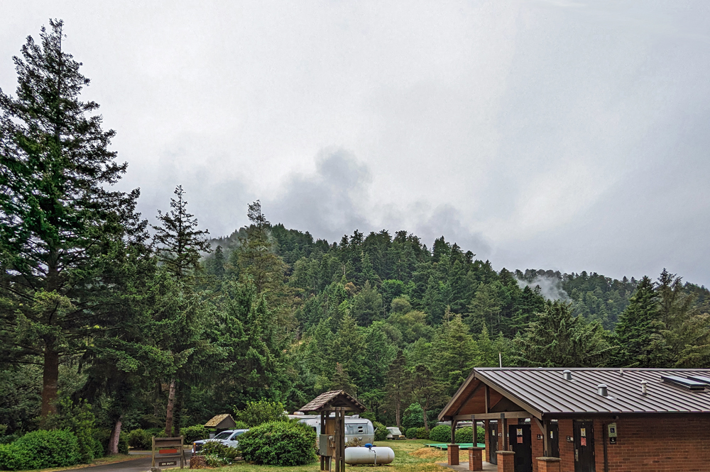 Am nächsten Tag ist das Wetter dann so richtig mystisch-neblig. Wir verlassen die Redwood-Schutzgebiete und gelangen bald nach Oregon, wo wir im Humbug Mountain State Park übernachten. Die Unterschiede von den Oregon zu den California State Parks sind schon beim ersten Aufenthalt offensichtlich: gut gepflegt, keine Münzduschen mehr (juhuuu!) und zwei bis drei Camp Hosts auf dem Platz. Ich hätte gerne eine Wanderung auf den gleichnamigen Berg gemacht, lasse es aber, weil die Spitze irgendwo im dichten Nebel verborgen ist.
