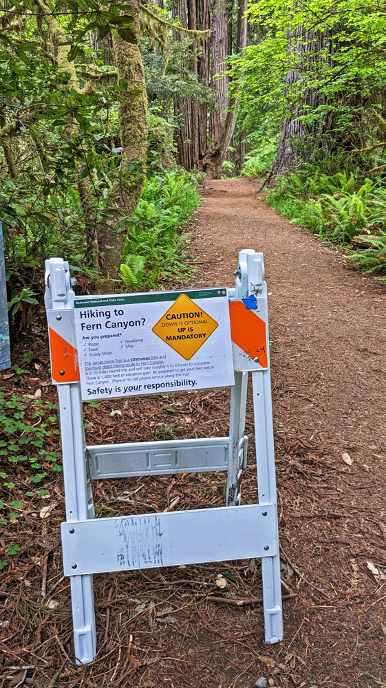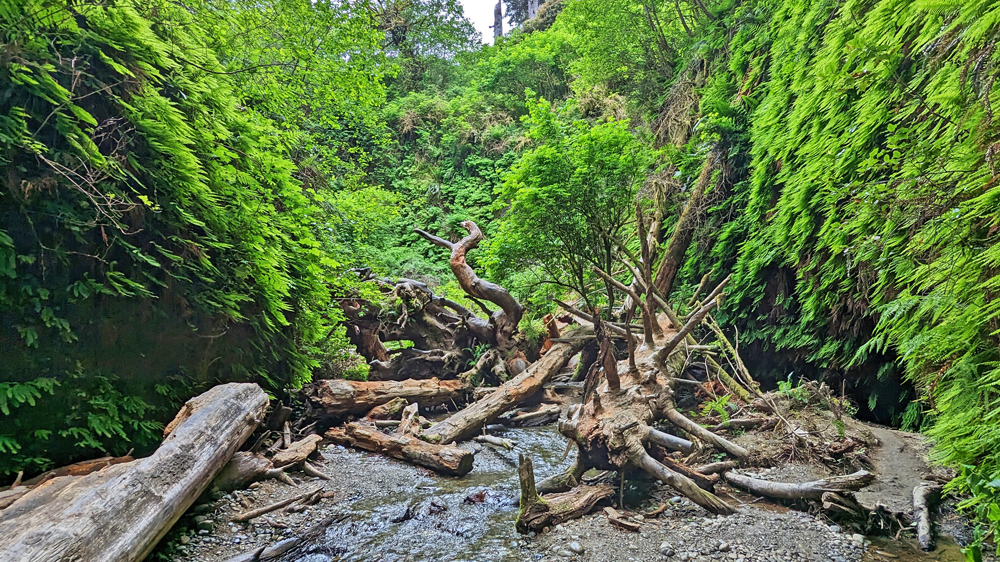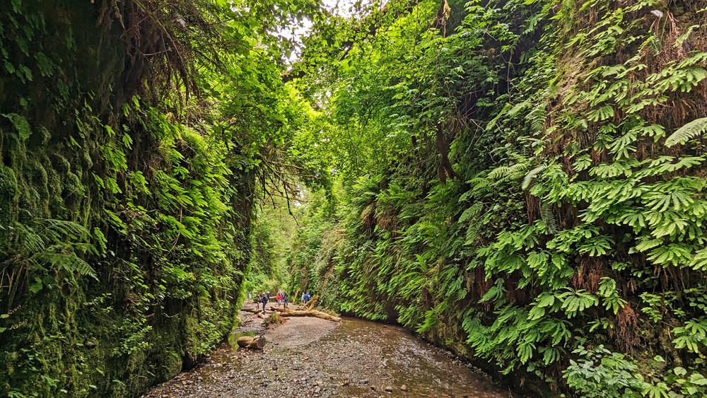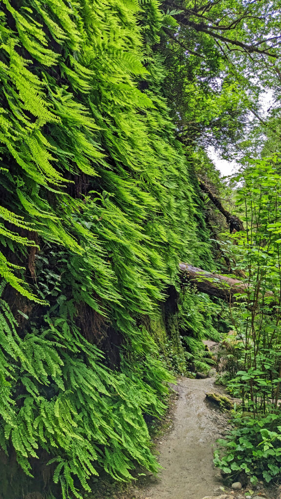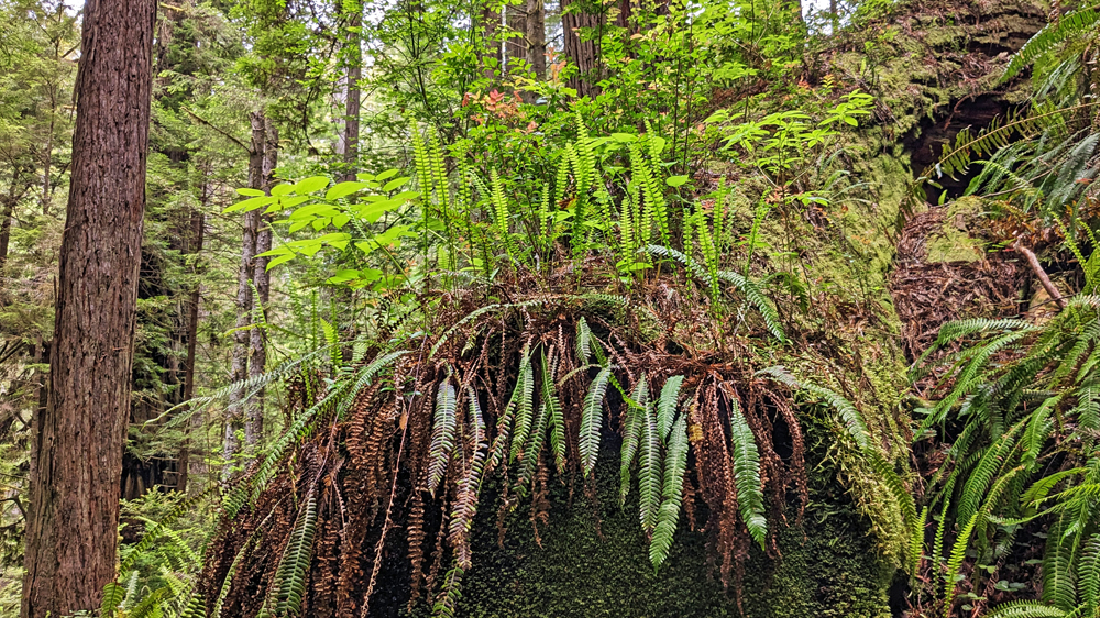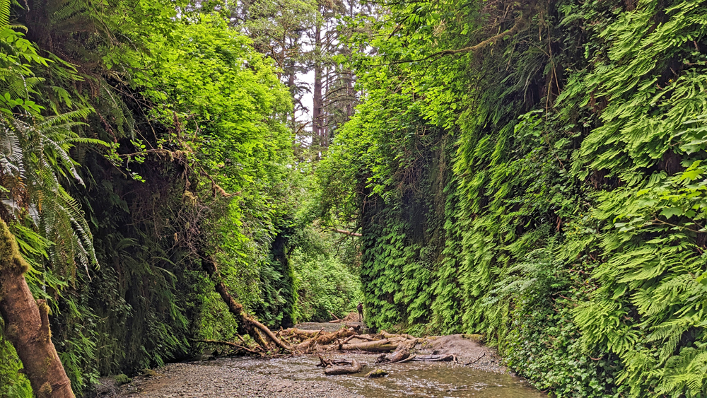 Nur die Übernachtungssituation ist leider nicht ganz einfach. Wir sind hier einem allseits beliebten Gebiet (kein Wunder…) und offenbar haben gerade die Schulferien begonnen. Eine Nacht kommen wir relativ kostengünstig bei den Fairgrounds von Ferndale CA unter, einem leider etwas verlassen wirkenden Städtchen, das für seine vielen viktorianischen Häuser bekannt ist. Bei den Redwood National and State Parks wird es allerdings dann ganz schwierig: Die Campgrounds sind komplett ausgebucht und ein noch recht leer aussehender, privater Campground gleich ausserhalb der Parkgrenze ist leider auch schon besetzt. Als wir überlegen, was wir jetzt machen sollen, kommt ein freundlicher Herr auf uns zu, der sich für unser Gefährt interessiert. Er bekommt schnell mit, was los ist und lädt uns ein, uns die beiden gewünschten Nächte zu ihm auf den Platz zu stellen – so lieb!!! (Die Campground-Betreiber wollen dann übrigens trotzdem 25.-$/Nacht von uns und auch noch ohne Infrastruktur…!!!). Unser Retter Dallin (The Diesel Family) ist mit seiner Familie sowie einer zweiten Familie unterwegs und Ozy verbringt zwei schöne Abende mit ihnen am Lagerfeuer. Ich gehe beide Abende recht früh ins Bett – das eine Mal, weil ich am nächsten Tag eine lange Wanderung vorhabe und am nächsten Abend wegen der langen Wanderung… Diese war es aber wert: sie führt vom Prairie Creek Visitor Center auf insgesamt 18 km und 451 m Höhenunterschied über den Miner’s Ridge Trail und James Irvine Loop durch old und second growth-Wälder zur Küste und zurück. Das Highlight ist dabei der Fern Canyon, der sogar über eine lange, schmale und kurvige Strasse erschlossen wäre. Aufgrund dessen Beliebtheit wird pro Tag allerings nur eine bestimmte Anzahl permits vergeben und wir waren natürlich zu spät… Der Canyon ist auch so noch sehr gut besucht, aber mit seinen dicht bewachsenen, fast geraden Wänden trotzdem sehr beeindruckend! Und obwohl ich auch nach 15 km schon genug gehabt hätte, war die ganze Wanderung einfach wunderschön.
