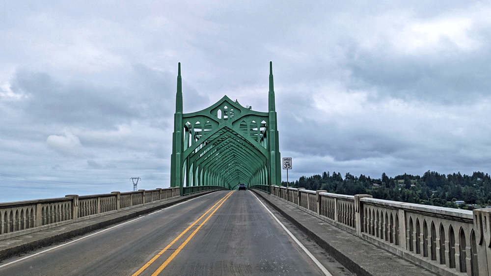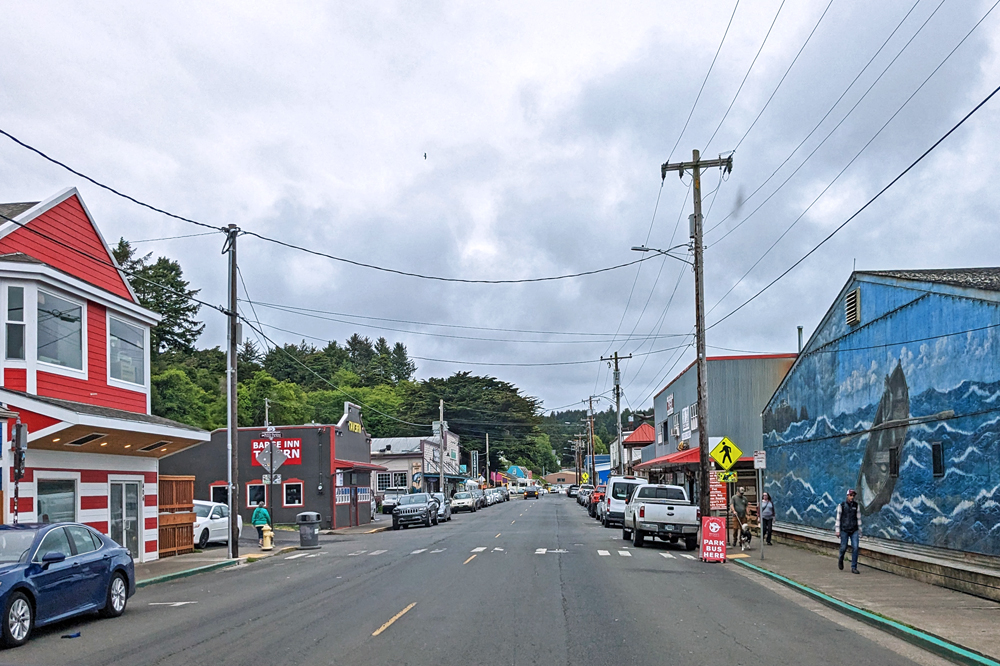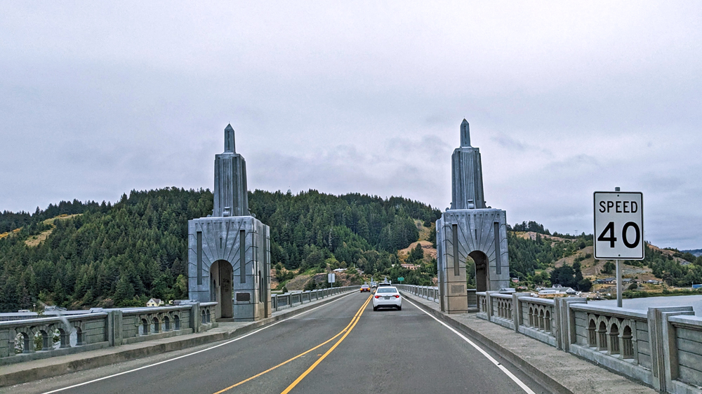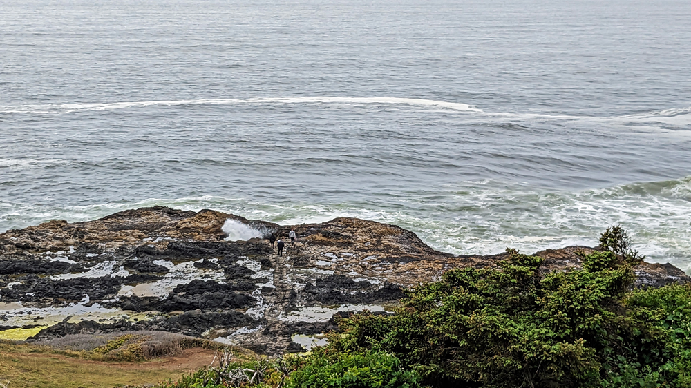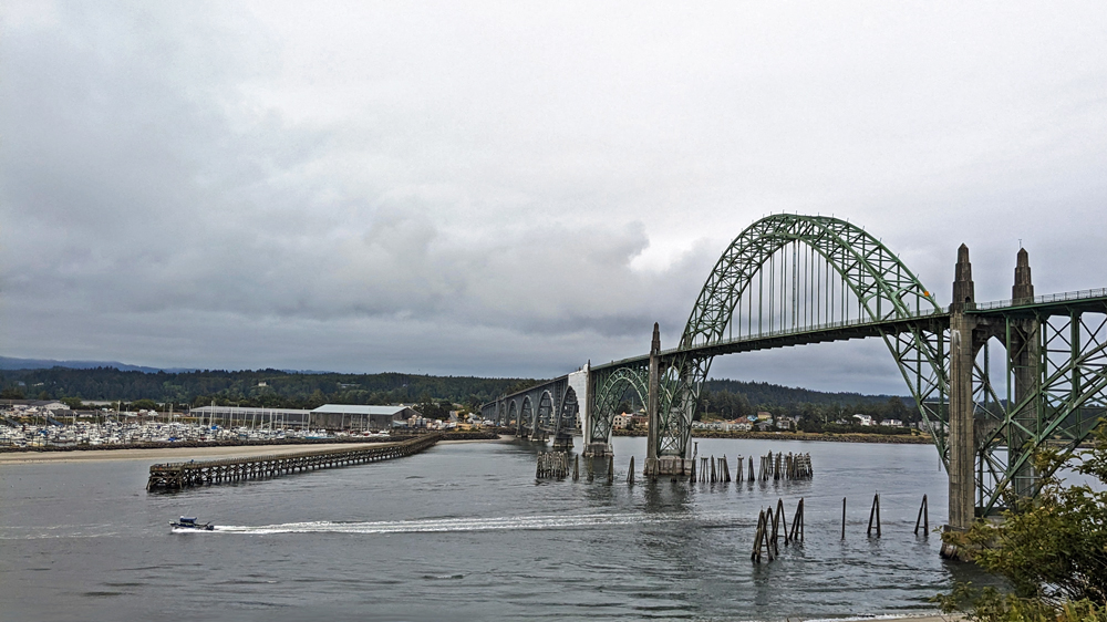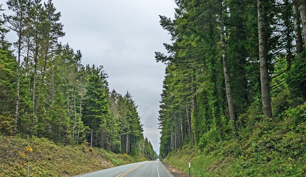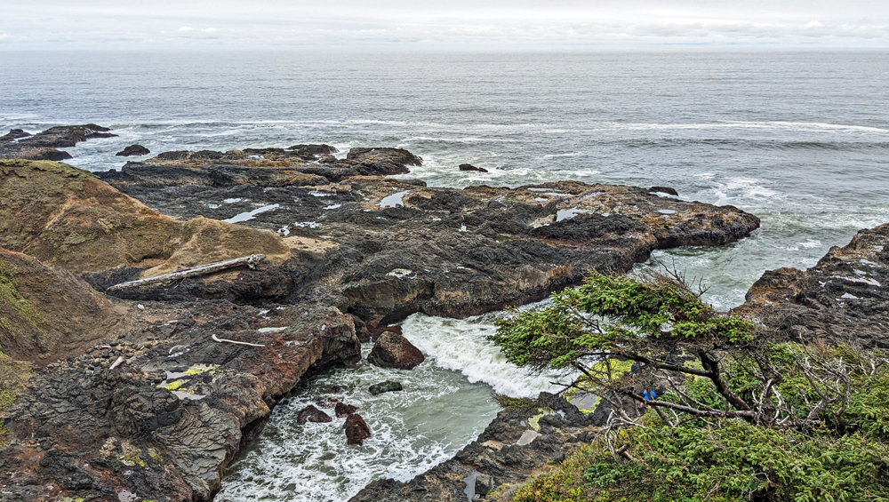 Die OR 101 ist ein Stückchen von der Küste entfernt, es gibt aber immer wieder (mehr oder weniger überwachsene) Ausfahrten oder kleine State Parks oder State Scenic Viewpoints, wo man einen besonders schönen Blick auf die Klippen und vorgelagerten Felsen hat. Ansonsten viele Waldfelder, kleinere Seen, Sanddünen, die eine oder andere Sägerei sowie einige grössere Orte an grossen Flüssen mit Häfen und Holz-Verladestationen. Das Wetter ist meistens grau, kalt und neblig, aber zwischendurch gibt es ab und zu auch mal ein kleines Wolkenloch. Beim Cape Perpetua, wo die Küste eine ganz besondere Form hat, gucken wir uns Thor’s Well und das Spouting Horn an. Wir sind zwar nicht zur richtigen Zeit da, um die beiden Gezeitenphänomene beobachten zu können (und das Wetter ist alles andere als freundlich), aber auch so ist das Schäumen und Wirbeln des Wassers in den engen Buchten beeindruckend. In Newport machen wir einen Ausflug an die Waterfront, ein interessanter Mix aus Tourismus und aktiver Fischerei, haben aber keine Lust, das warme Auto zu verlassen…