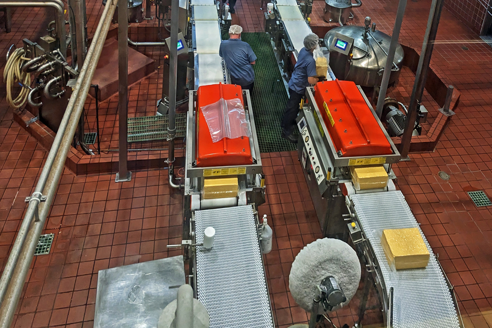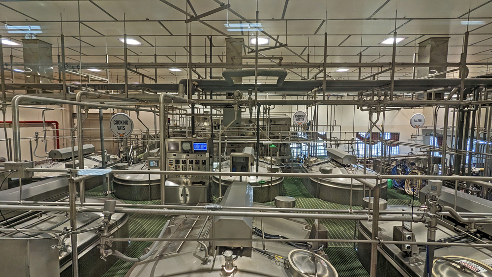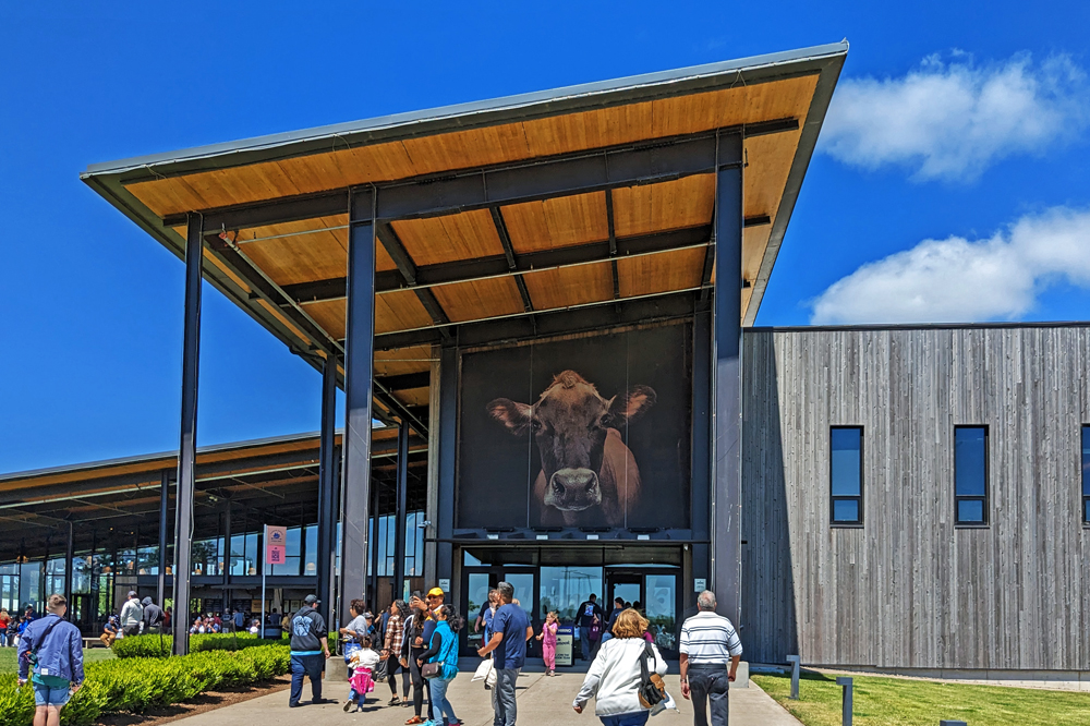 Auch bei der Tillamook Creamery spielt sich dann natürlich einiges ab. Die Firma ist aber so gross und so bekannt (ihre Produkte bekommt man im ganzen Westen der USA), dass sie ein grosses Besucherzentrum mit Besuchergalerie gebaut haben, von wo aus man die Herstellung des Cheddar Cheese mit Erklärungen beobachten kann. Der Prozess unterscheidet sich insofern vom uns bekannten, als dass der aus gesäuerter Milch gewonnene, gesalzene Käsebruch (curds) abgetropft, mechanisch miteinander «verschmolzen», gezogen und gewendet (drain, knit, stretch and flip, das sogenannte «cheddaring»), in Stücke geschnitten und schliesslich durch sein eigenes Gewicht in 20 kg-Blöcken gepresst wird. Diese werden eingeschweisst und dann so gelagert (also kein Käser, der liebevoll seine Laibe mit Salzlake bürstet… 😉 ). Nach der Lagerzeit (je nach Sorte von 60 Tagen bis 5 Jahre) werden die Blöcke ausgepackt, portioniert und für den Handel verpackt (das meiste wird von Robotern erledigt. Die Menschen dürfen vor dem Verpacken noch von Hand Käse dazufügen, wenn das Gewicht nicht stimmt). Cheddar gibt es übrigens «weiss» und – bei uns bekannter – orange. Der Geschmack ist der gleiche und wird durch Annatto, gewonnen aus den Samen des gleichnamigen Strauches (achiote tree, Bixa orellana) erzeugt. Der Hintergrund ist offenbar, dass man dem Käse eine einheitliche Farbe (unabhängig vom Rahmgehalt) geben wollte. Inzwischen hat sich die Farbe wohl ein bisschen verselbständigt, so dass der Cheddar heute ein richtig sattes Orange aufweist.