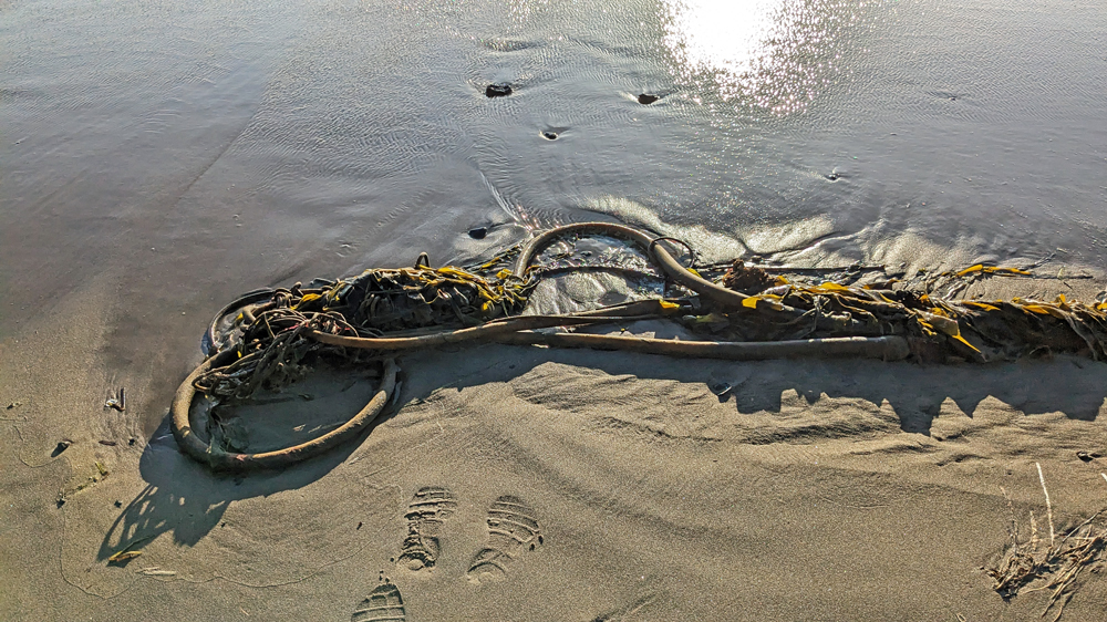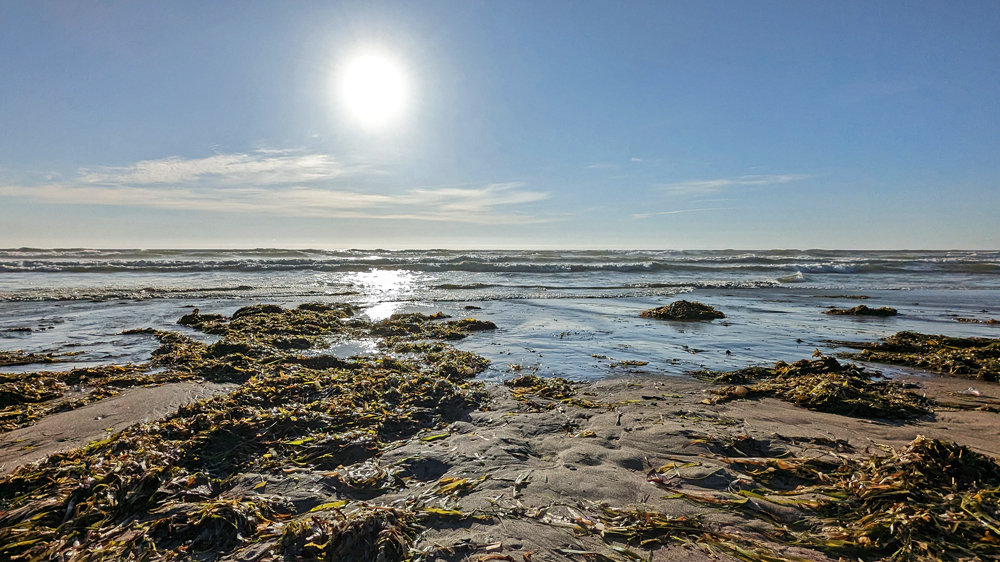 Nachdem wir mit Probierportionen «angefixt» worden sind, geht es in den riesigen Verkaufsladen, wo man nicht nur alle ihre Milchprodukte (vom Käse über Butter und Joghurt bis zur Glacé), sondern auch noch viele andere schöne und teure regionale Produkte für den Magen und für die Küche… Wir erstehen verschiedene Cheddar Cheese. Die meisten bekommt man auch in den Grossverteilern, aber wir erstehen auch einen «Maker’s Reserve» Jahrgangskäse, den man sonst nicht so einfach bekommt (Als wir ihn dann einige Tage später verkosten sind wir begeistert: der white cheddar von 2013 schmeckt ähnlich wie sehr gut gereifter Gruyère bei etwas cremigerer Konsistenz). Jetzt haben wir natürlich Hunger, weshalb wir in der angehängten «Dining Hall» etwas Passendes bestellen – Ozy nimmt Cheeseburger und ich grilled cheese, eine Art Käseschnitte. Sehr lecker! Und ganz zum Schluss darf natürlich – trotz der langen Schlange – auch ein Tillamook-Glacé nicht fehlen! Satt, müde und mit vollem Kühlschrank treffen wir wieder auf dem Campground in Lincoln City ein, wo ich noch einen stürmischen Abendspaziergang am laaaaaangen Strand mache und dabei einem Weisskopfseeadler, angeschwemmtem Kelp sowie einer – leider toten – Robbe begegne.