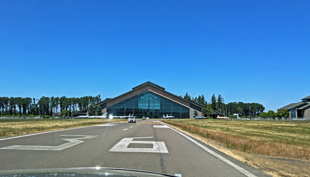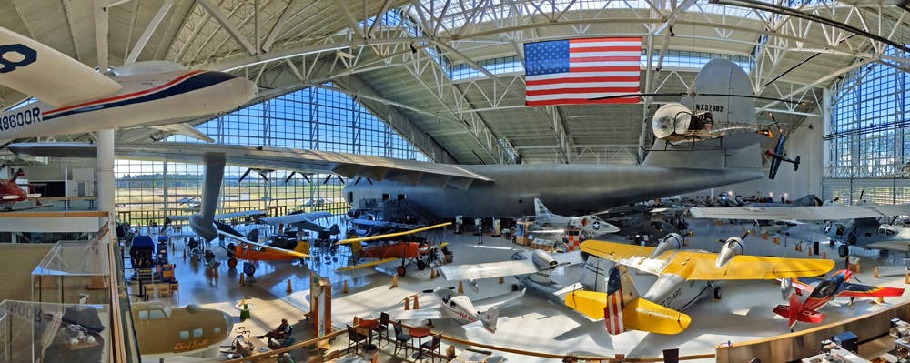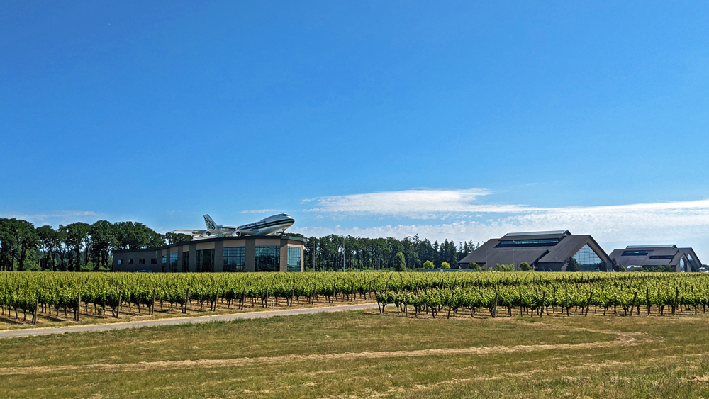 Am nächsten Tag verabschieden wir uns für längere Zeit vom Pazifik. Über einen Hügelzug gelangen wir ins nächste, landwirtschaftlich genutzte Tal. Sobald wir im Landesinneren sind, steigt das Thermometer auf 27 °C. Heute fahren wir nicht weit, nur bis kurz nach McMinnville OR, wo wir das Evergreen Aviation & Space Museum besichtigen wollen. Das Museum wurde von Delford M. Smith, dem Gründer der Evergreen Aviation gegründet und beherbergt als Highlight Howard Hughes’ riesiges H-4 Hercules, das grösste Flugboot, das je gebaut wurde. Da Hughes aufgrund des 2. Weltkrieges kein Metall für die Hülle brauchen durfte, baute er es kurzerhand aus Duramold, einem Birken-Laminat, was dem Flugzeug den Spitznamen «Spruce Goose» («Föhren-Gans») eingebracht hat. Das Flugboot hat nur einmal für kurze Zeit abgehoben (ob es sich um einen «echten Flug» gehandelt hat, ist noch heute umstritten) und wurde danach von Hughes 29 Jahre bis zu seinem Tod 1976 in einem eigenen, klimatisierten Hangar flugfähig unterhalten. Nachdem es über 10 Jahre in einem eigens gebauten «Dome» in Long Beach CA ausgestellt gewesen war, hat es 1991 Evergreen Aviation für sein Museum erhalten, weil sie die einzigen waren, die es noch im Ganzen ausstellen konnten (sie haben das Museum sozusagen drum rum gebaut). Mittlerweile gehört das Museum einer Winery, die den Grossteil des Geländes als Rebberg nutzt.